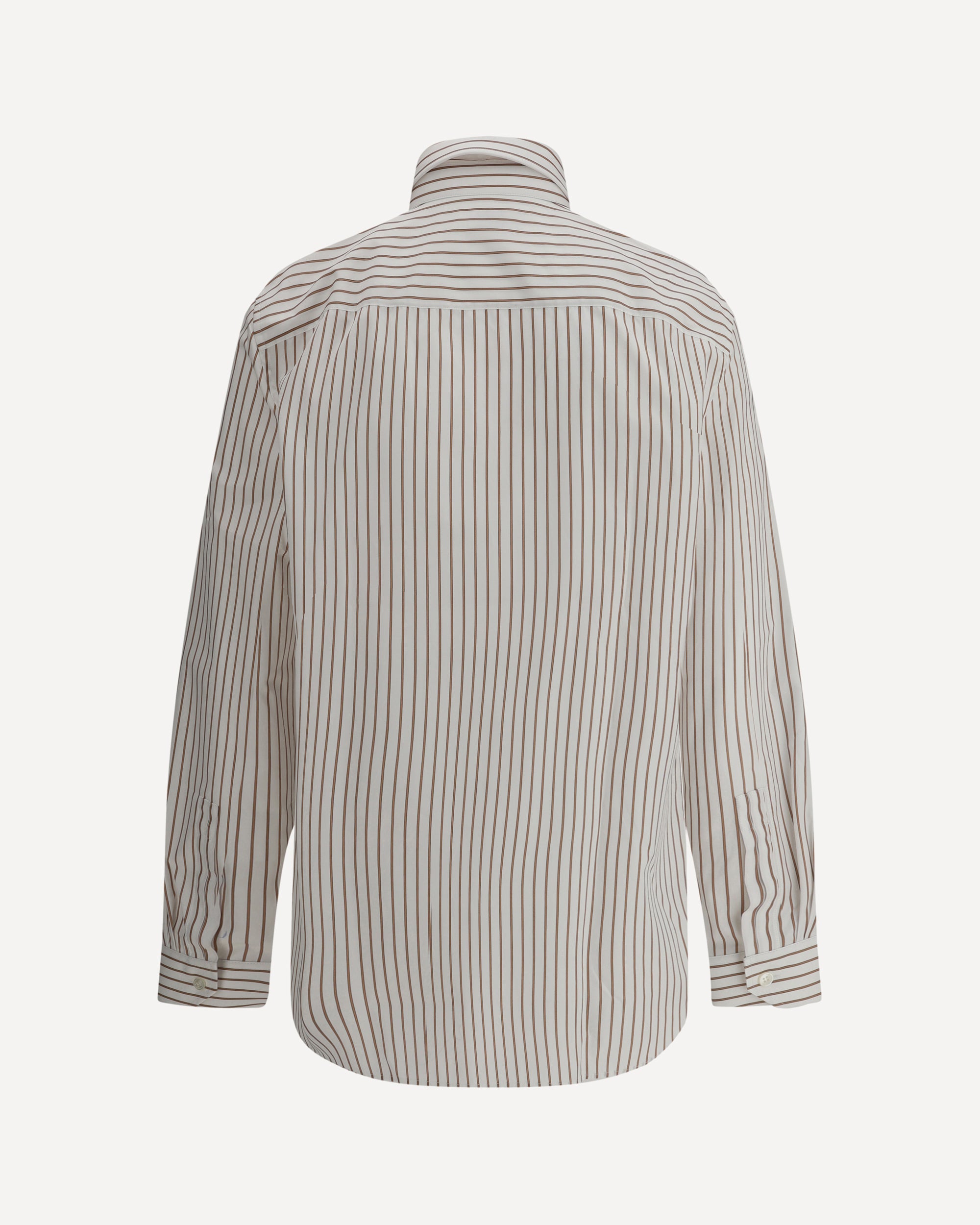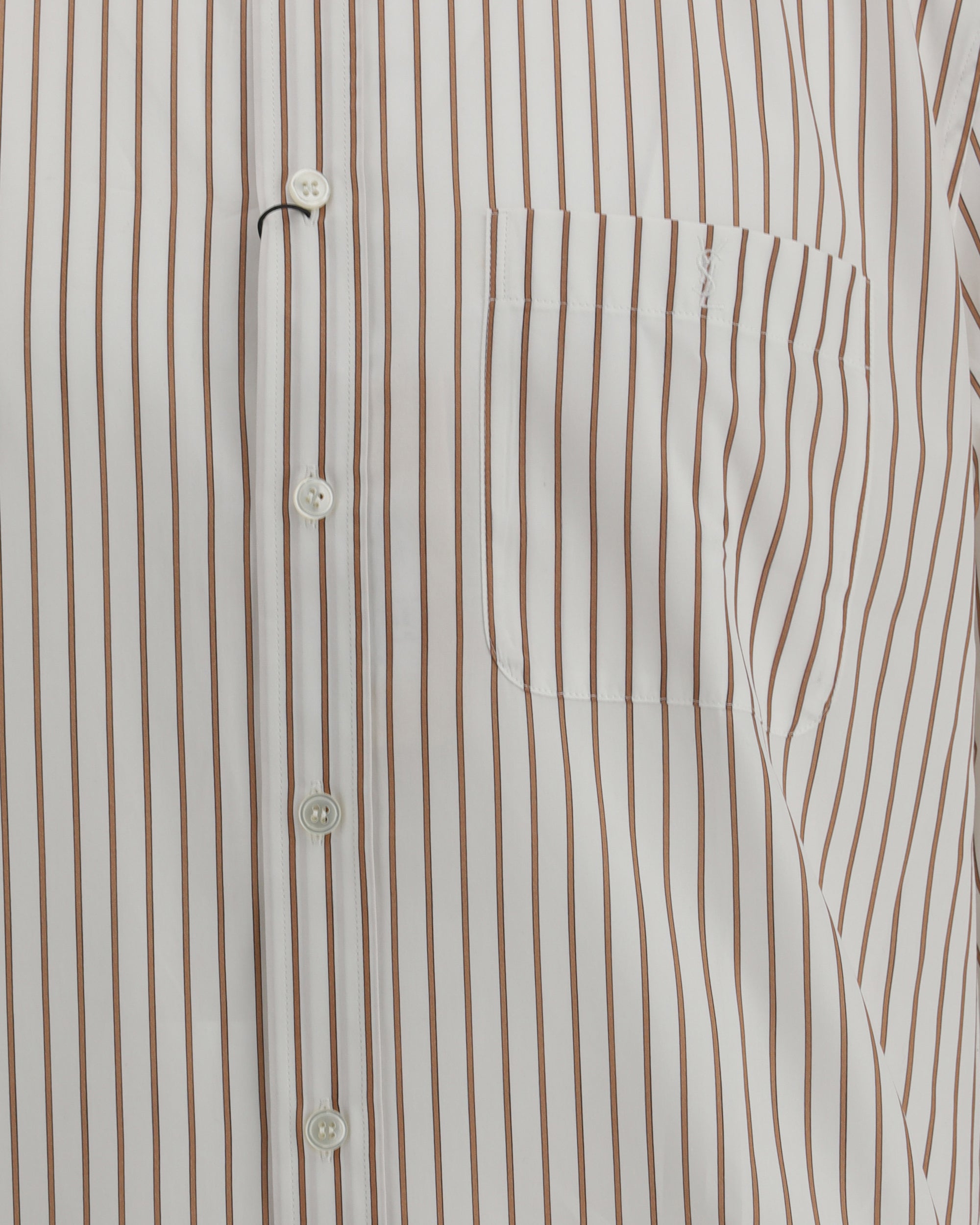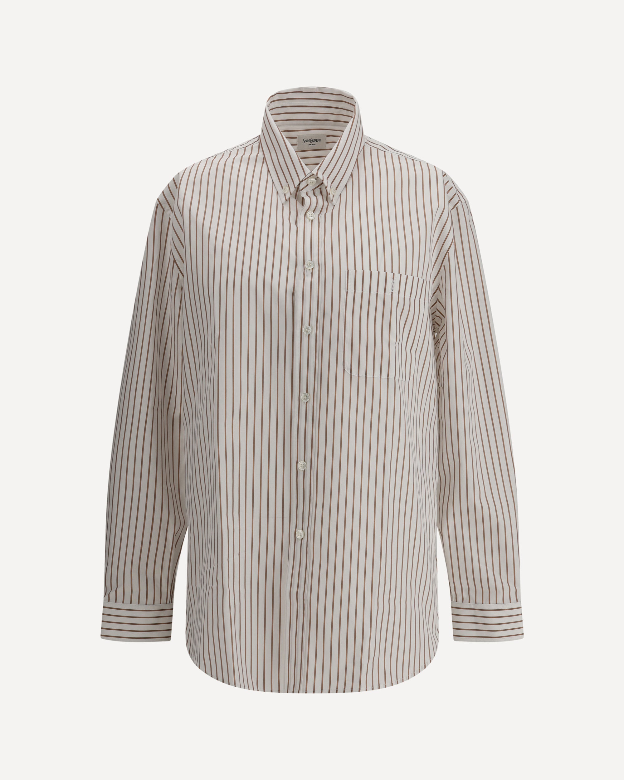 La Camicia in cotone a righe di Saint Laurent unisce eleganza classica e dettagli iconici. Realizzata in puro cotone, presenta un colletto tradizionale, chiusura frontale con bottoni e polsini regolabili con bottoncino per una vestibilità su misura. Il motivo a righe verticali dona slancio alla silhouette, mentre la tasca a filetto applicata sul petto è impreziosita dal ricamo del leggendario logo YSL, discreto ma riconoscibile.