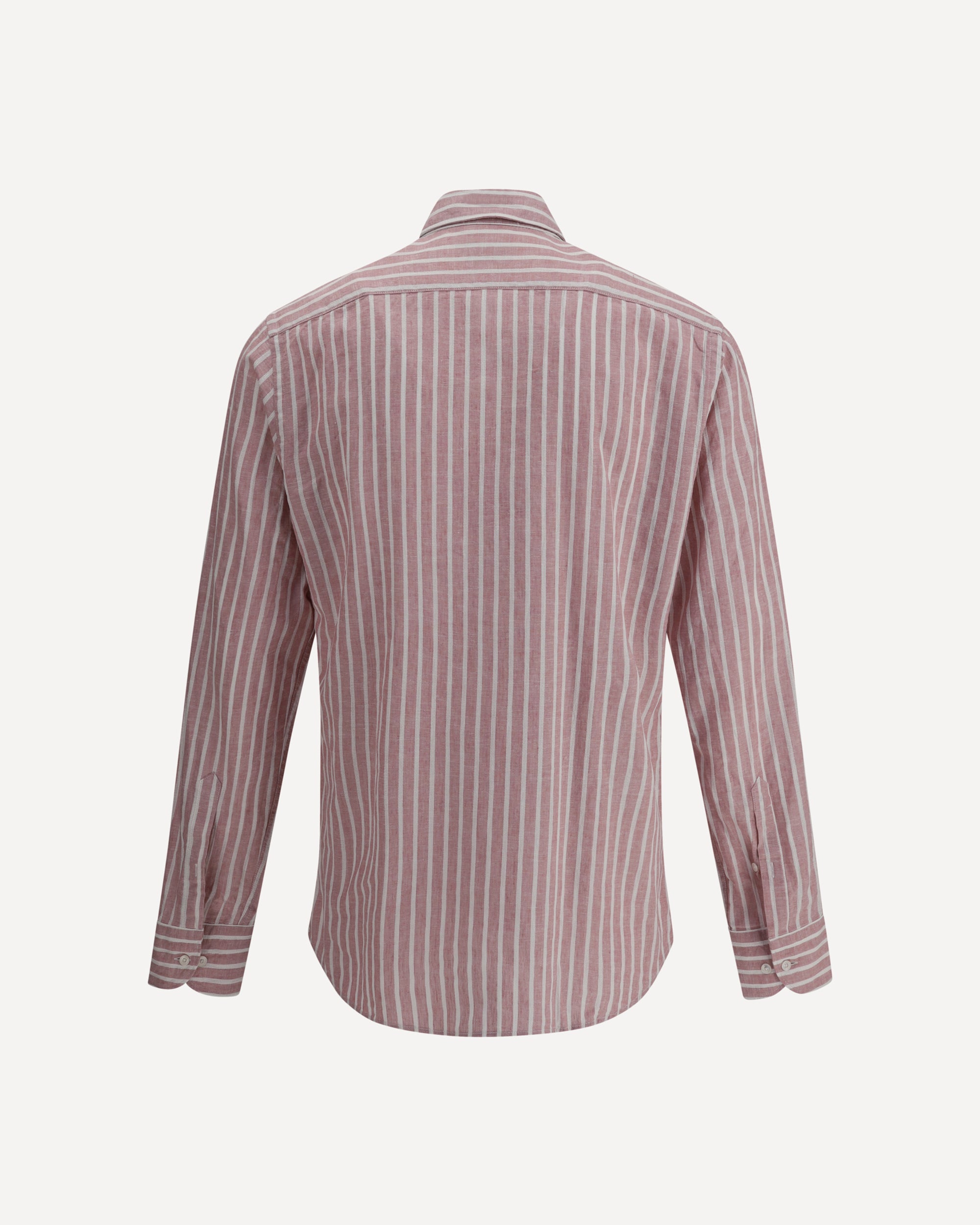 La Camicia in cotone e lino a righe di Brooksfield unisce leggerezza e stile in un capo ideale per la stagione calda. Caratterizzata da un colletto classico, chiusura frontale con bottoni e polsini regolabili con bottoncini, è realizzata in un blend naturale di cotone e lino che garantisce traspirabilità e comfort. La fantasia a righe aggiunge un tocco di eleganza informale, perfetta per look sia casual che raffinati.