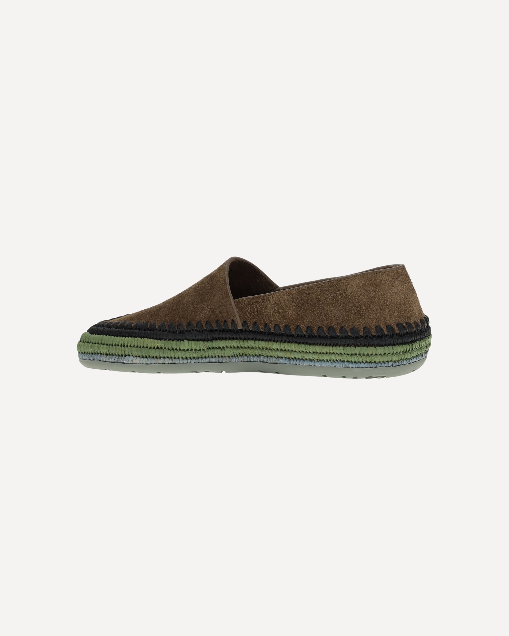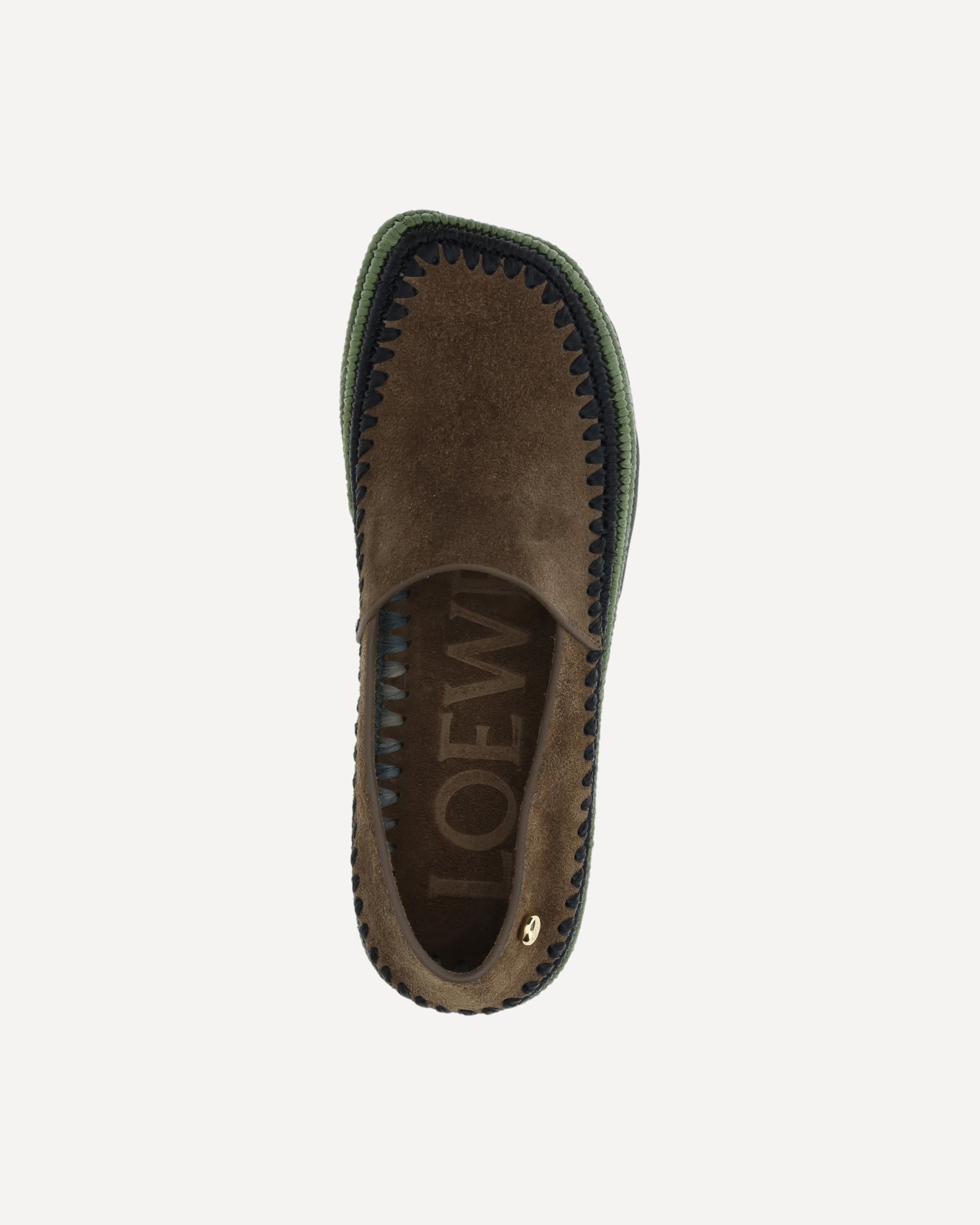 Le Espadrillas in pelle scamosciata di Loewe, parte della collezione Paula's Ibiza, sono un vero capolavoro di artigianalità e design. Caratterizzate da un ricamo in rafia realizzato a mano e dall'emblematica punta a forma di petalo, presentano il motivo Anagram Pebble sul lato, simbolo distintivo del brand. La soletta extra imbottita garantisce comfort, mentre la suola in gomma con motivo Anagram goffrato aggiunge un tocco unico e raffinato a queste espadrillas dal carattere estivo e sofisticato.