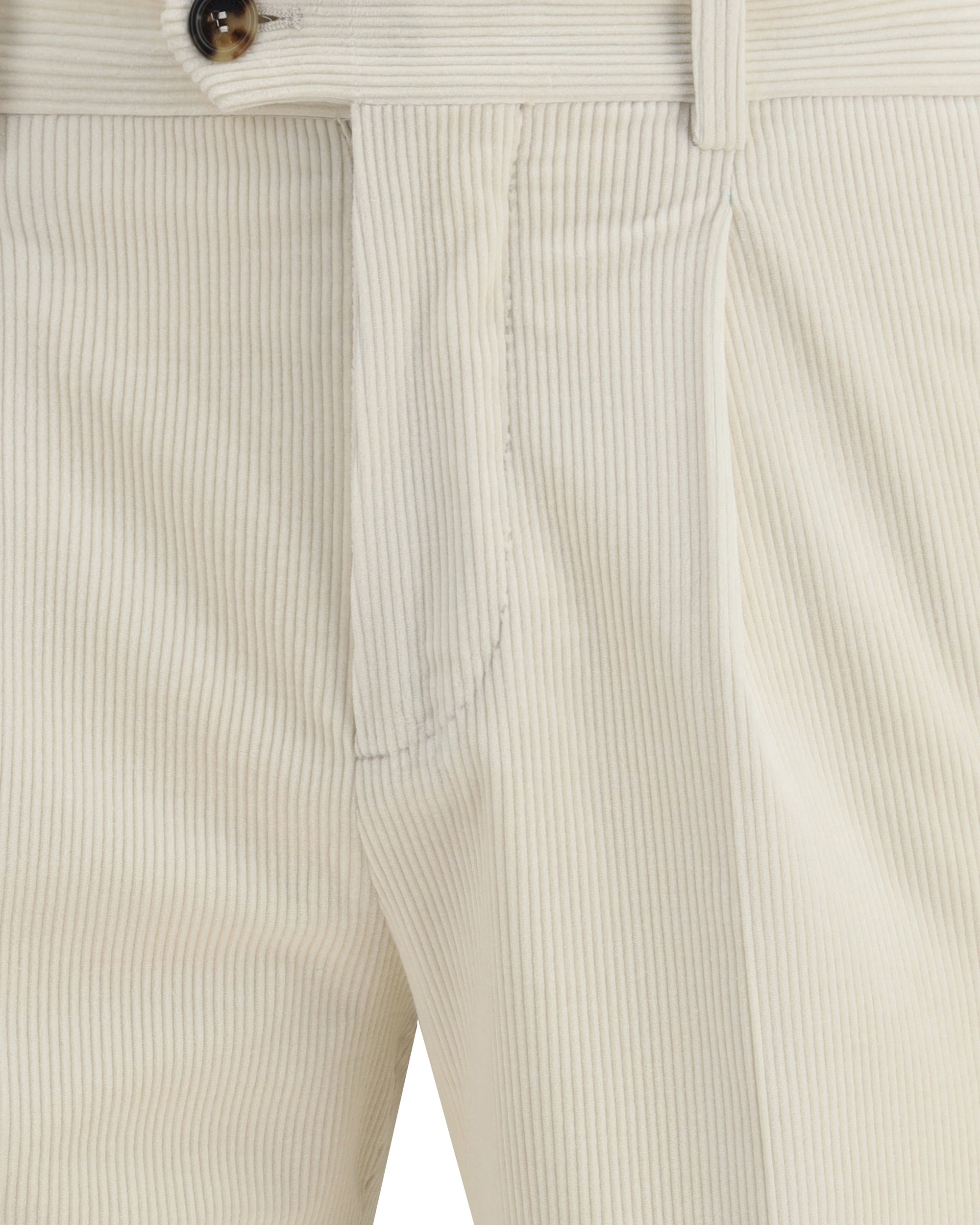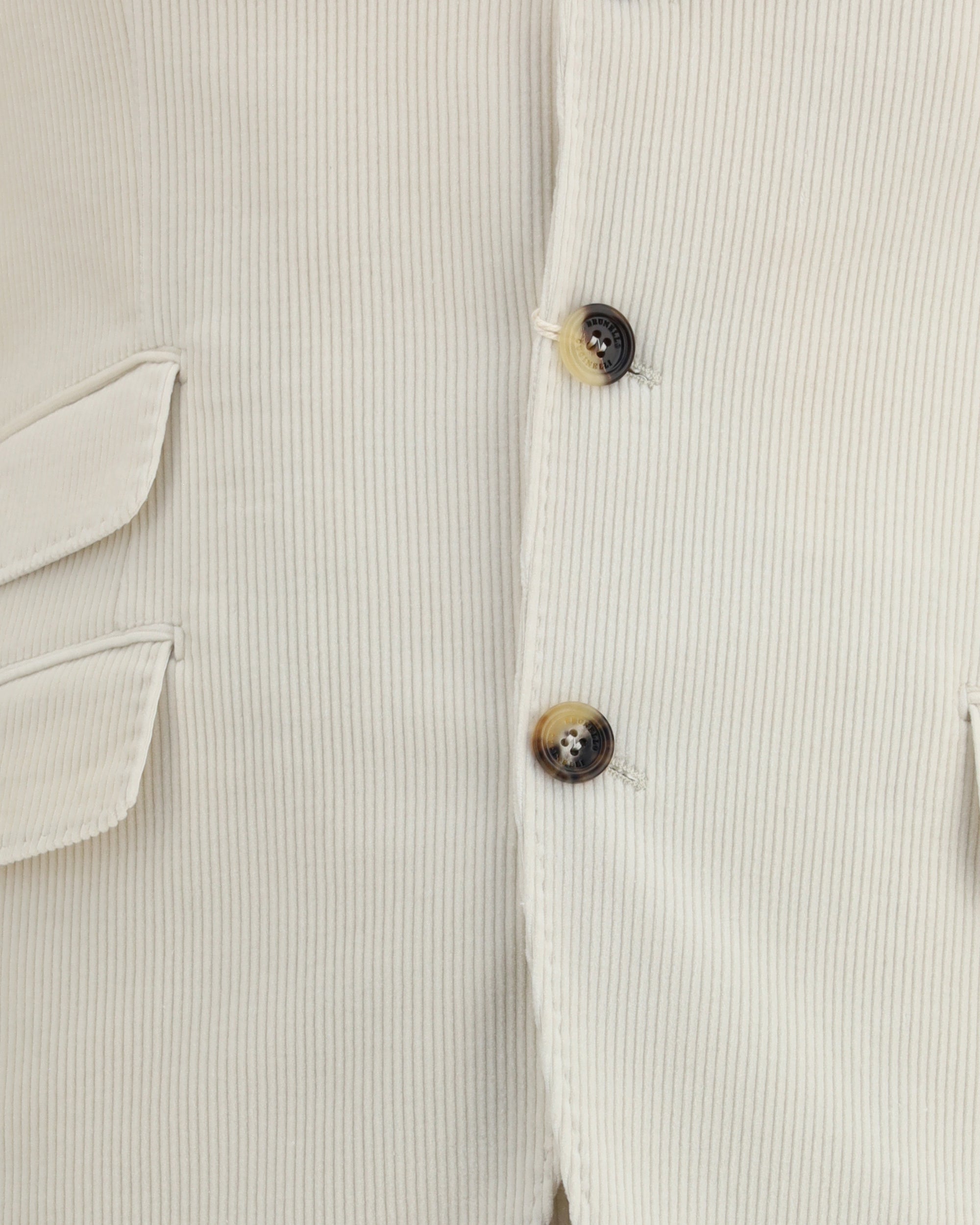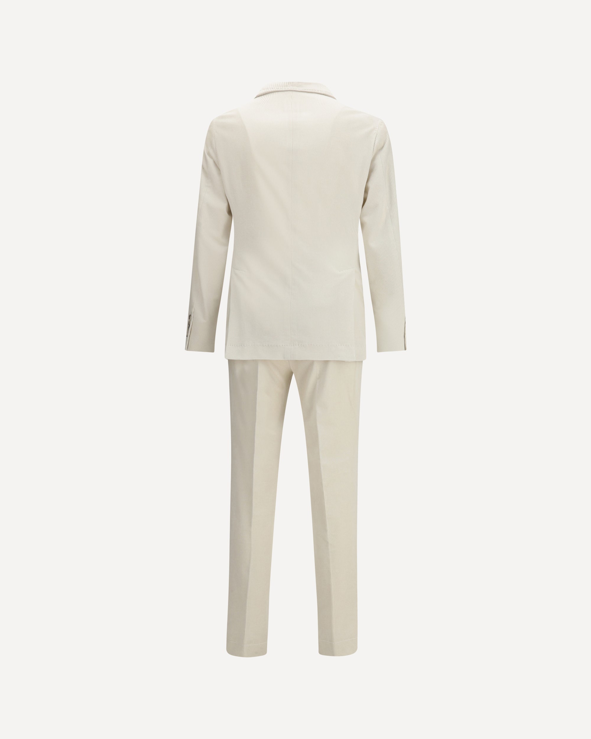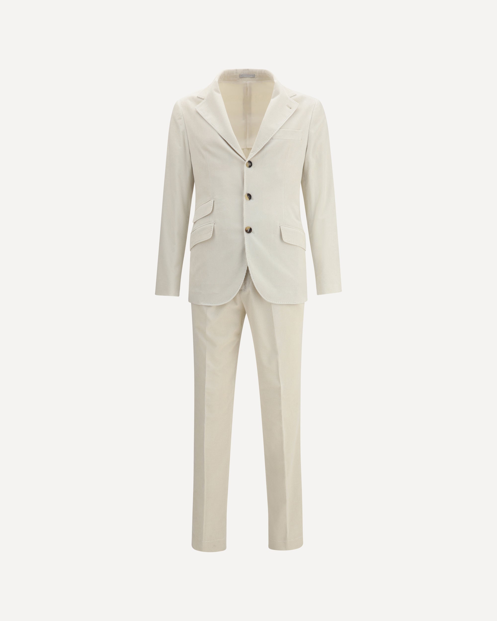 Abito completo in cotone di Brunello Cucinelli elegante e sofisticato, perfetto per un look formale o raffinato. La giacca blazer in velluto a costine presenta una chiusura frontale con bottoni, tre tasche a filetto con patta sul fronte e un taschino a fessura sul petto, completata da un rever classico per un tocco di distinzione. I pantaloni coordinati, realizzati anch’essi in cotone, sono dotati di chiusura con cerniera e bottone, due tasche all’americana laterali, due tasche a filetto sul retro e passanti per cintura in vita per una vestibilità regolabile. La fantasia monocromo conferisce al completo un'eleganza discreta, rendendolo ideale per occasioni speciali o contesti professionali.
