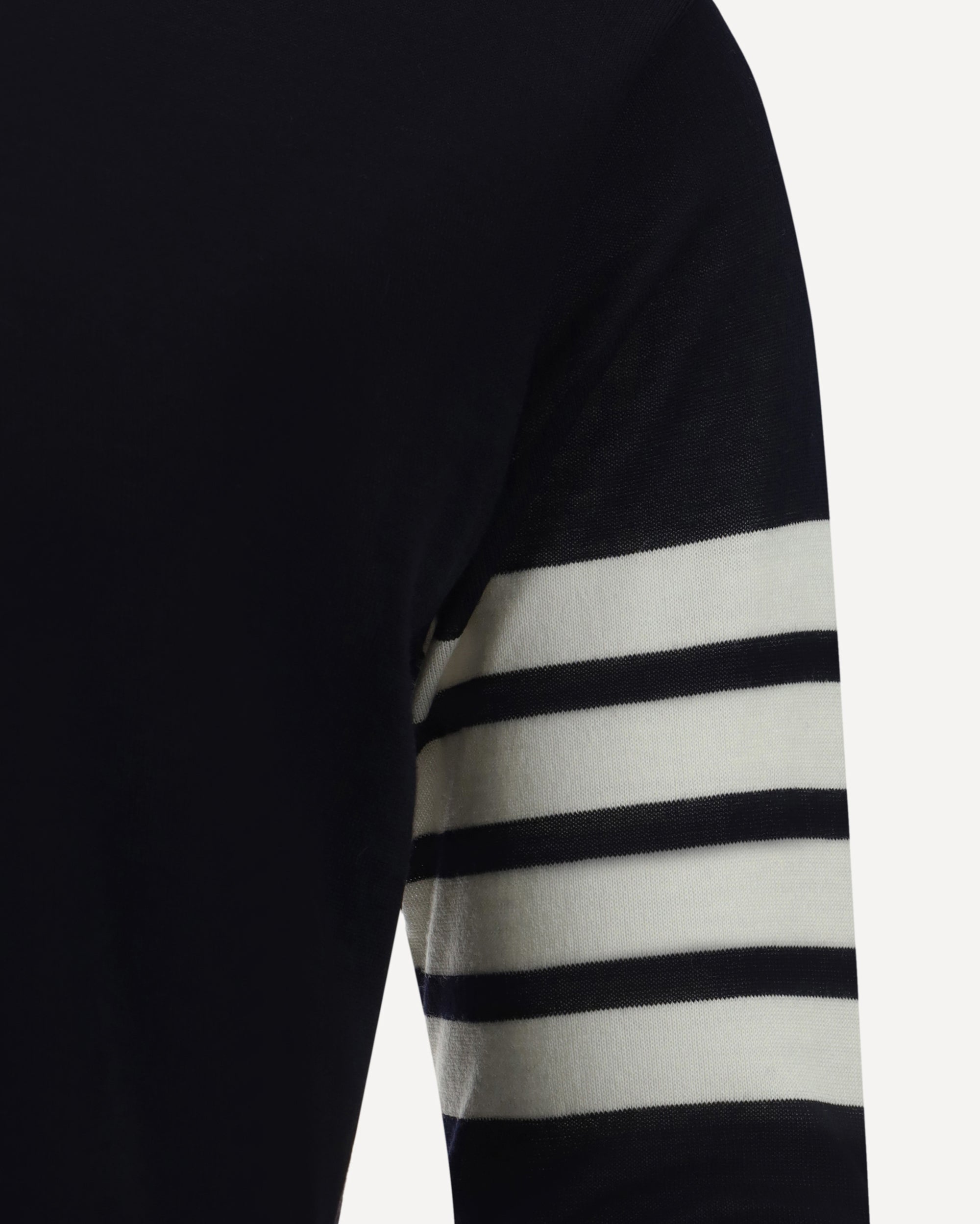 Maglione in Lana Vergine di Thom Browne, girocollo a costine, orlo a costine, polsini a costine, iconiche bande a contrasto del brand sul braccio sinistro, fantasia monocromo, vestibilità regular.