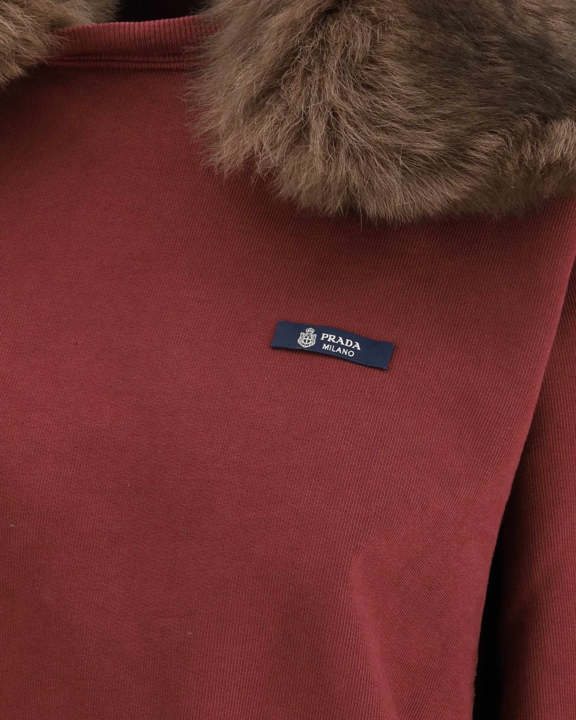 La Felpa di Prada è un modello oversize, caratterizzato da un morbido collo in shearling che aggiunge calore e un tocco di lusso al design essenziale. Realizzata in una silhouette ampia e contemporanea, presenta il logo Prada applicato su un’etichetta posizionata nella parte sinistra del petto, dettaglio distintivo che completa il capo con raffinatezza.