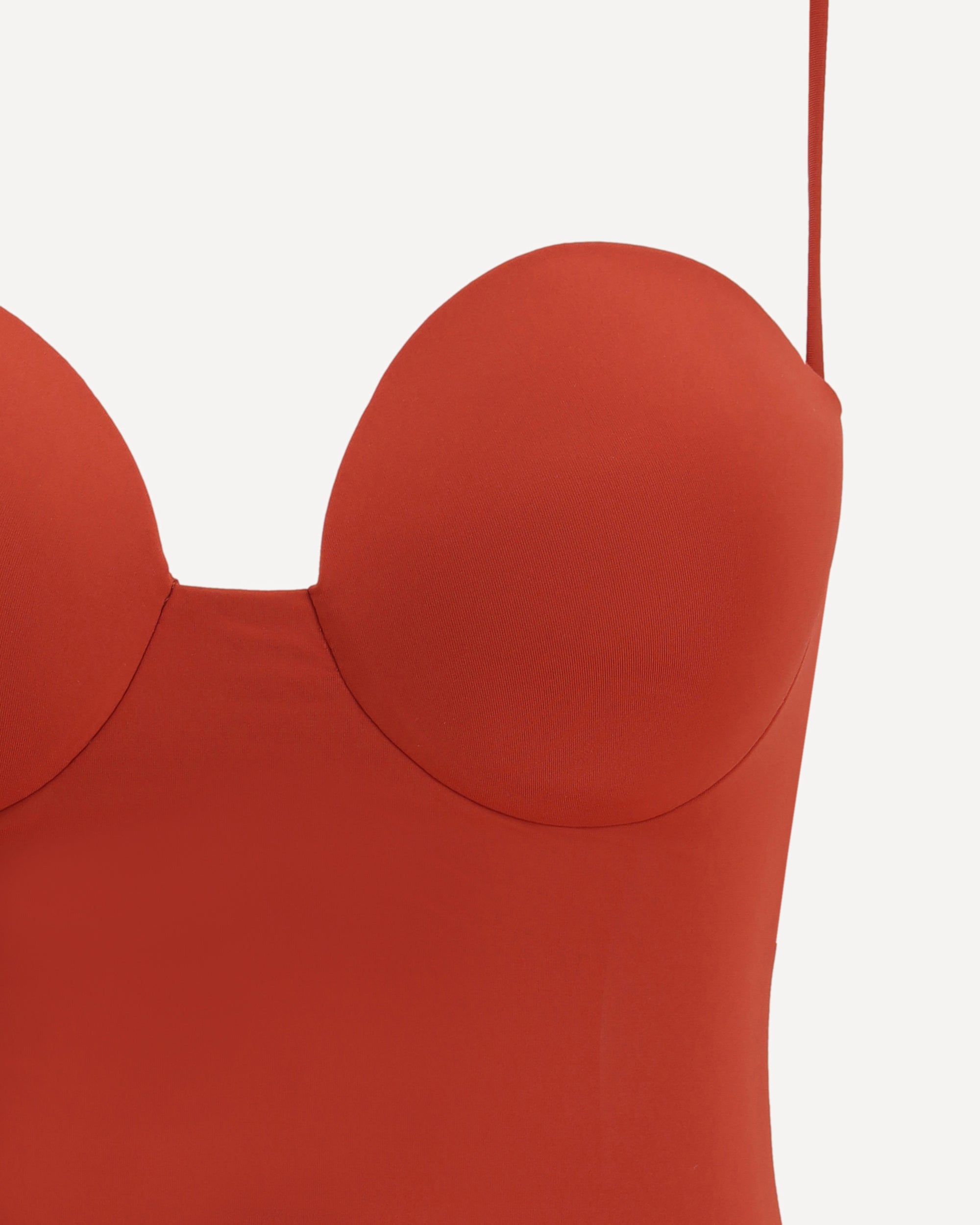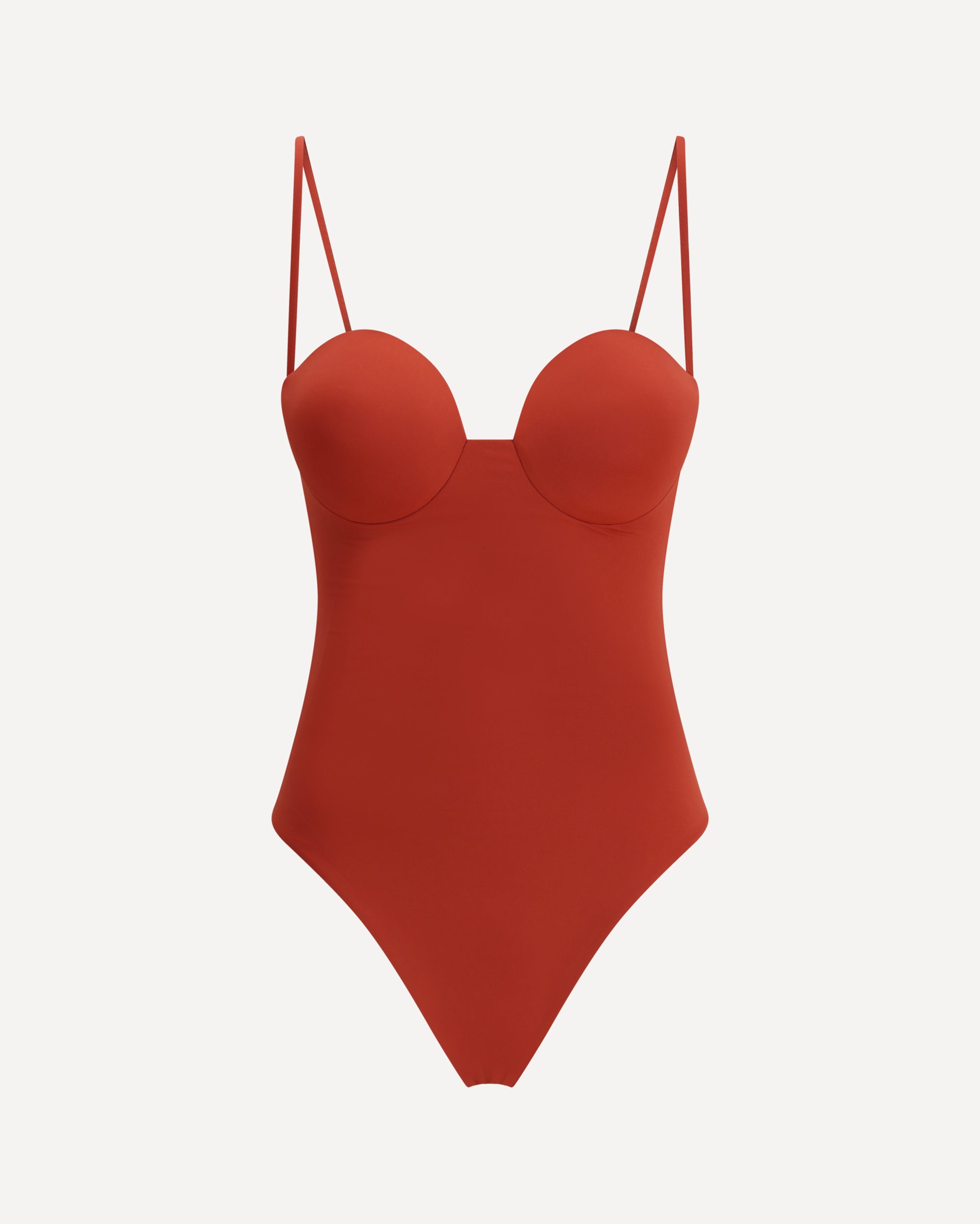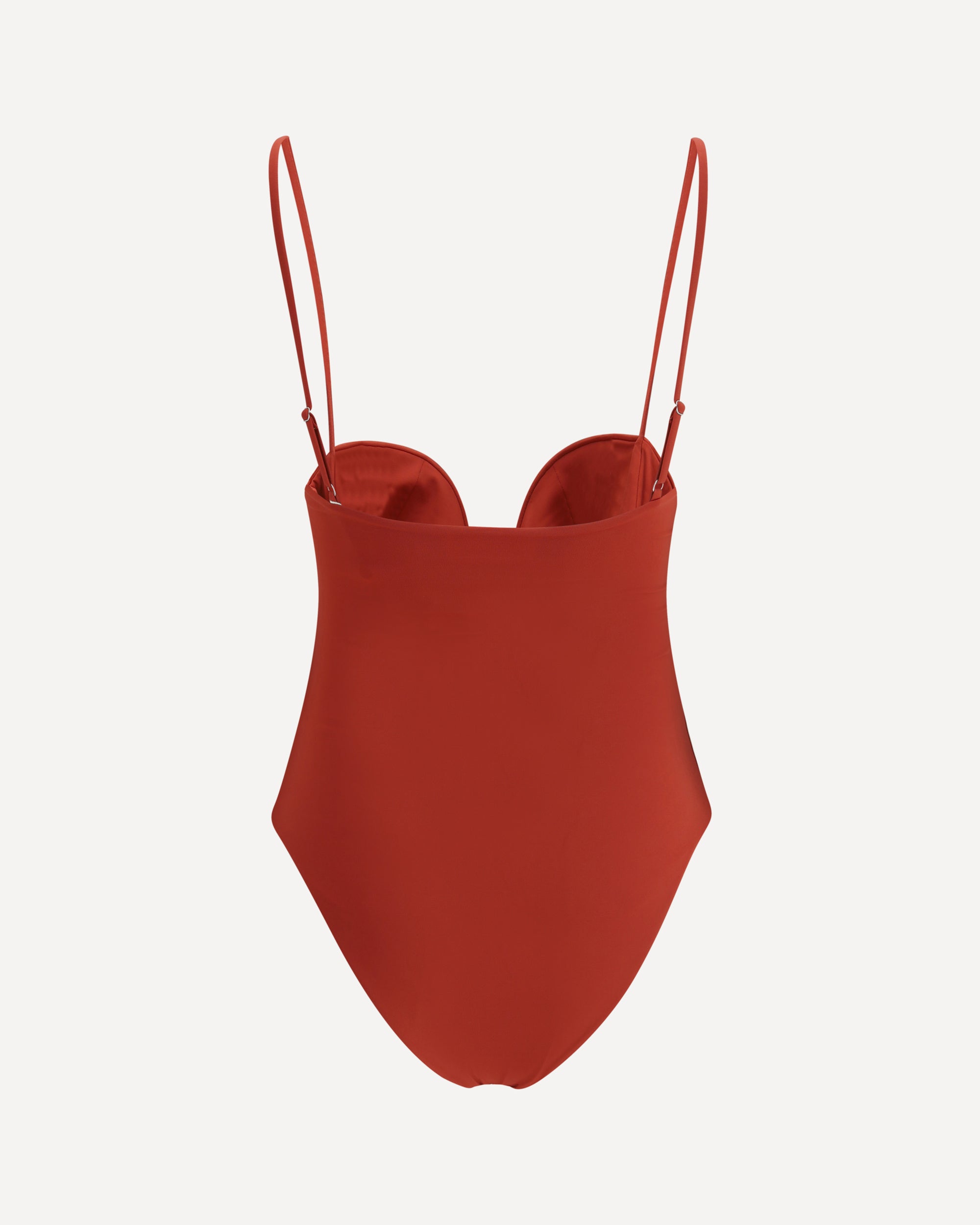 Il Costume da bagno intero di Magda Butrym, parte della sua prima collezione swimwear, è proposto in un sorprendente rosso acceso. Caratterizzato dalla silhouette bustier rétro, esalta le forme con eleganza e femminilità, incarnando alla perfezione l’estetica iconica e raffinata del marchio.