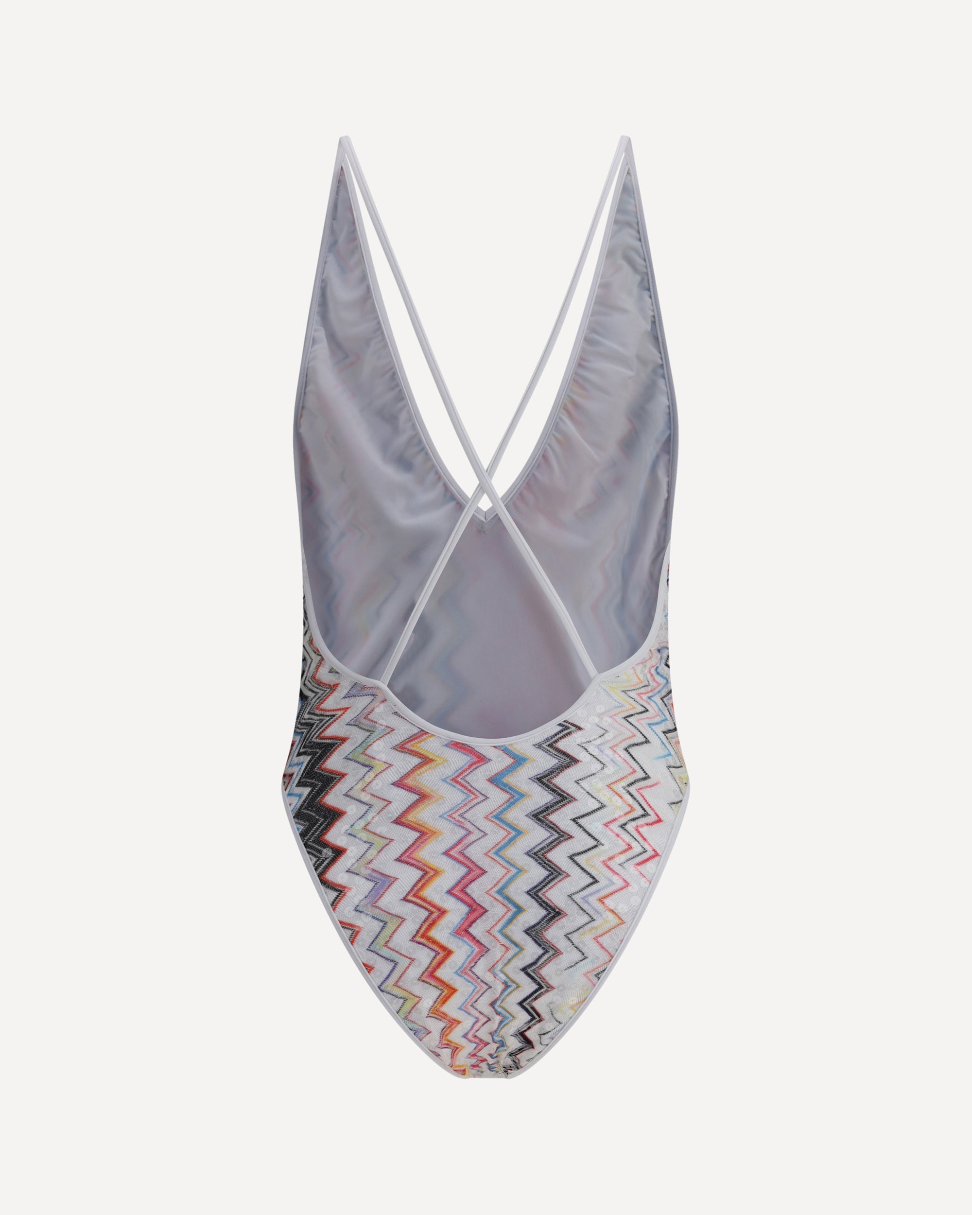 Costume da bagno Missoni modello intero, caratterizzato da spalline sottili incrociate sul retro e una profonda scollatura a V sul davanti. Il design presenta l’iconico motivo zig zag all-over, simbolo distintivo del brand, per un look vivace e raffinato in spiaggia o in piscina.