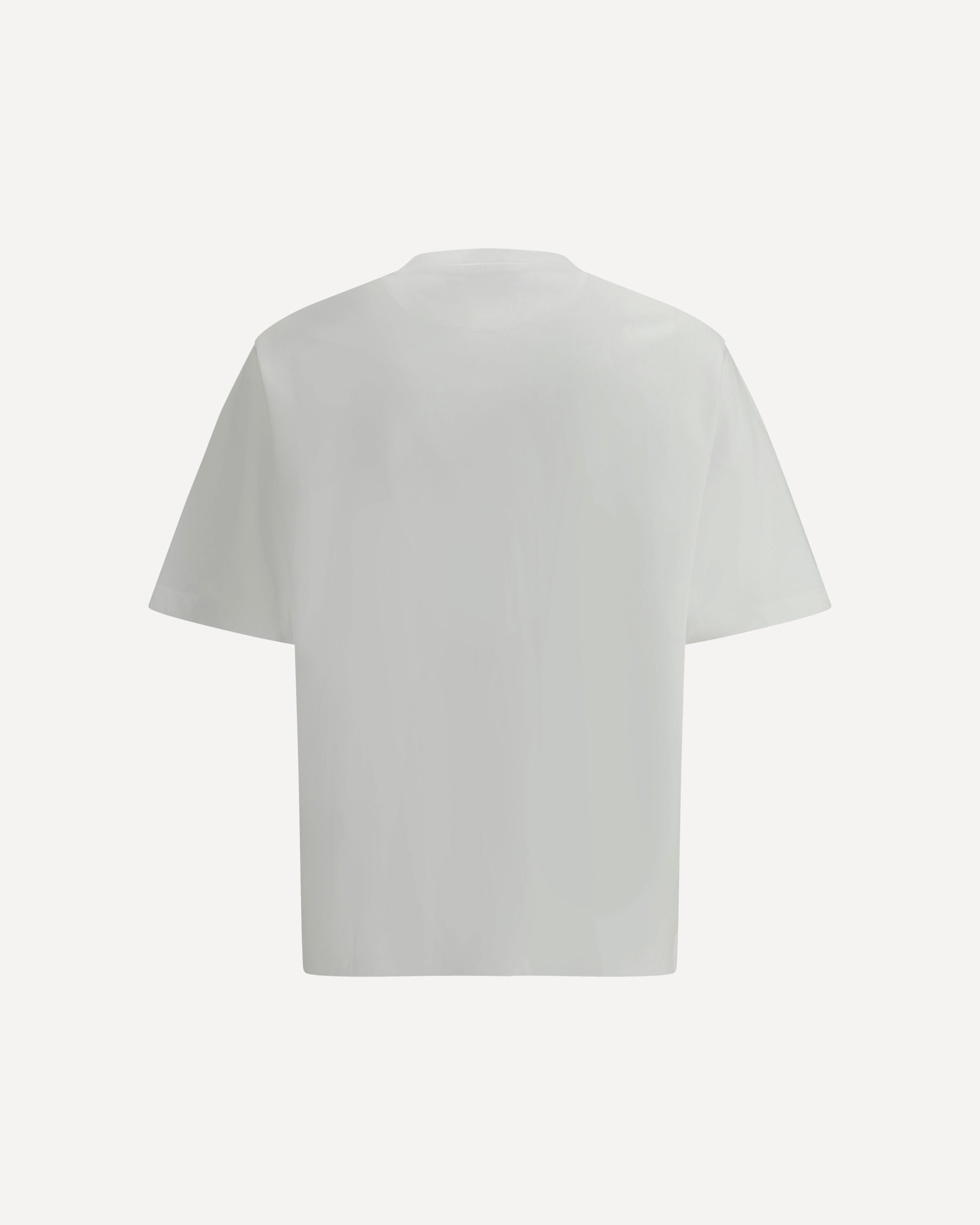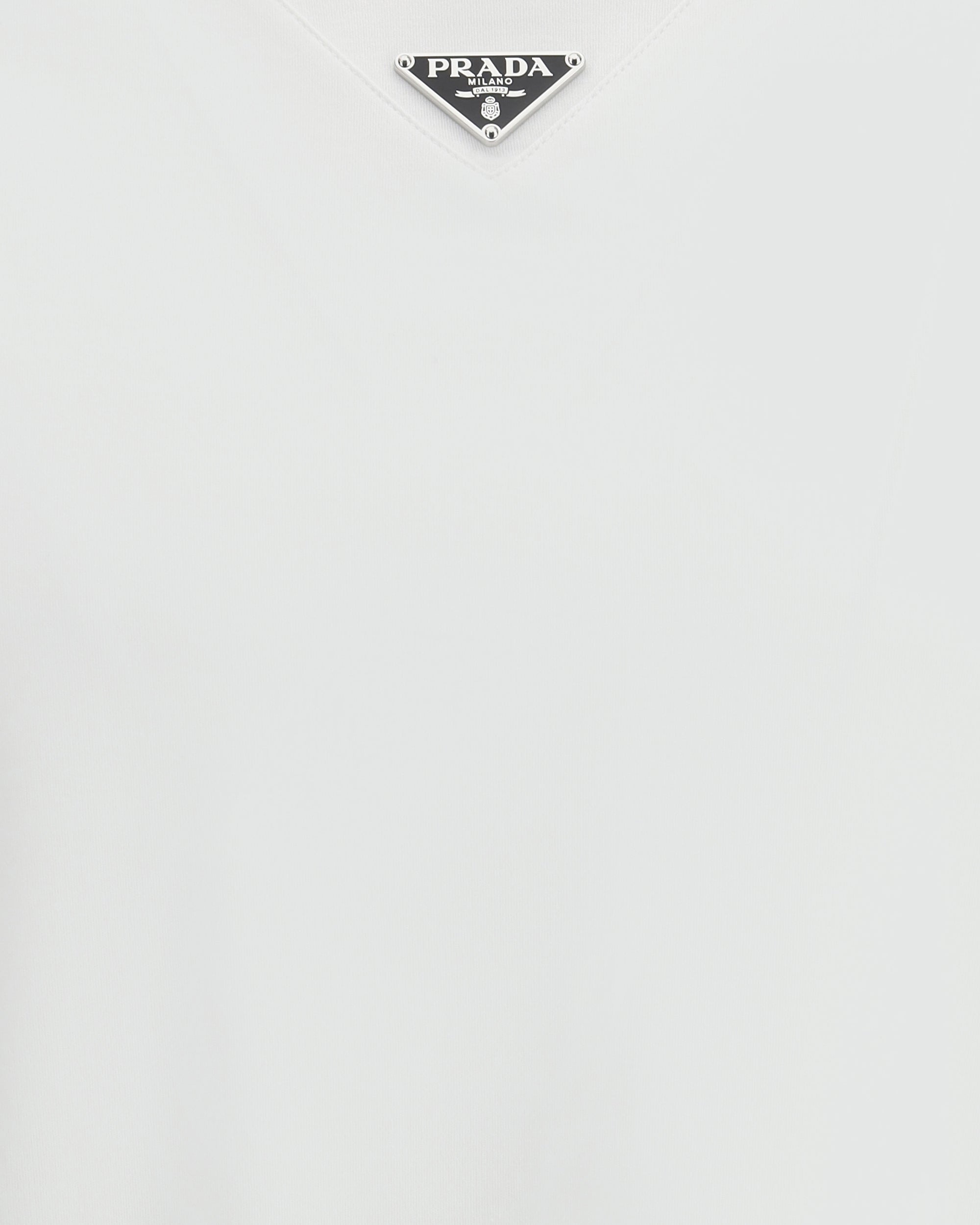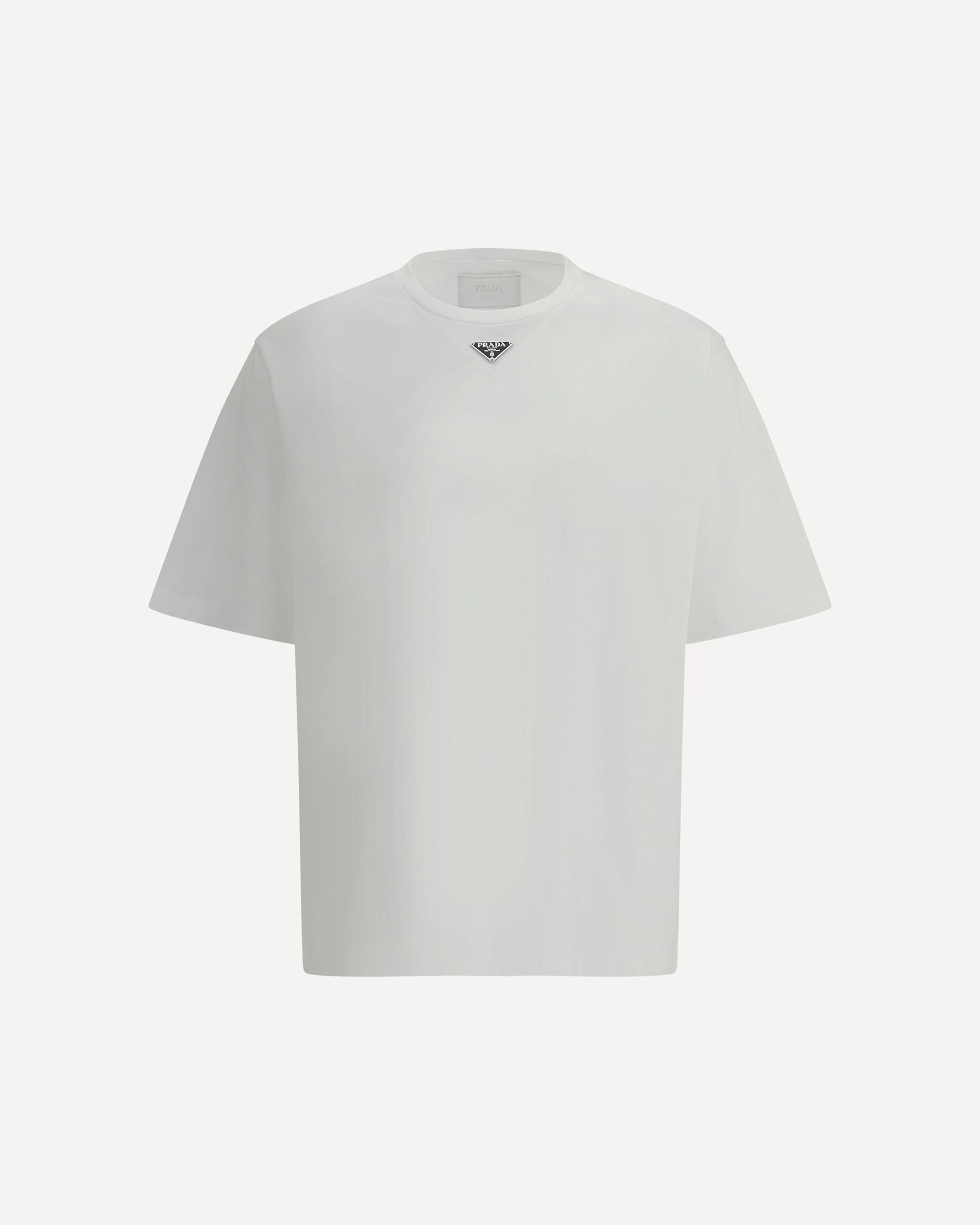 La T-shirt in cotone di Prada presenta un design semplice ma sofisticato. Il girocollo a costine garantisce una vestibilità comoda e classica, mentre la fantasia monocromo mantiene un look pulito e versatile. La placca triangolare con l'iconico monogramma del brand a contrasto applicata sul fronte aggiunge un dettaglio distintivo e riconoscibile, sottolineando l'eleganza del marchio.