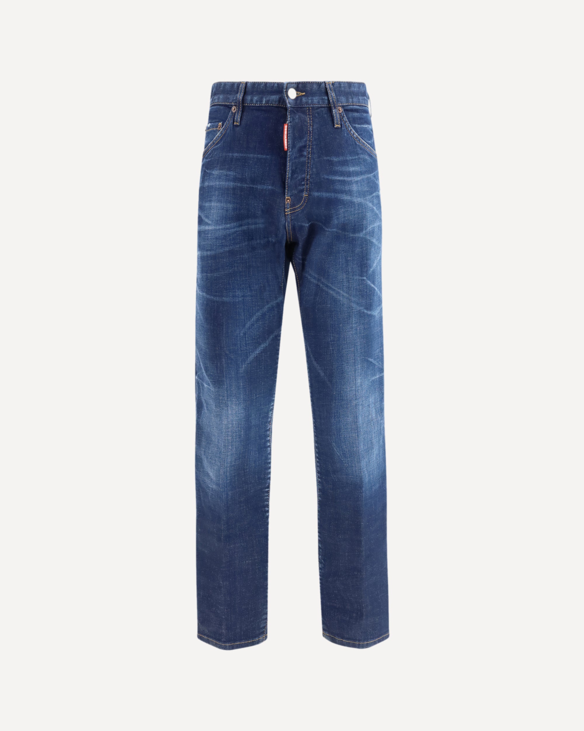 I Jeans Teddy di Dsquared2 sono realizzati in denim di cotone stretch dal lavaggio blu scuro. Presentano una vestibilità slim con gamba dritta e il classico modello a cinque tasche. Il trattamento used con baffature aggiunge un carattere vissuto al capo, completato dall’inconfondibile patch Dsquared2.