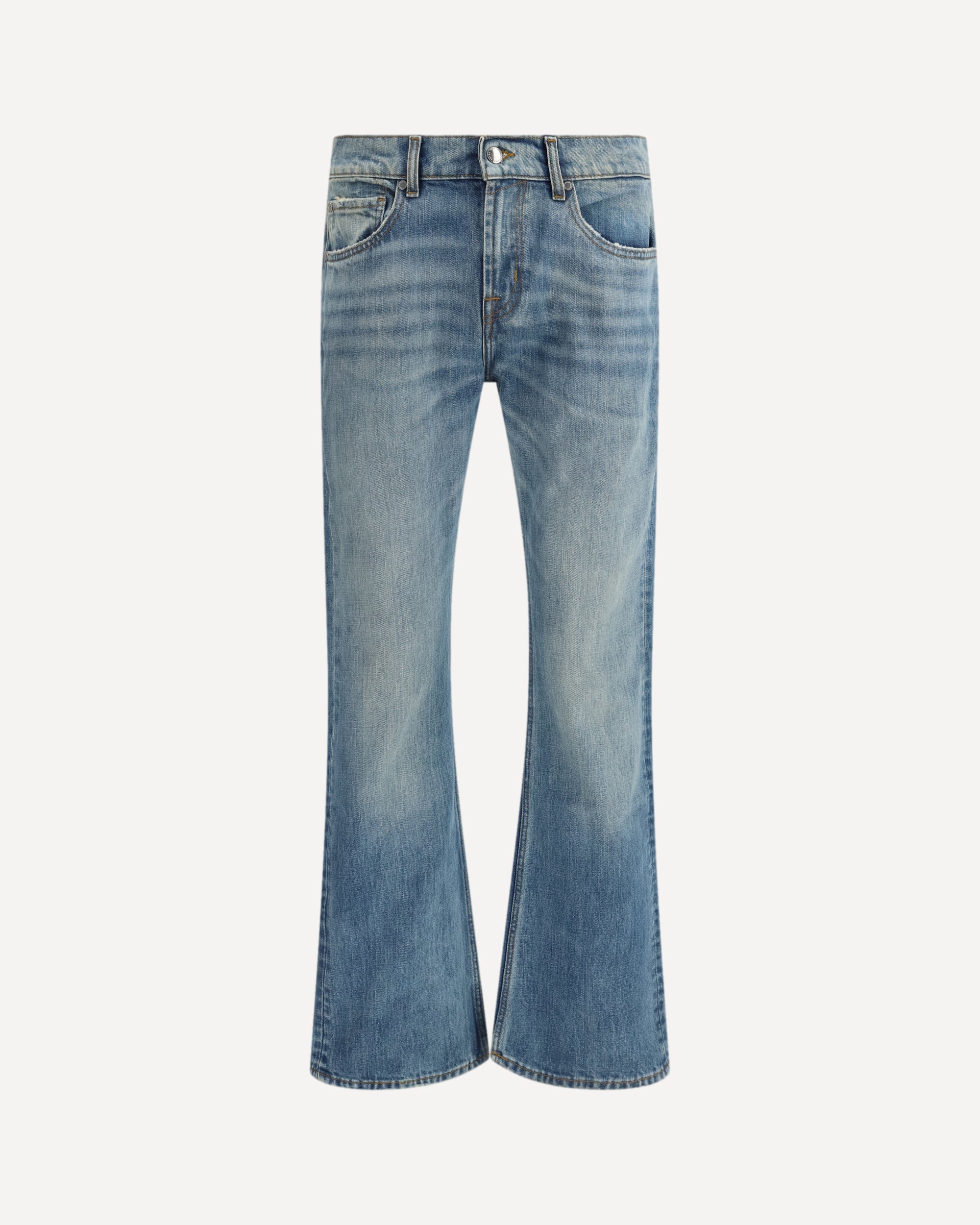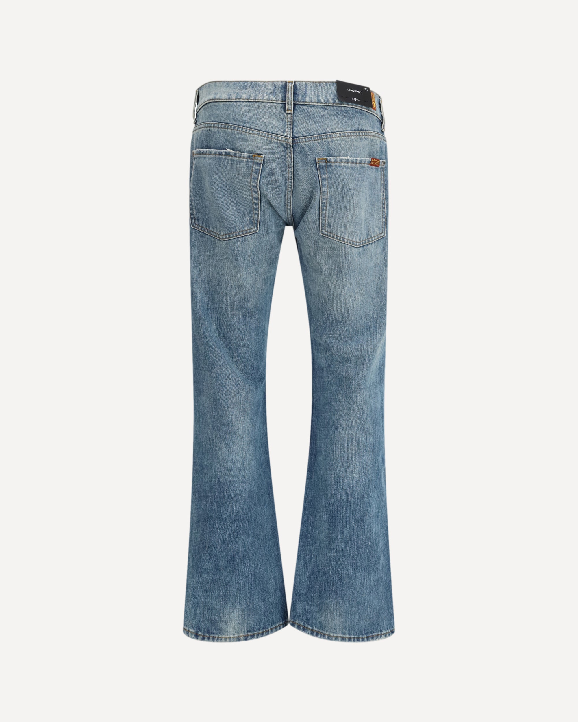 I Jeans Bootcut di 7For rinnovano una silhouette intramontabile grazie alla vita media e al lavaggio chiaro che illumina il denim. Intense baffature e delicate sabbiature lungo le cosce aggiungono profondità e carattere al tessuto. La chiusura classica con cerniera, la linguetta distintiva in vita e la tasca posteriore pulita definiscono un modello femminile, essenziale e dal fascino lievemente rétro.
