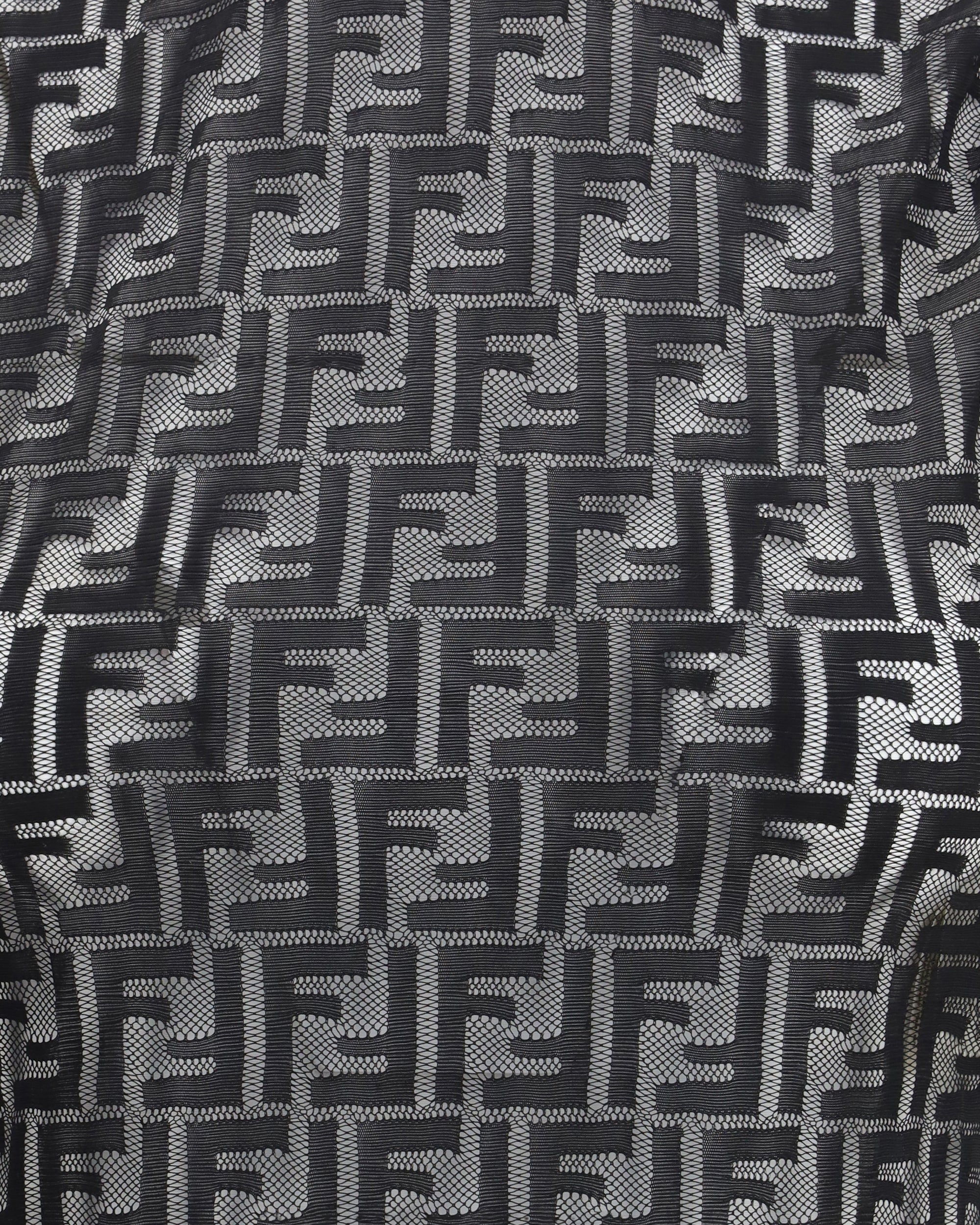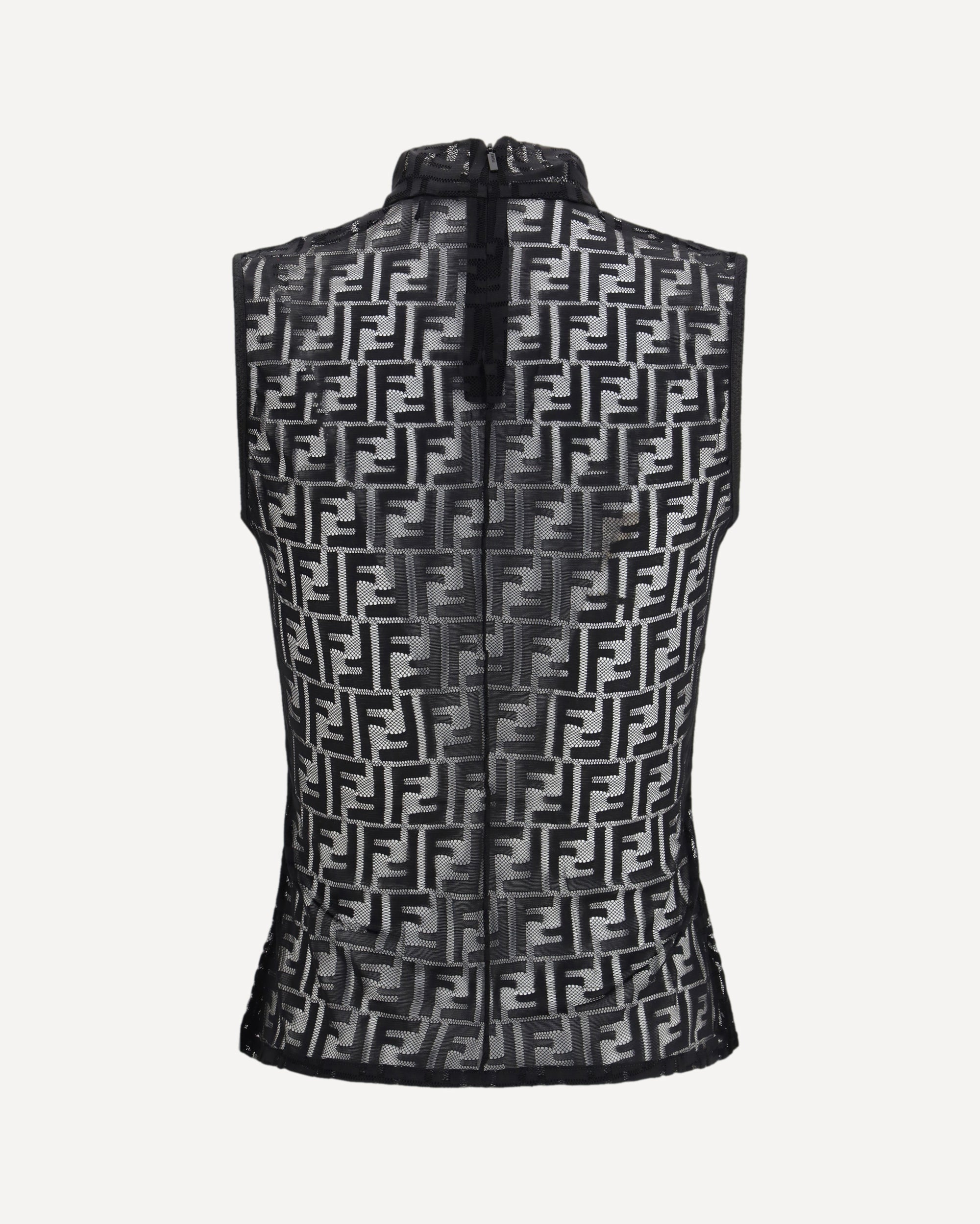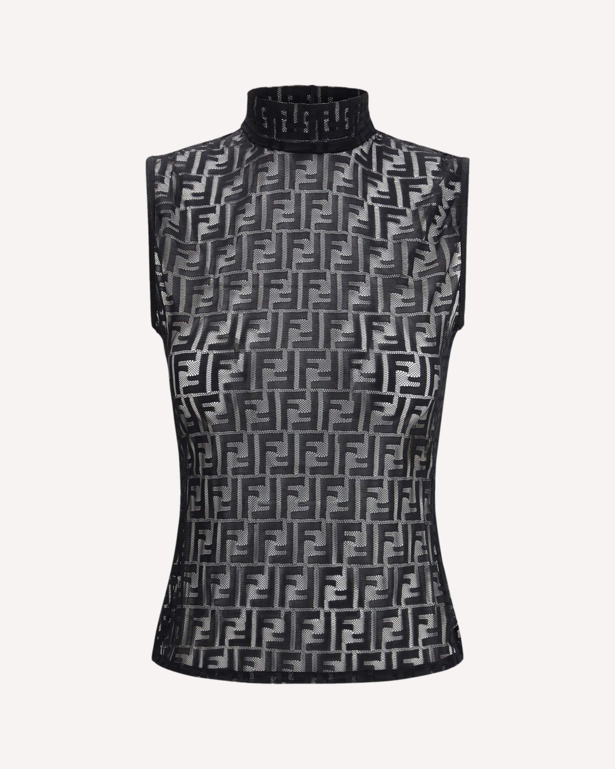 Il Top in pizzo FF presenta un design senza maniche con collo alto e silhouette aderente. Realizzato in jersey di pizzo con l’iconico motivo FF su tutta la superficie, questo capo crea un effetto trasparente sofisticato. La lavorazione “unlined” enfatizza la leggerezza e l’audacia del design, rendendolo un pezzo distintivo e di carattere.