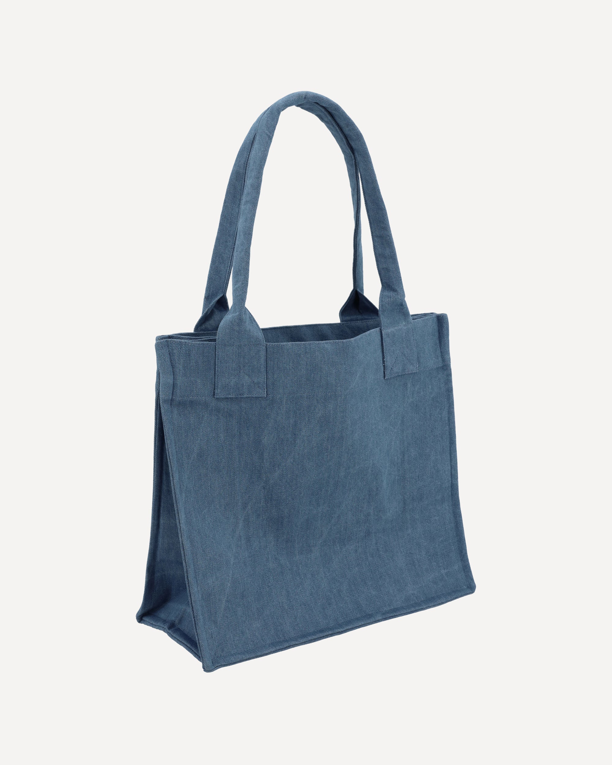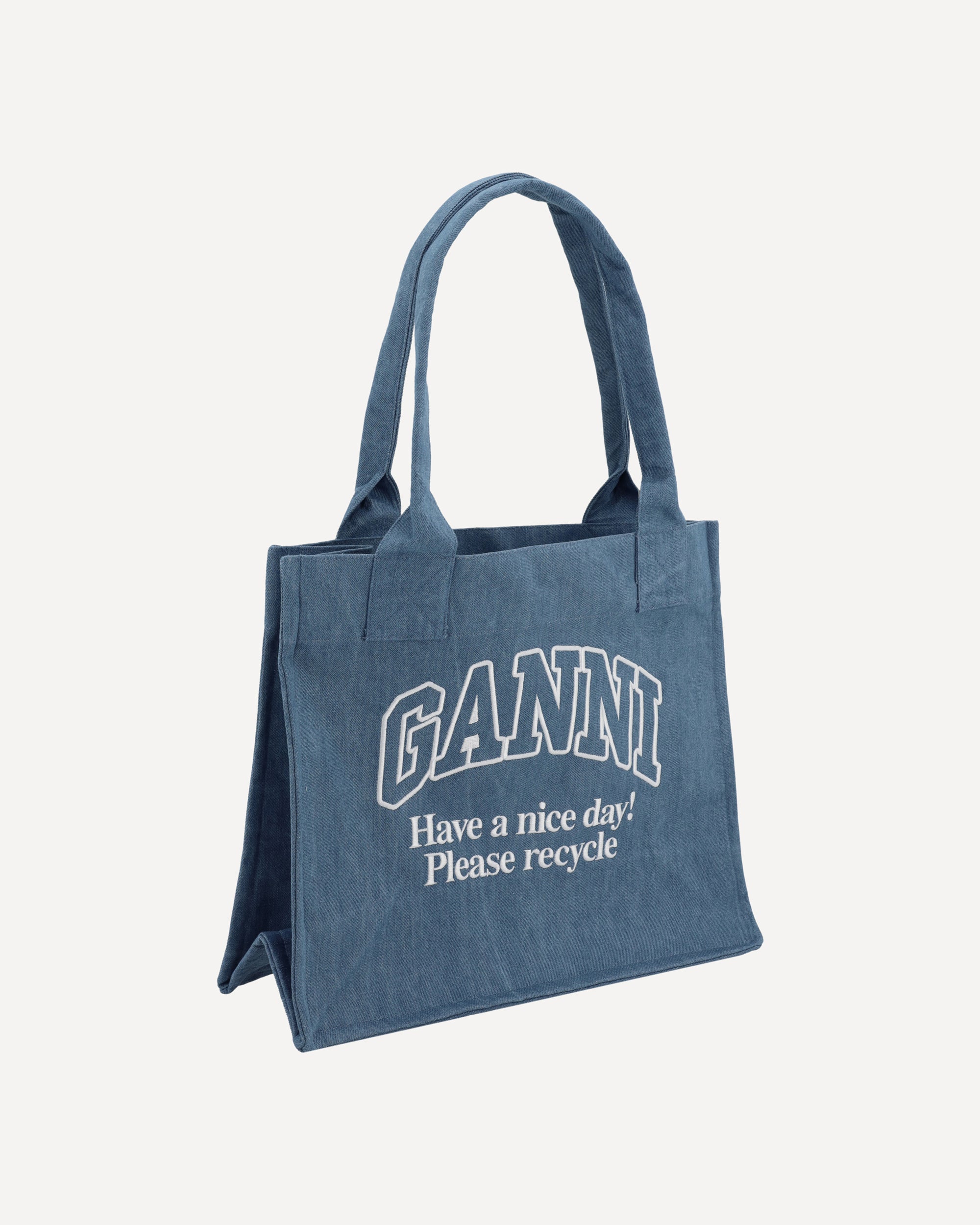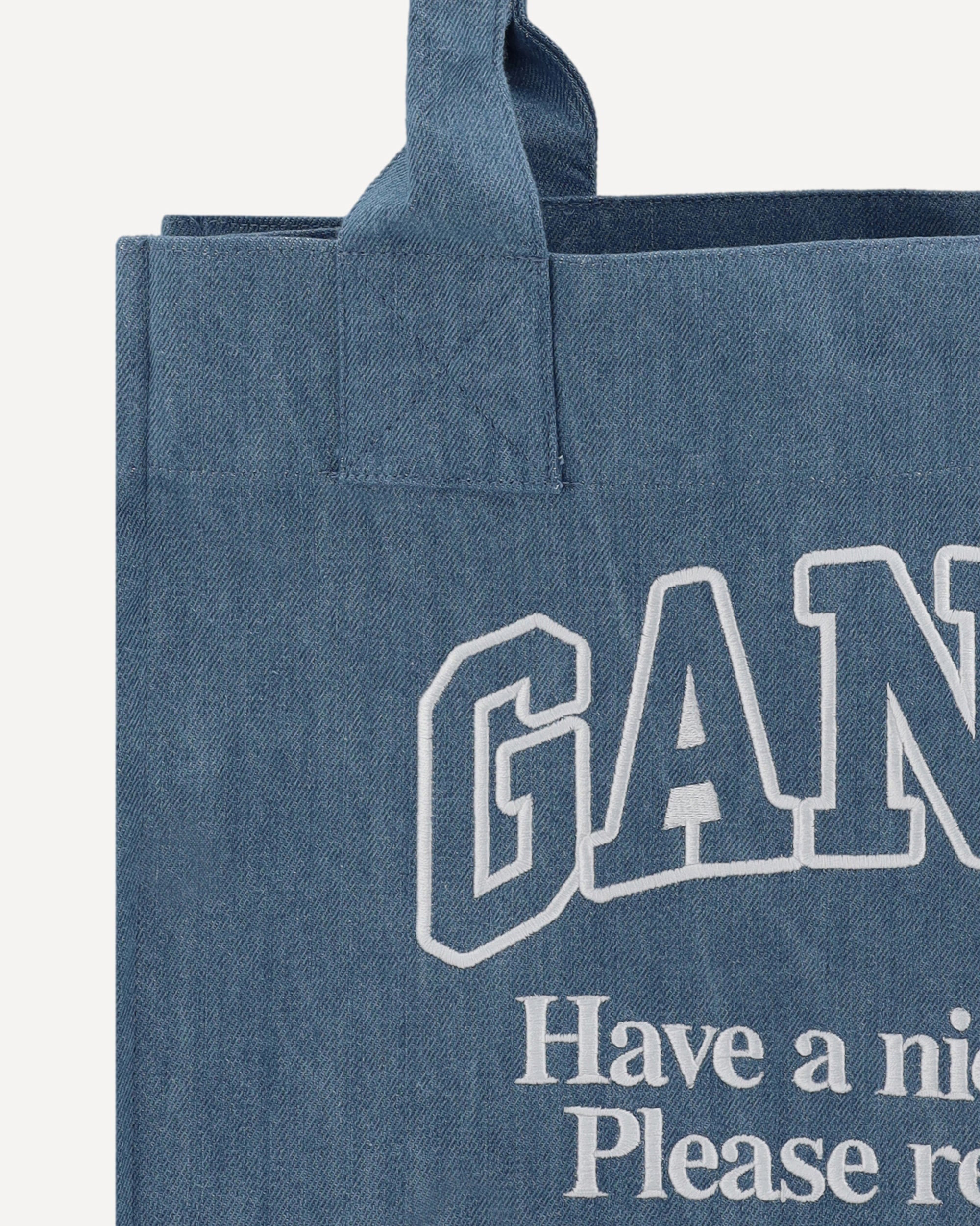 Borsa Tote in Cotone di Ganni, due manici tubolari superiori, stampa con dettaglio iconico monogramma brand a contrasto sul fronte, design in denim, unico scomparto interno.