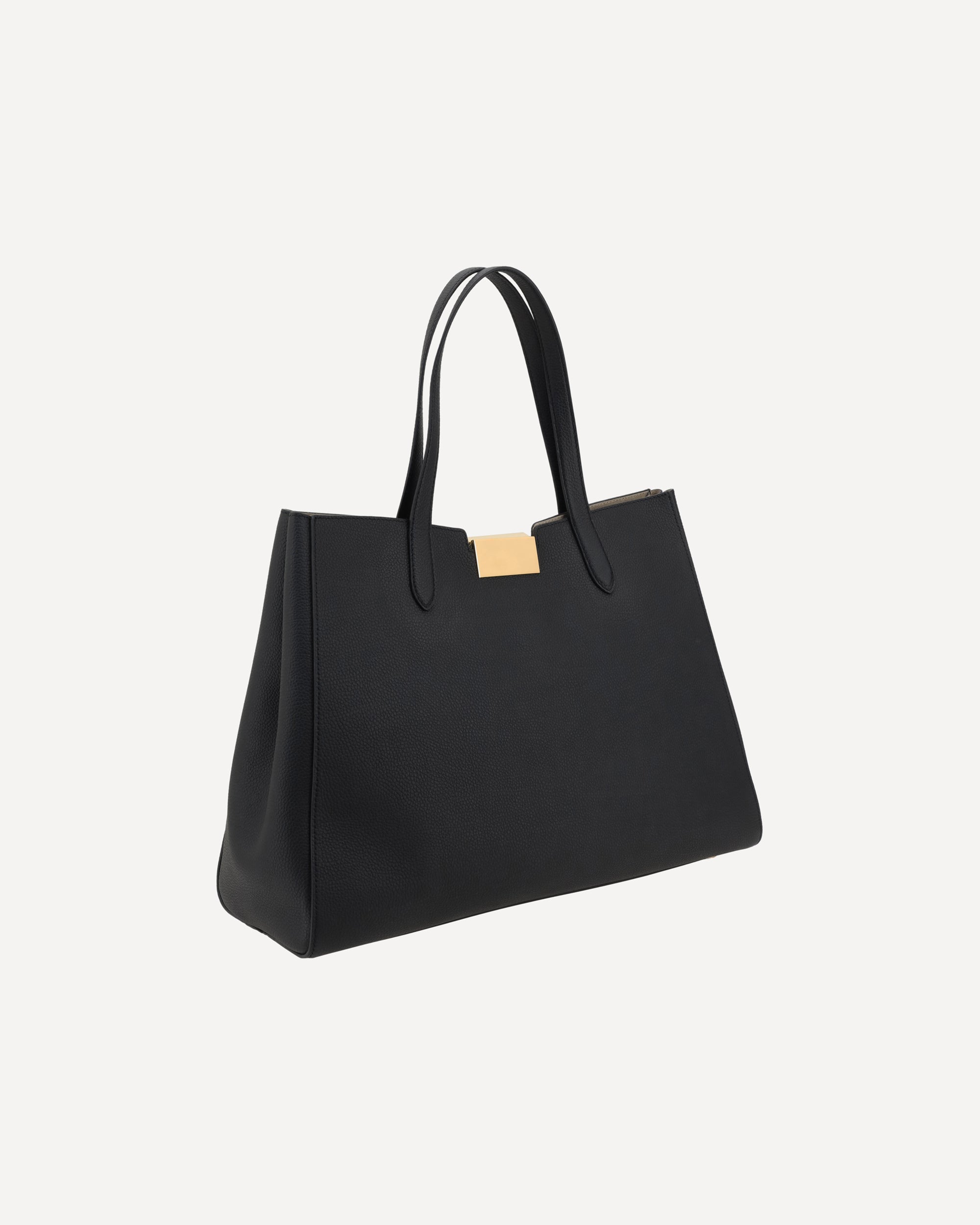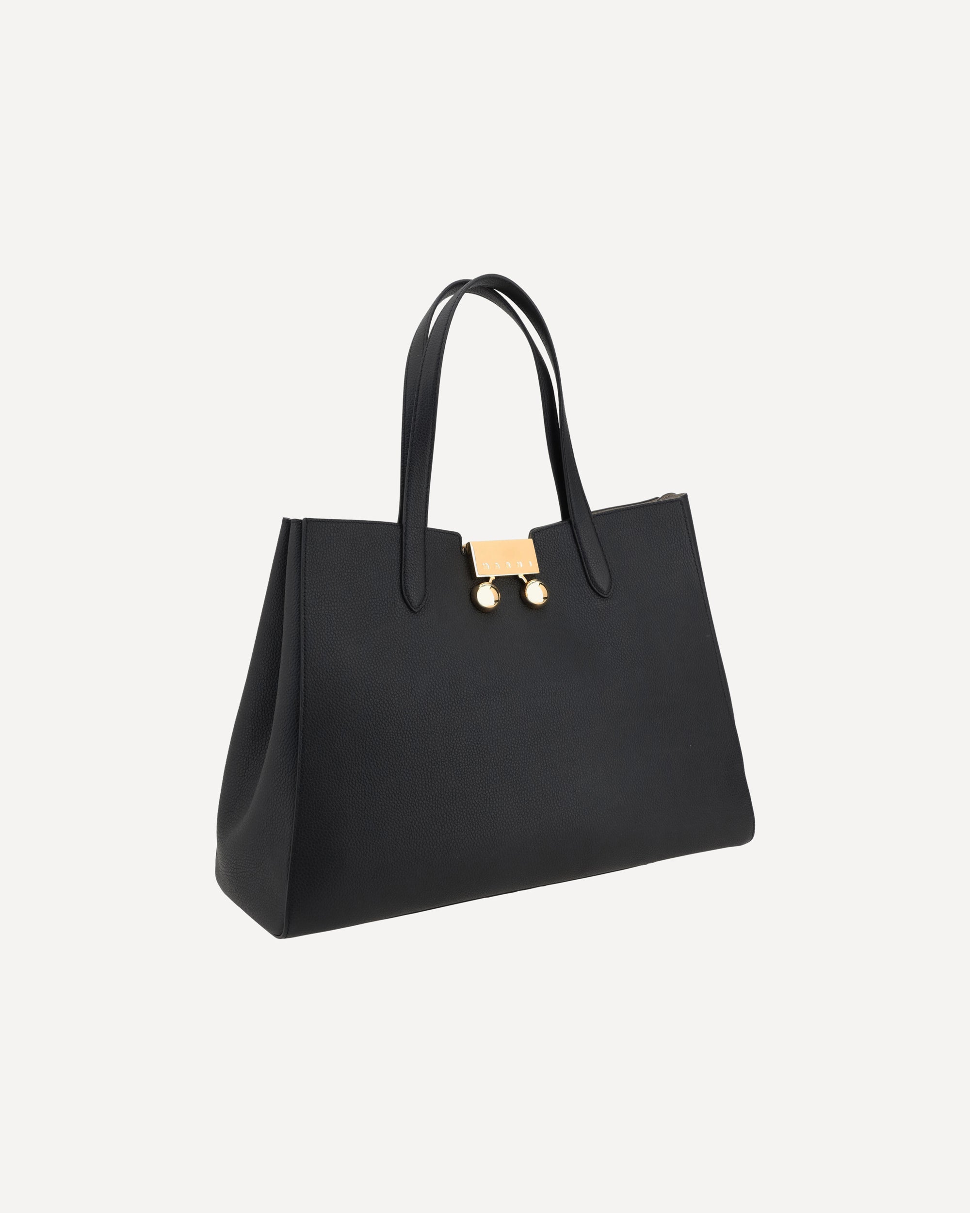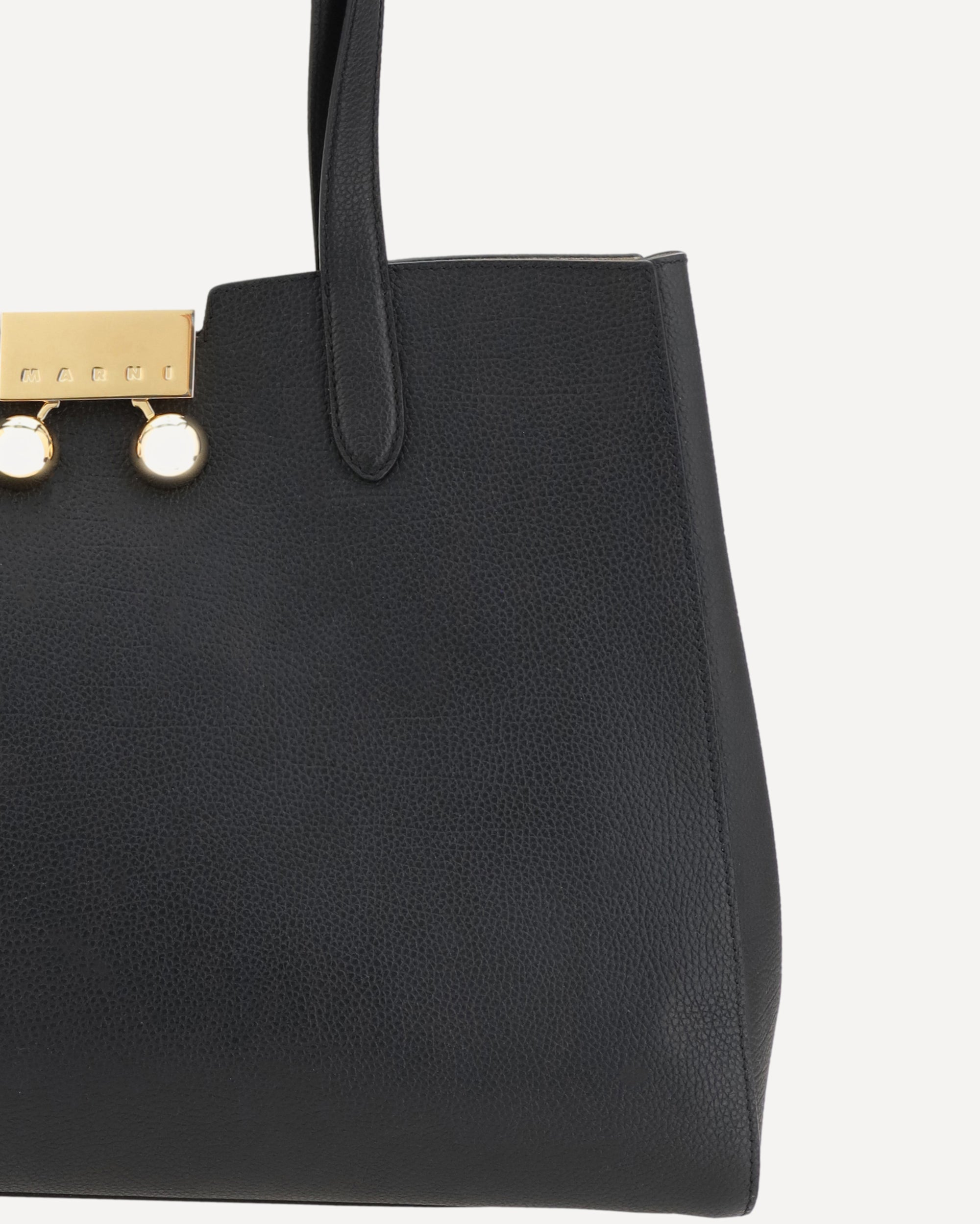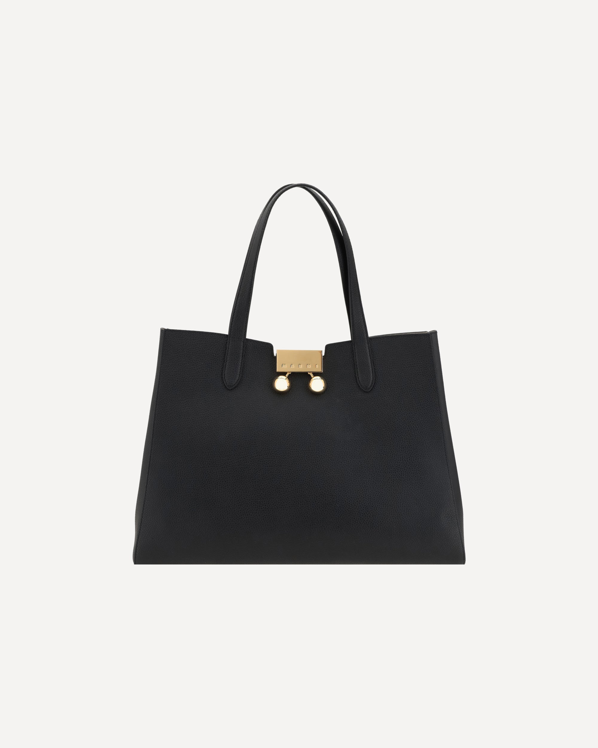 Borsa Tote medium di Marni è realizzata in pelle martellata, che le conferisce una texture unica e sofisticata. Dotata di due manici piatti superiori, è pratica e comoda da portare. La chiusura metallica superiore, con l'incisione dell'iconico monogramma del brand, aggiunge un tocco distintivo. L'interno è semplice e funzionale, con uno spazio unico per riporre gli oggetti essenziali, mantenendo un design minimalista ed elegante.