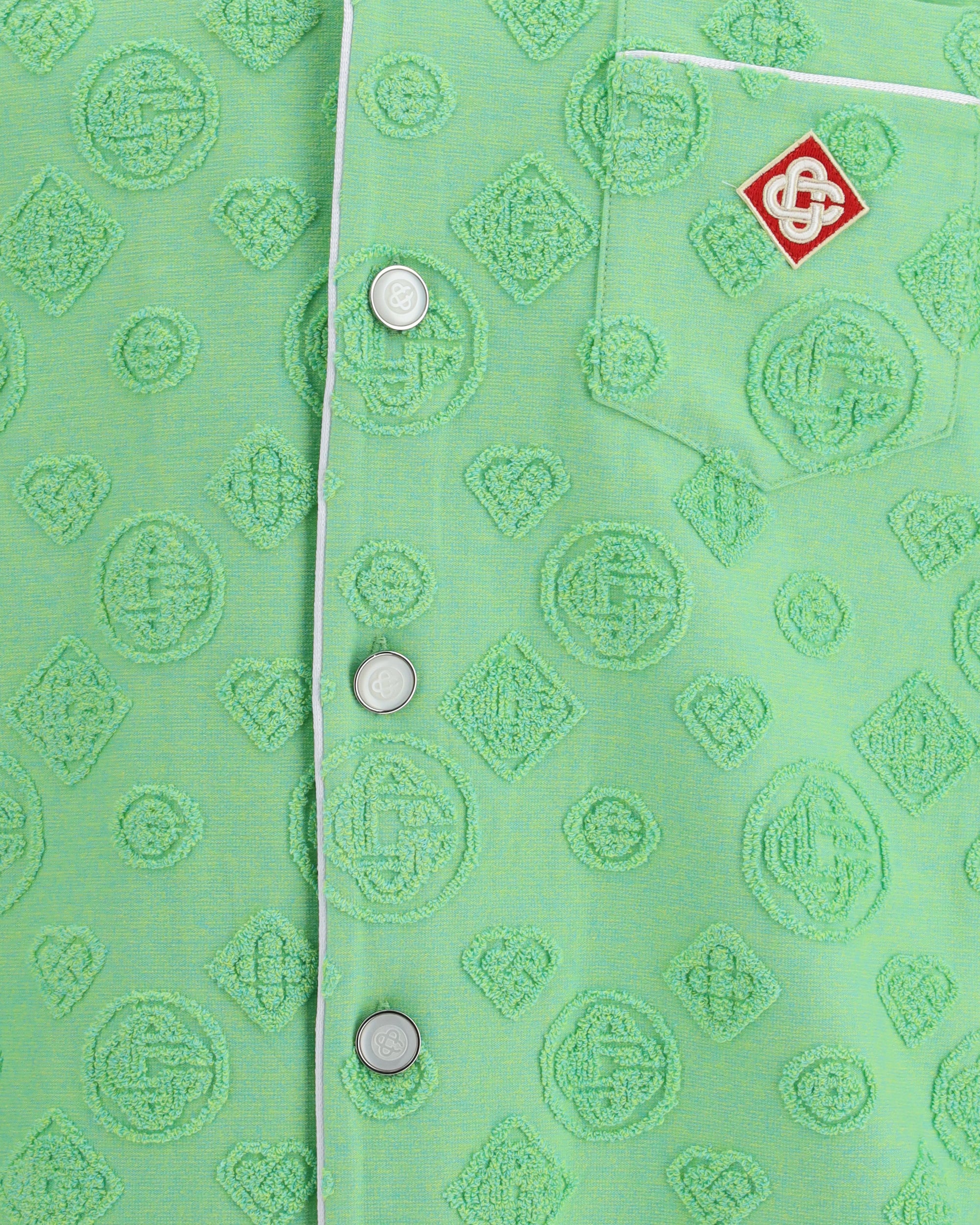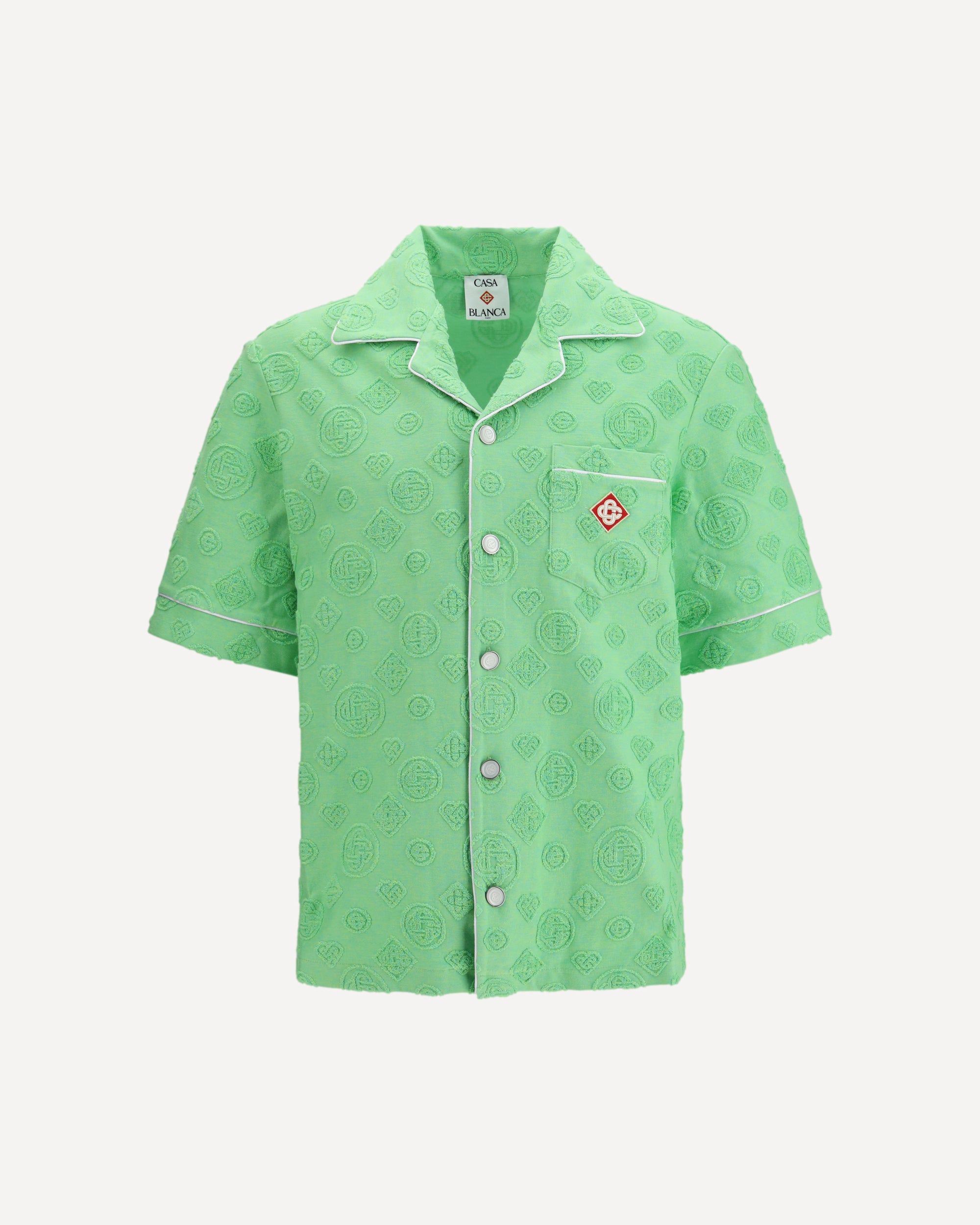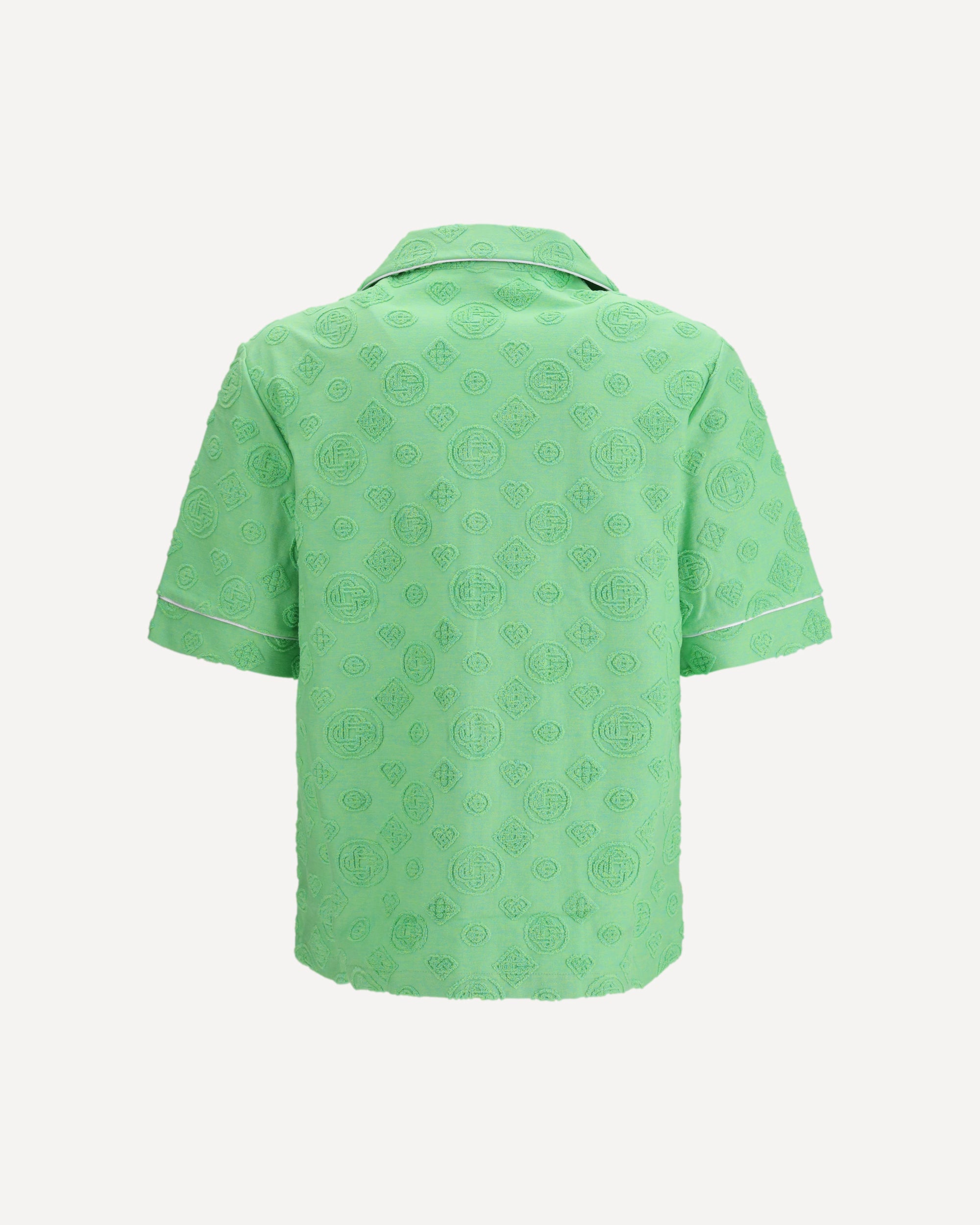 La Camicia a maniche corte realizzata in morbida spugna con il caratteristico motivo a monogramma a rombi della Maison. Il modello presenta una tasca sul petto, dettagli piping a contrasto, bottoni in madreperla con bordo dorato e un colletto cubano che dona un tocco rilassato ma raffinato. Una proposta estiva sofisticata, ideale per aggiungere un accento elegante e distintivo al look.