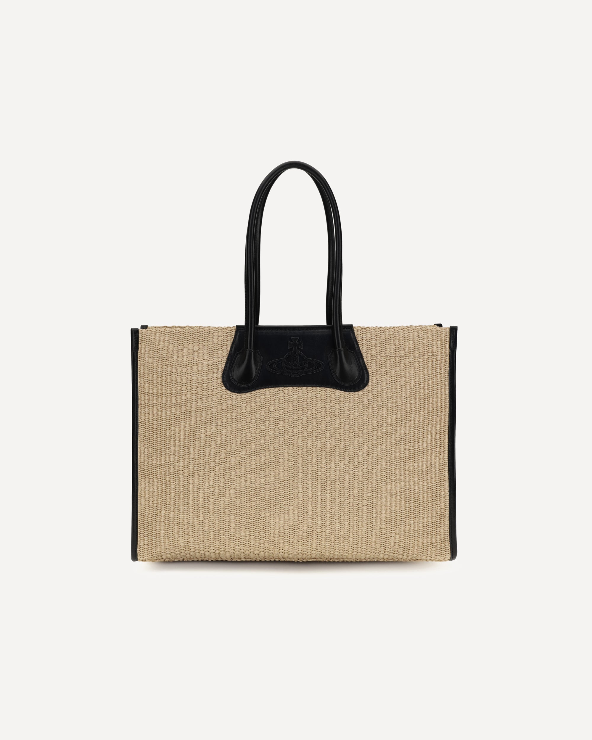 La Borsa Tote Troy di Vivienne Westwood unisce eleganza e funzionalità. Realizzata con silhouette rettangolare effetto rafia e manici arrotondati rinforzati, è decorata con il motivo “Line Orb” sull’inserto in pelle. La chiusura magnetica nascosta, la tasca interna con cerniera e i tasselli espandibili offrono praticità e spazio extra, mentre le impunture a vista completano il design raffinato.