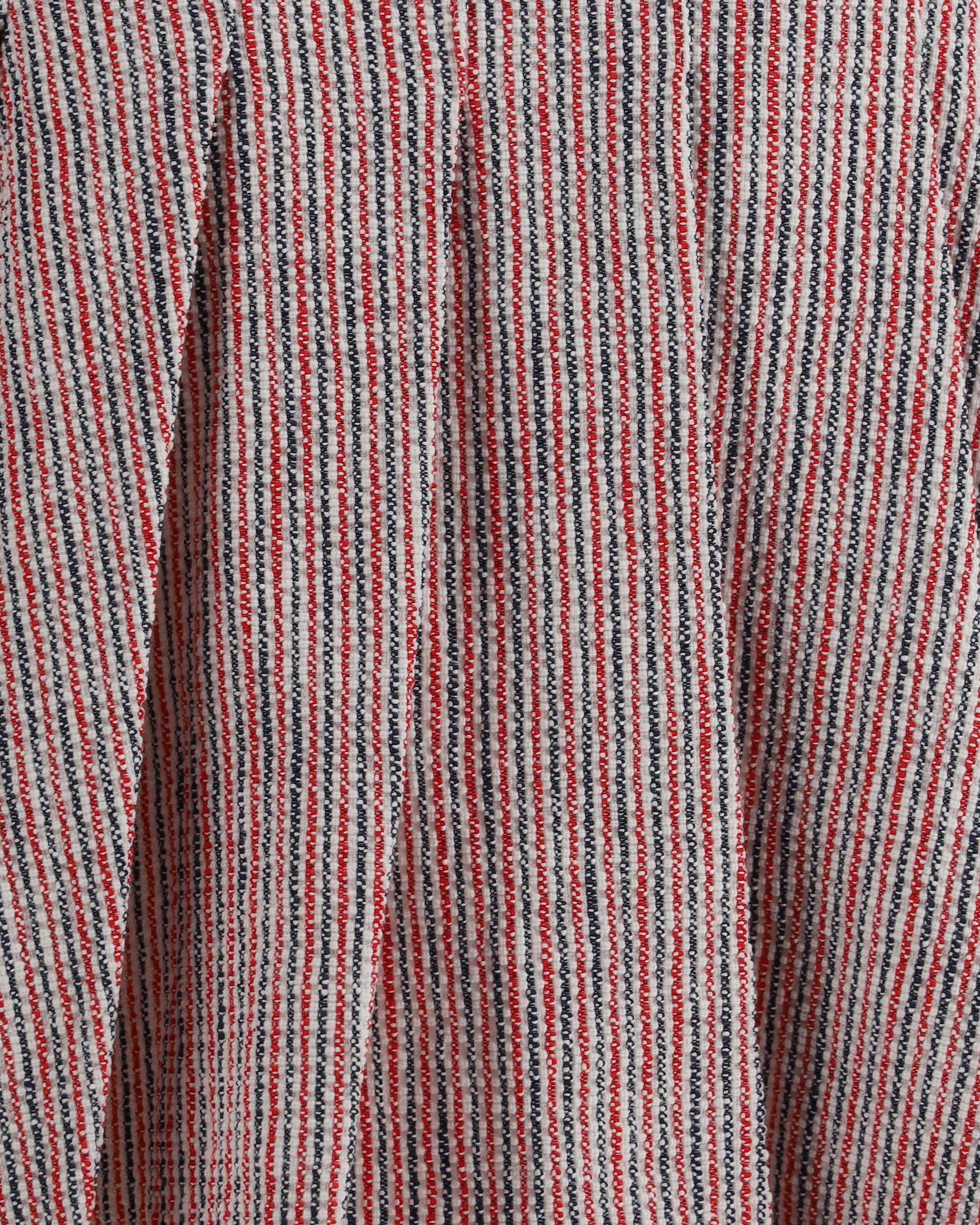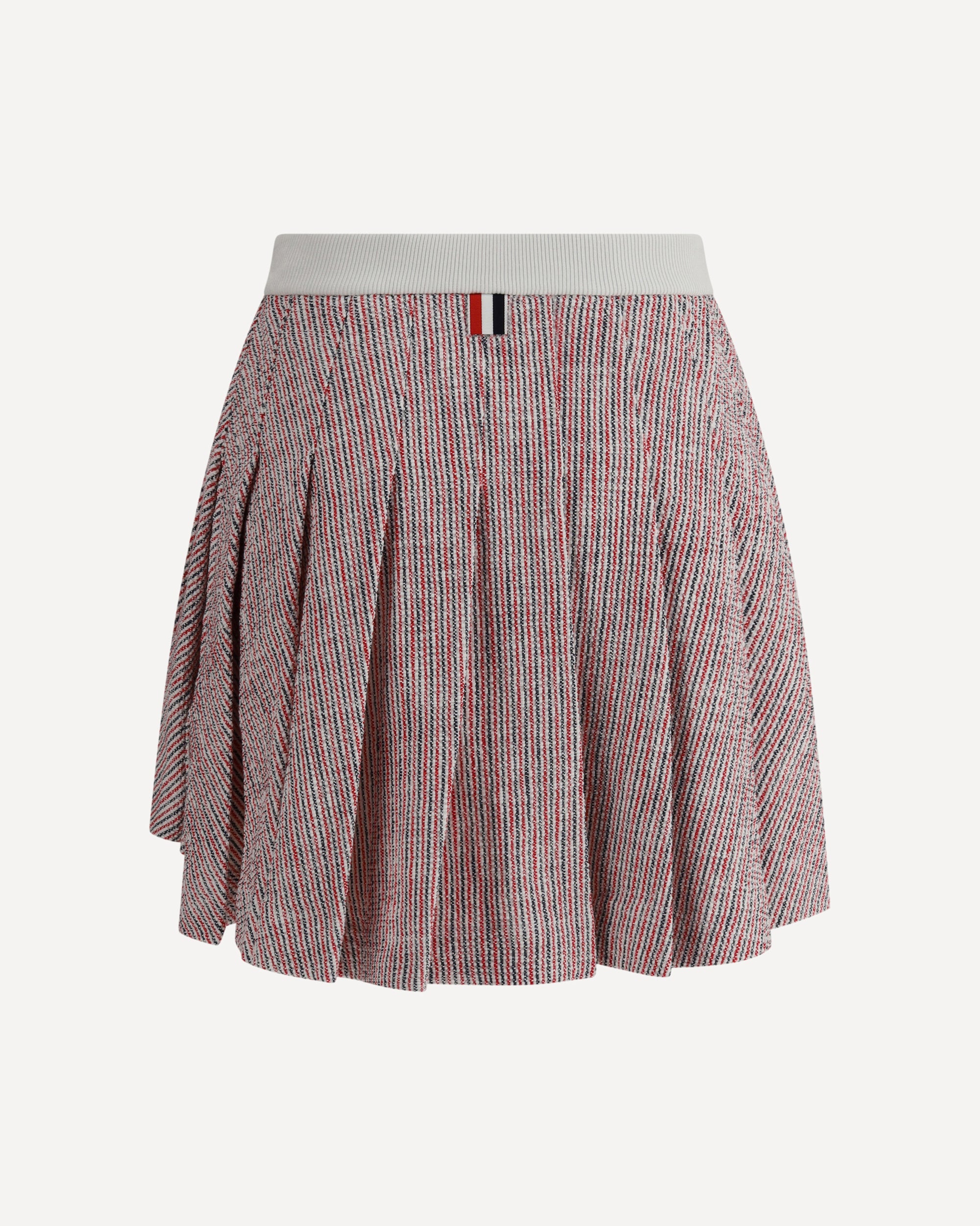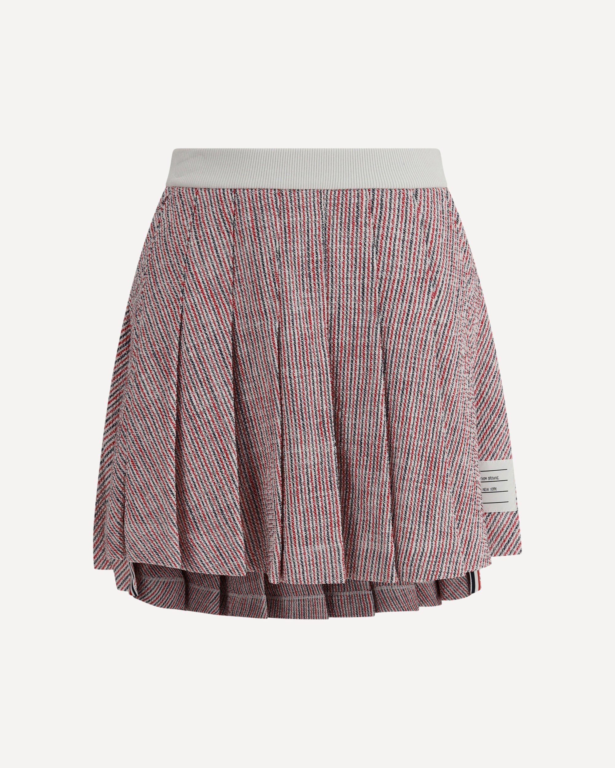 La Minigonna in tweed di Thom Browne è un capo elegante e sofisticato, che unisce classico e moderno con un tocco distintivo. Il girovita elasticizzato a costine assicura una vestibilità comoda e perfetta, mentre il design a pieghe aggiunge movimento e femminilità al look. Le righe RWB (rosso, bianco e blu) sul bordo sono un dettaglio iconico che richiama l'estetica del brand, conferendo al capo un carattere unico e riconoscibile. Sul fronte, l'applicazione dell'iconico patch con la firma del marchio aggiunge un ulteriore tocco di esclusività, rendendo questa minigonna un vero must-have per chi cerca un mix di stile e qualità.