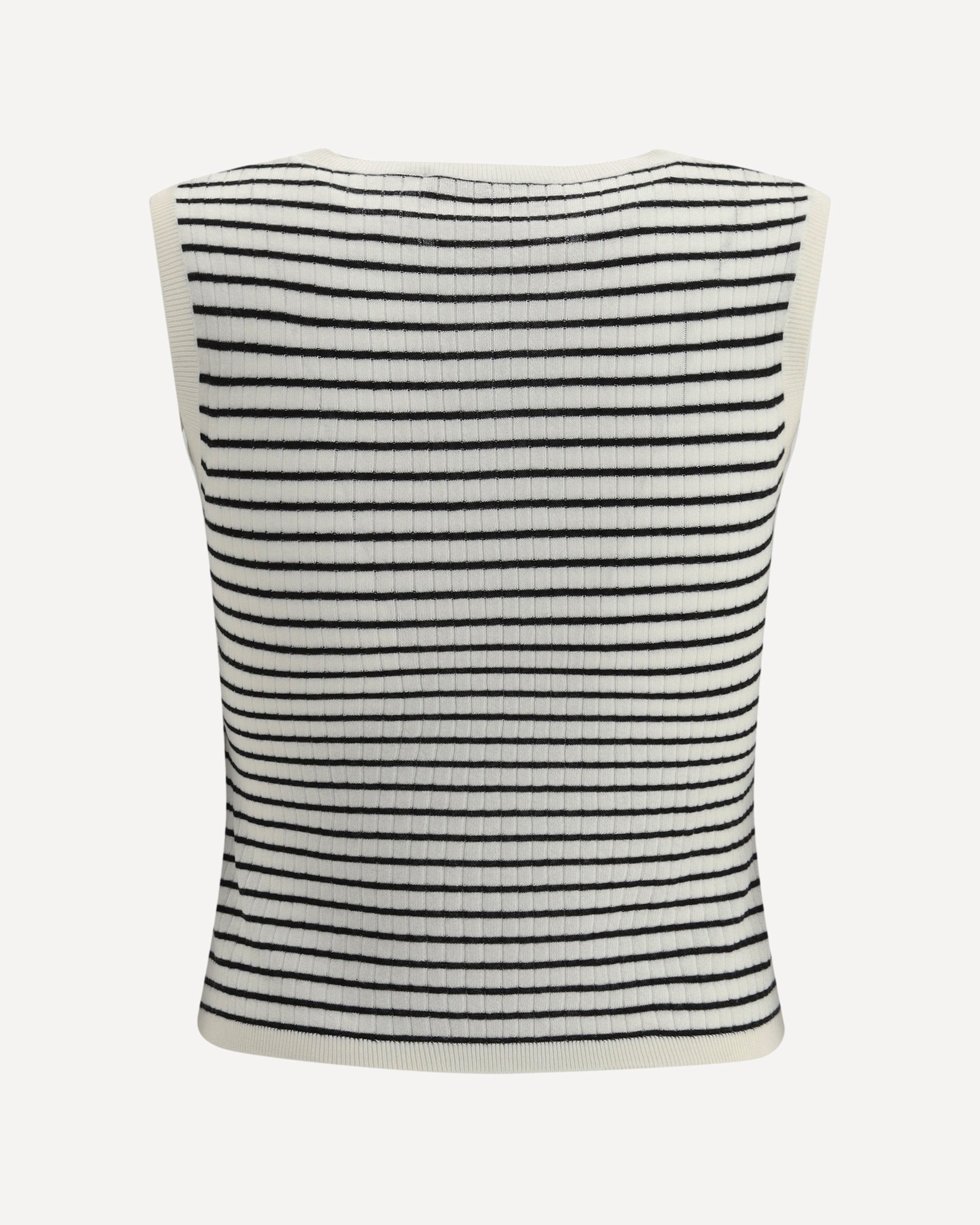 Il Top Valeria di Max Mara Studio è un capo elegante e sofisticato, perfetto per un look moderno e raffinato. Il modello smanicato e il girocollo a costine creano una silhouette pulita e definita, mentre l'orlo a costine aggiunge un dettaglio di stile discreto. Il design a coste, insieme alla fantasia a righe, dona texture e movimento al top, conferendo un tocco dinamico e chic.