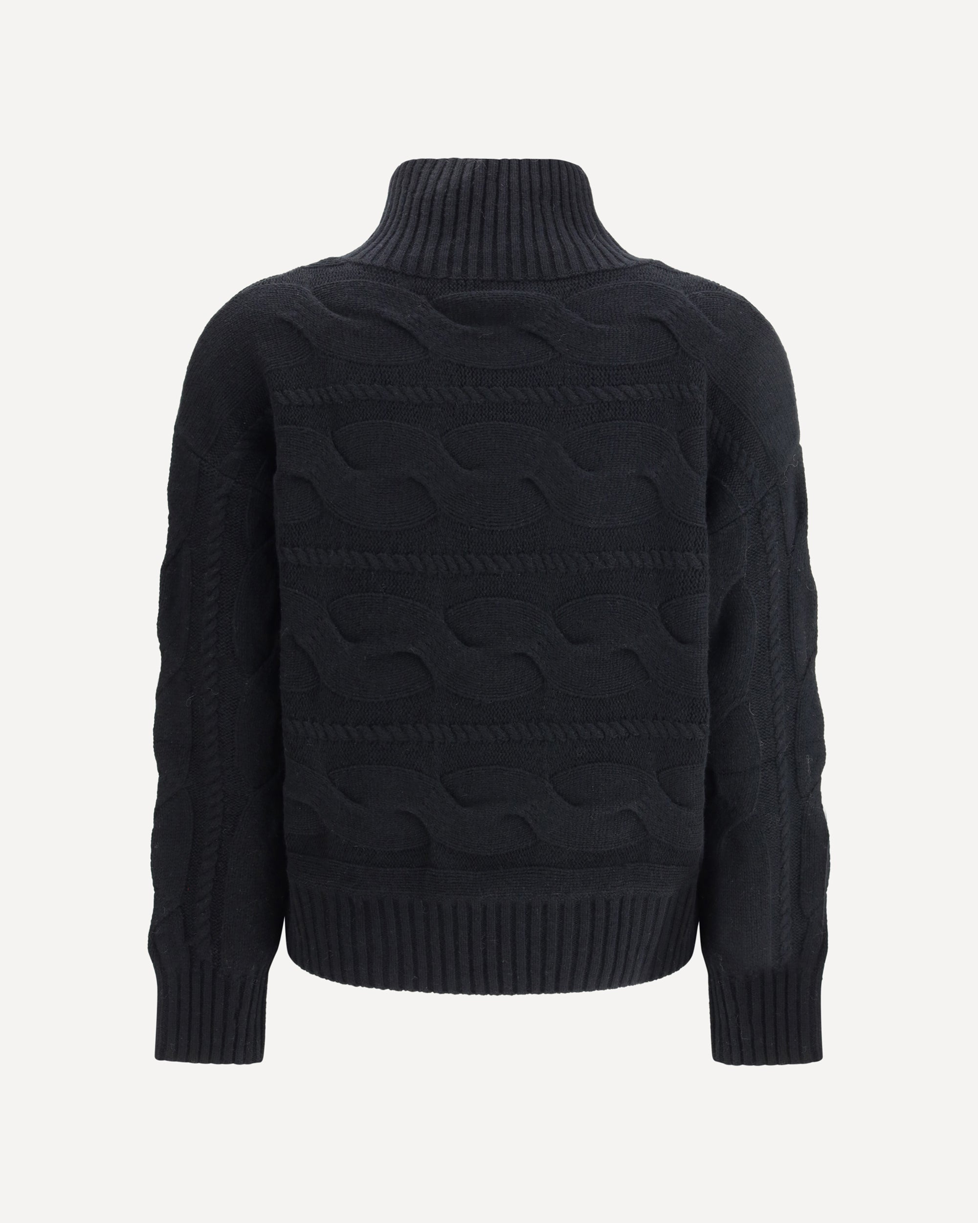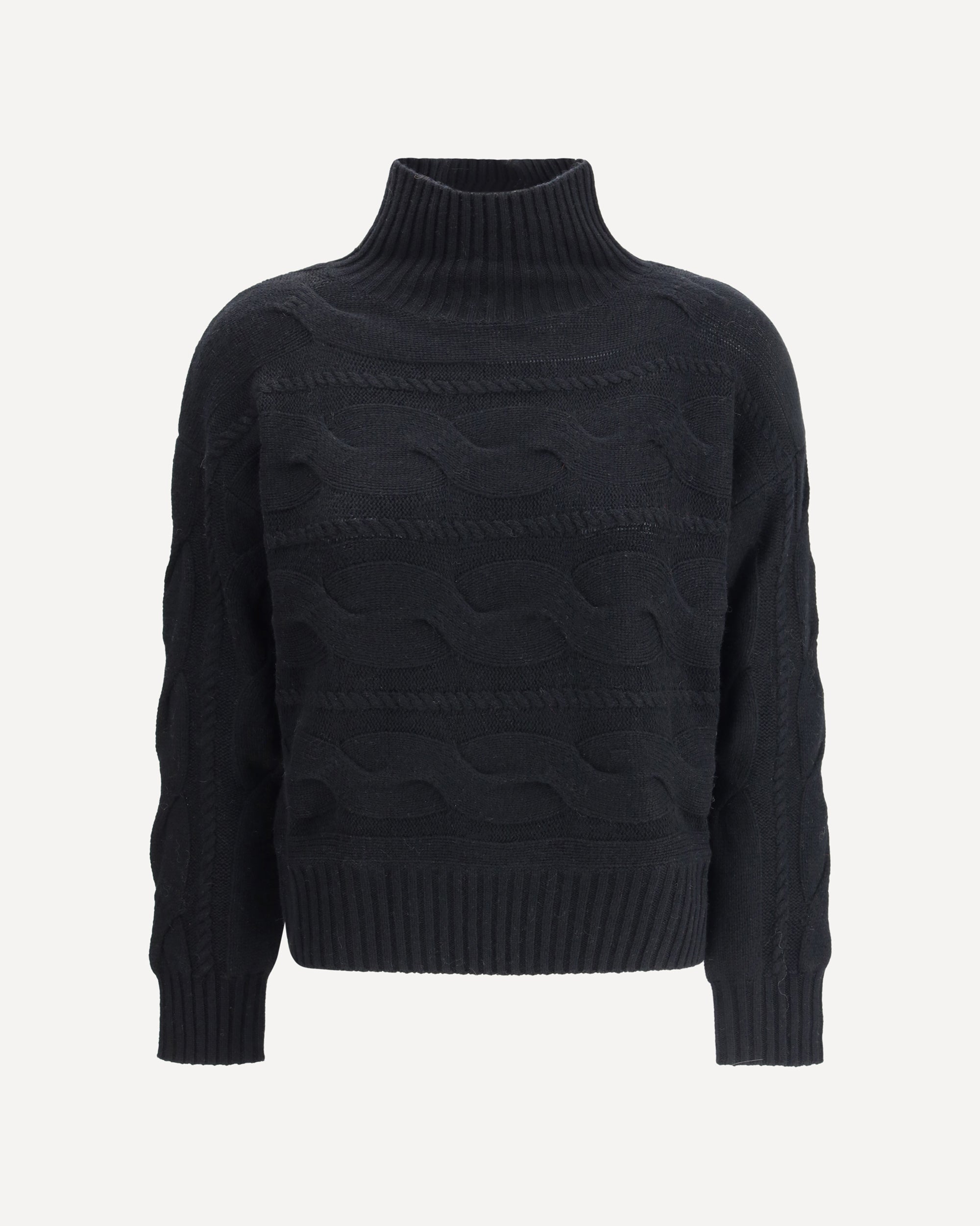La Maglia a collo alto firmata Max Mara Studio, realizzata in pregiato filato di lana e cashmere. La lavorazione a trecce orizzontali all over dona al capo un aspetto raffinato e tattile, mentre la linea morbida e il volume avvolgente garantiscono massimo comfort. Il collo a cratere e i bordi a costine completano il design con un tocco di eleganza rilassata.