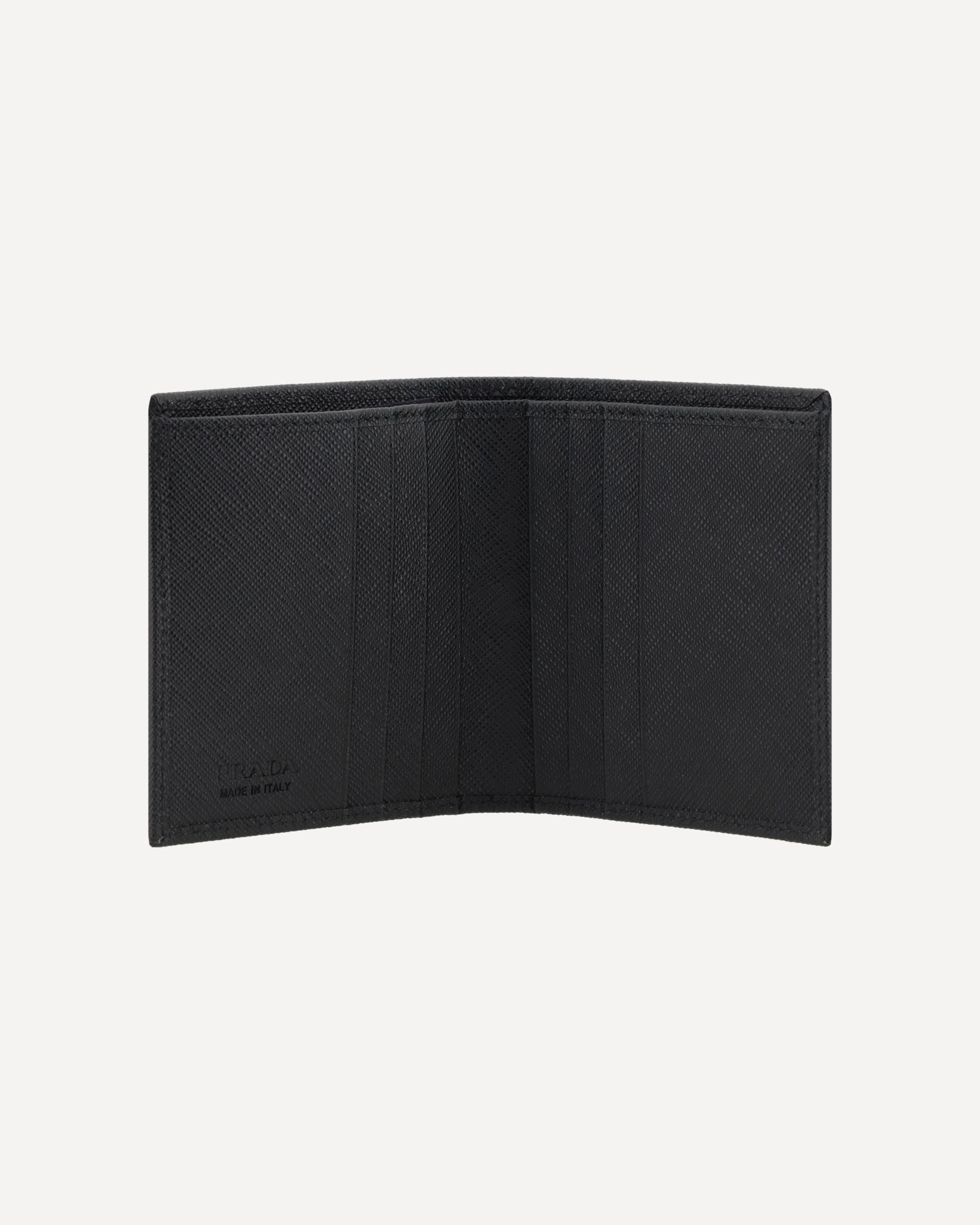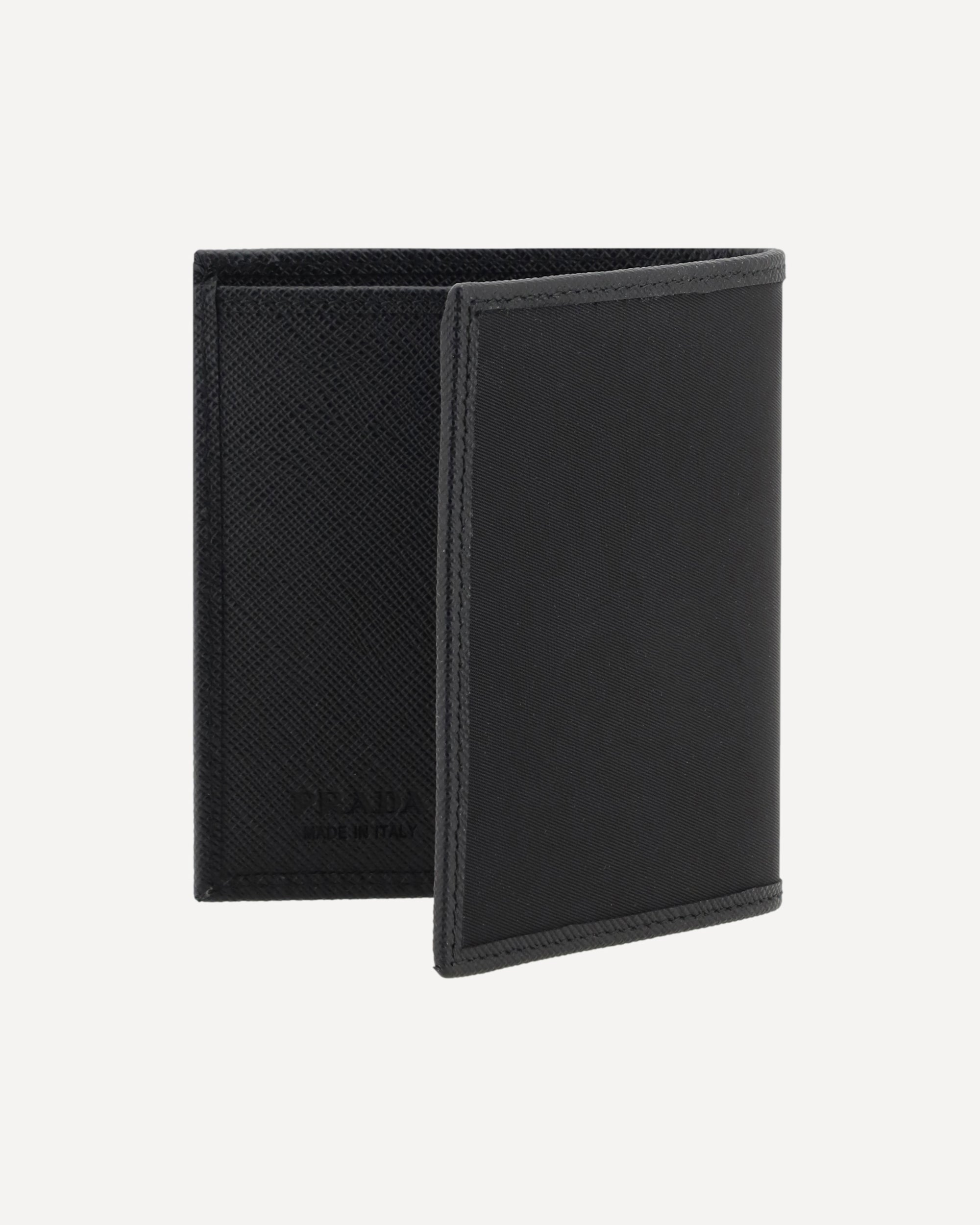 Portafogli in Re-nylon di Prada, modello bifold, scomparto porta banconote interno, slot portacarte interno, iconica placca triangolare smaltata applicata sul fronte, iconico monogramma del brand inciso all'interno, interno in pelle.