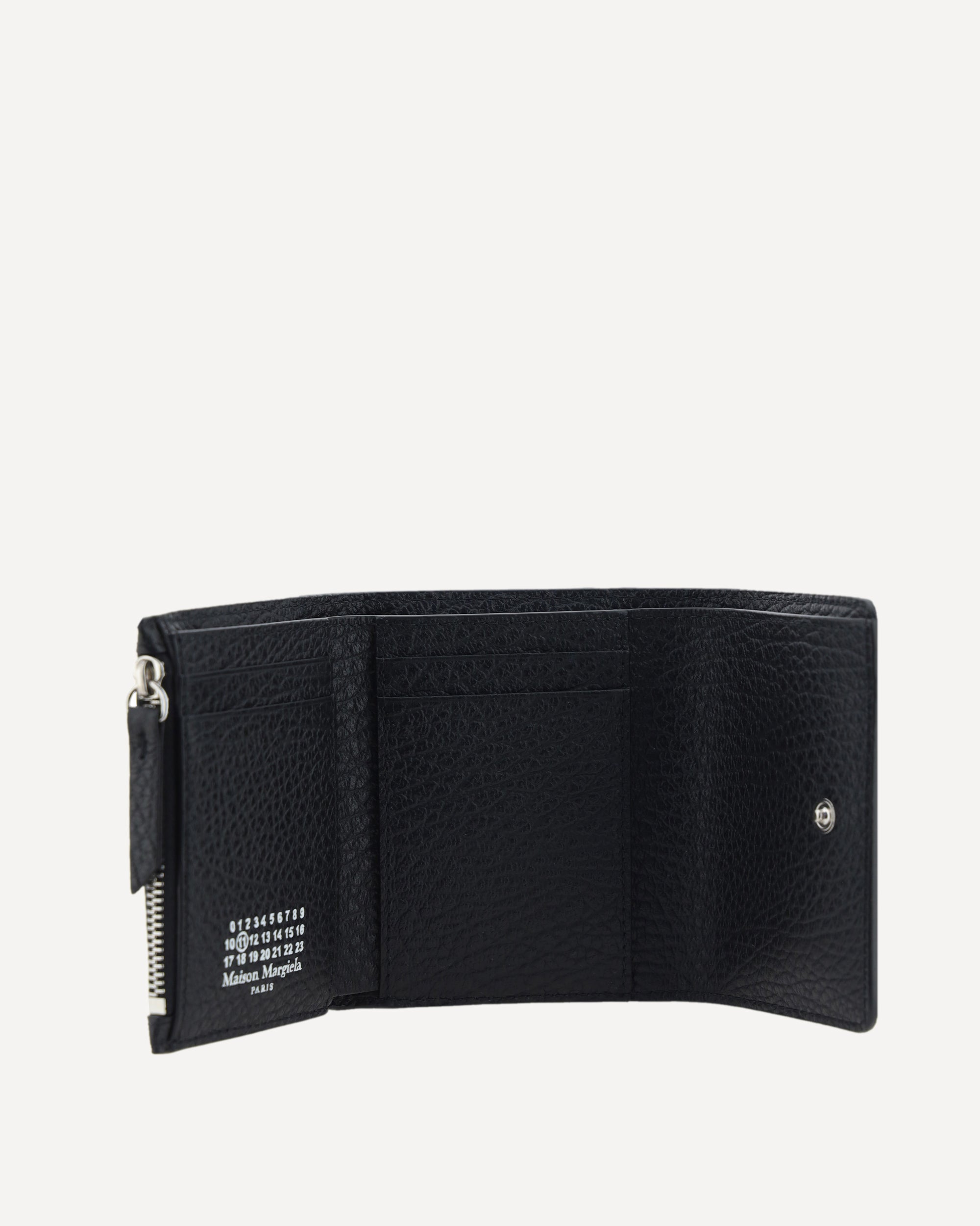 Il Portafogli in pelle martellata di Margiela unisce funzionalità e stile raffinato. L’apertura con bottone a pressione nasconde una taschina portamonete con cerniera, slot per carte e scomparto porta banconote, mentre il logo del brand stampato a contrasto all’interno aggiunge un dettaglio distintivo ed elegante.
