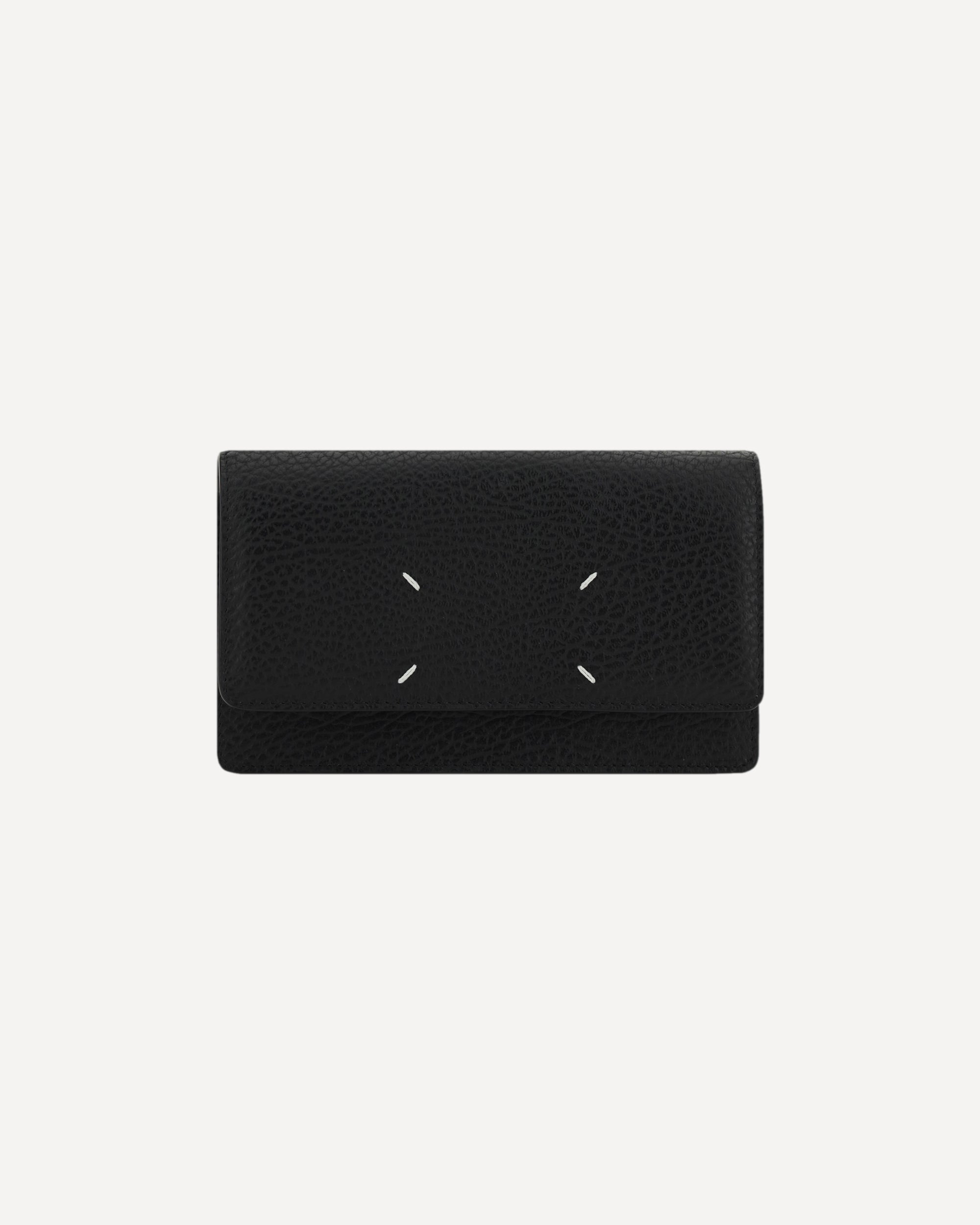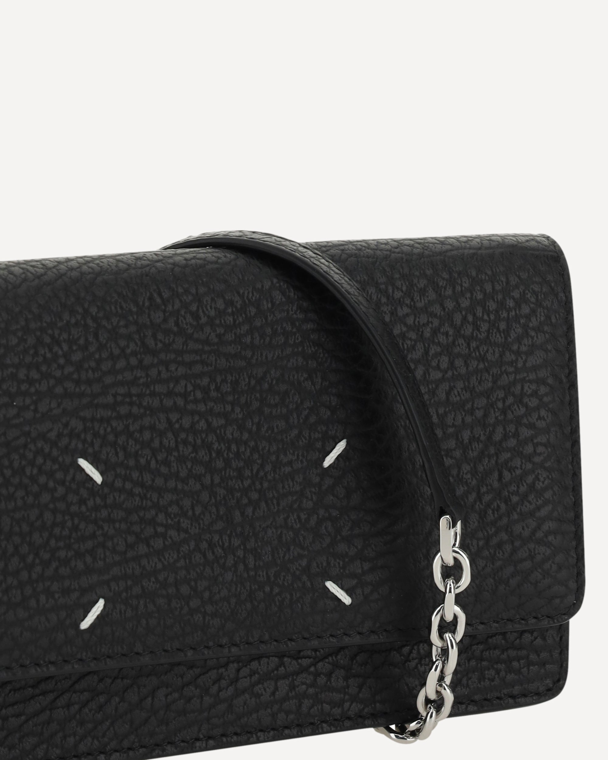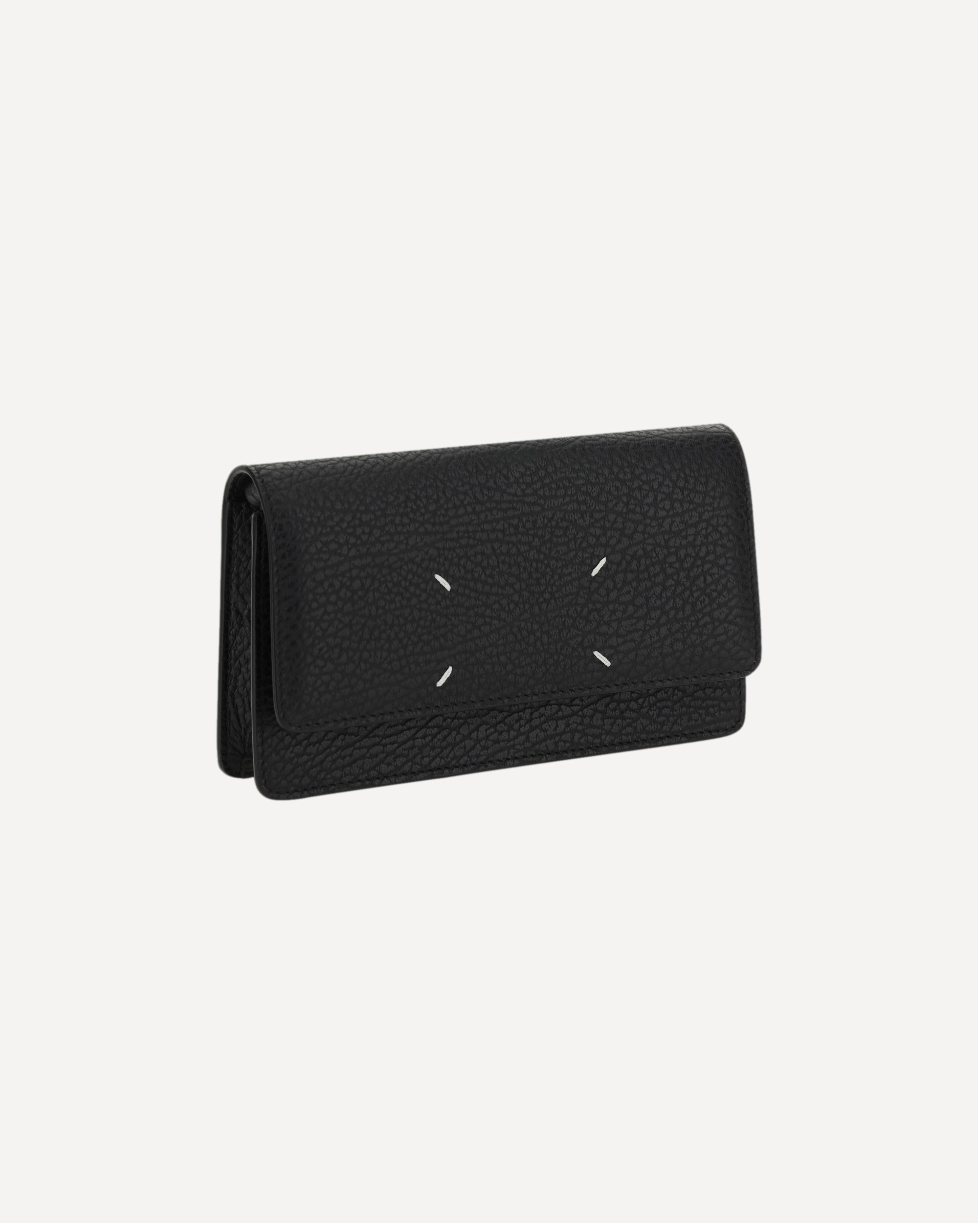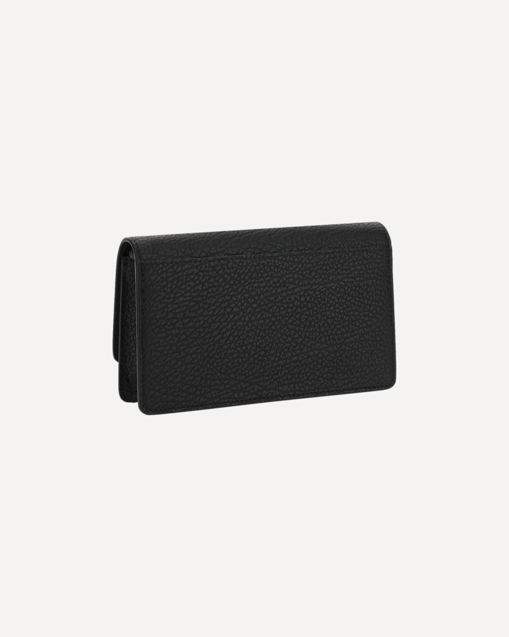 Il Portafogli in pelle martellata di Margiela unisce design raffinato e praticità compatta. La chiusura frontale con patta magnetica è valorizzata dalle iconiche impunture a contrasto ricamate sul fronte, mentre la tracolla a catena con dettaglio regolabile in pelle consente un trasporto versatile. All’interno, un unico scomparto ospita tasca a filetto e slot portacarte, completati da una tasca a filetto sul retro, per un equilibrio perfetto tra stile e funzionalità.