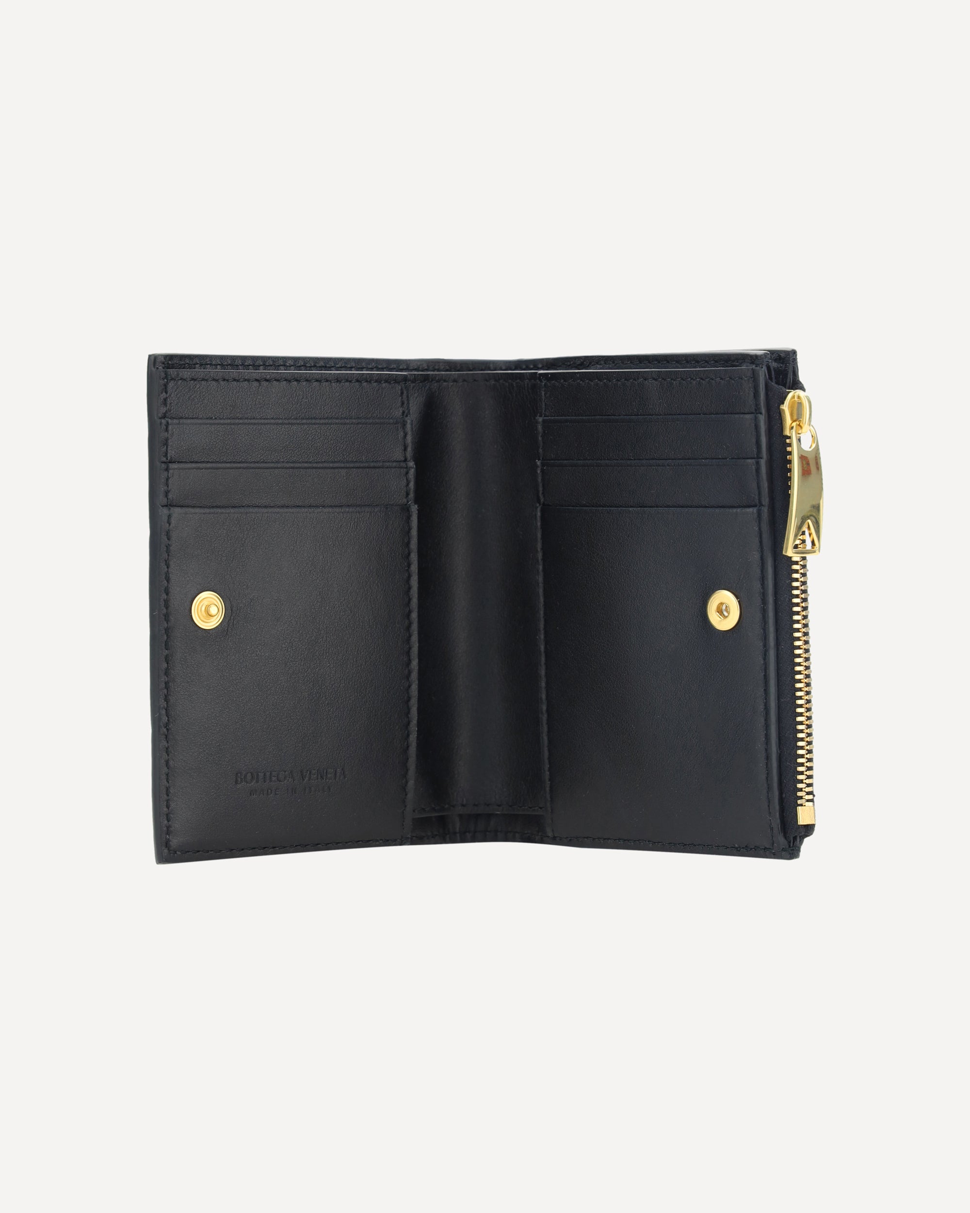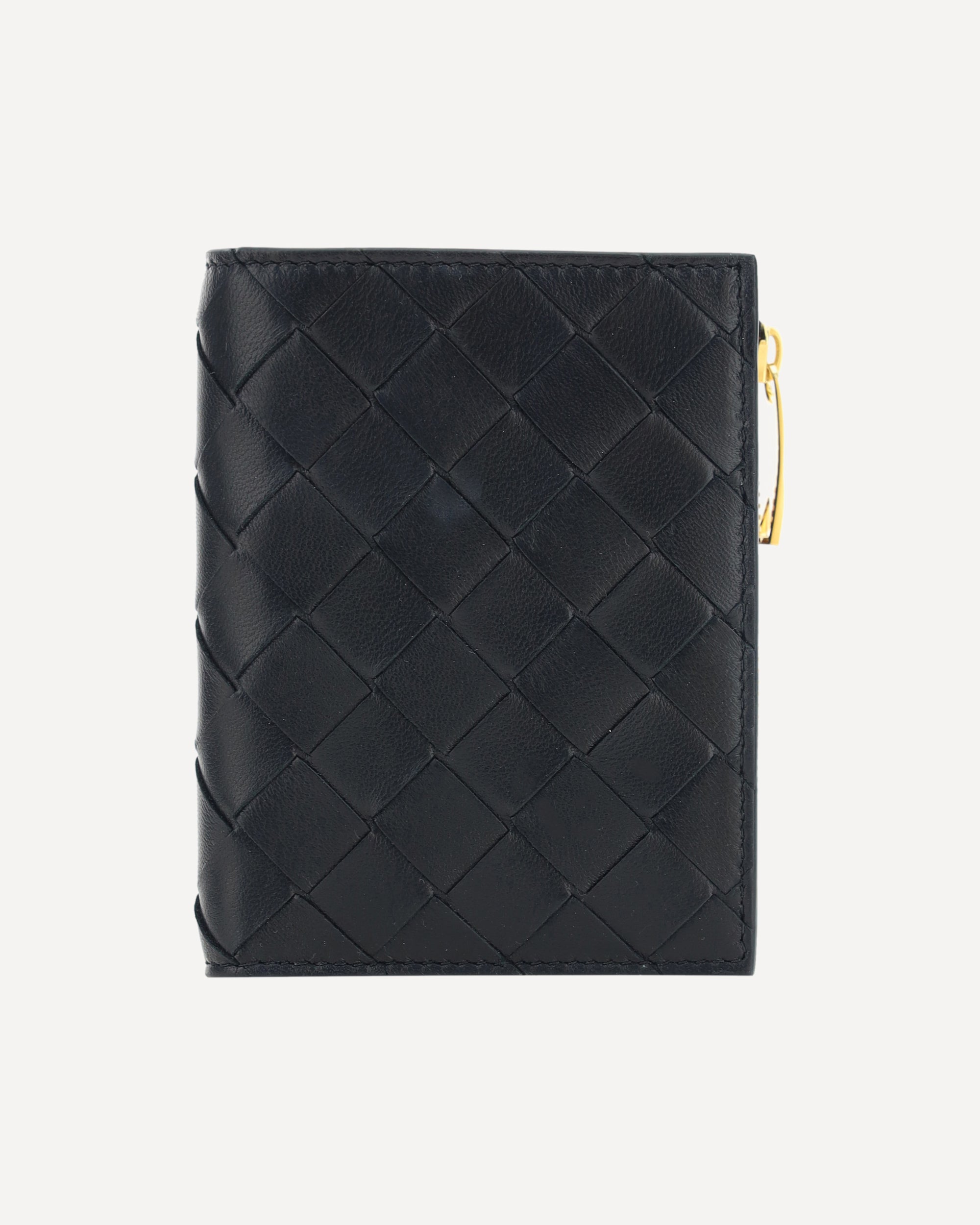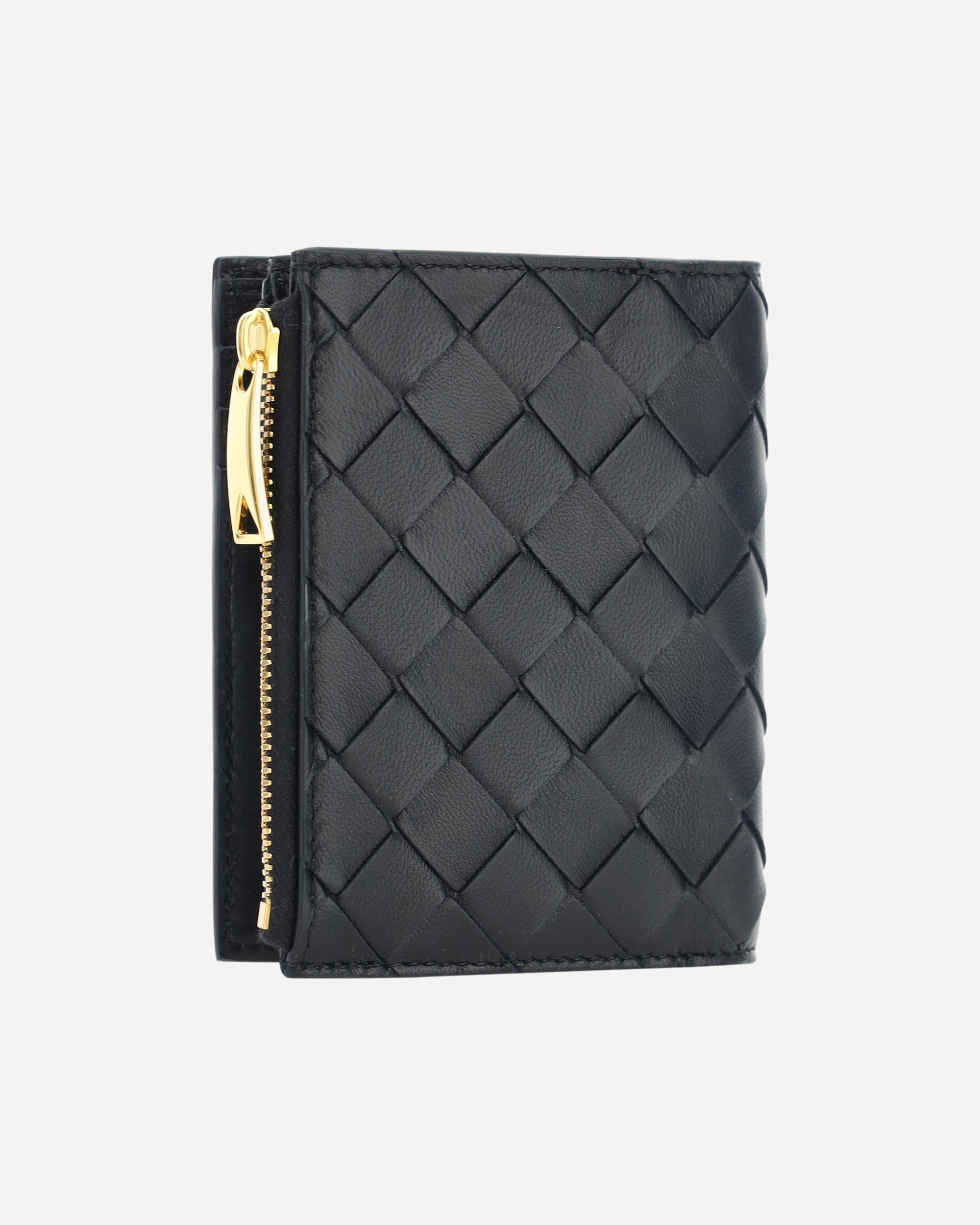 Il Portafoglio in pelle d’agnello di Bottega Veneta unisce eleganza e funzionalità con il suo iconico motivo intrecciato all-over. Dotato di doppio slot portacarte, scomparto per banconote e porta monete con chiusura a cerniera, presenta una chiusura con bottone a pressione e il monogramma del brand stampato all’interno. Un accessorio compatto e sofisticato, perfetto per chi cerca stile e praticità.