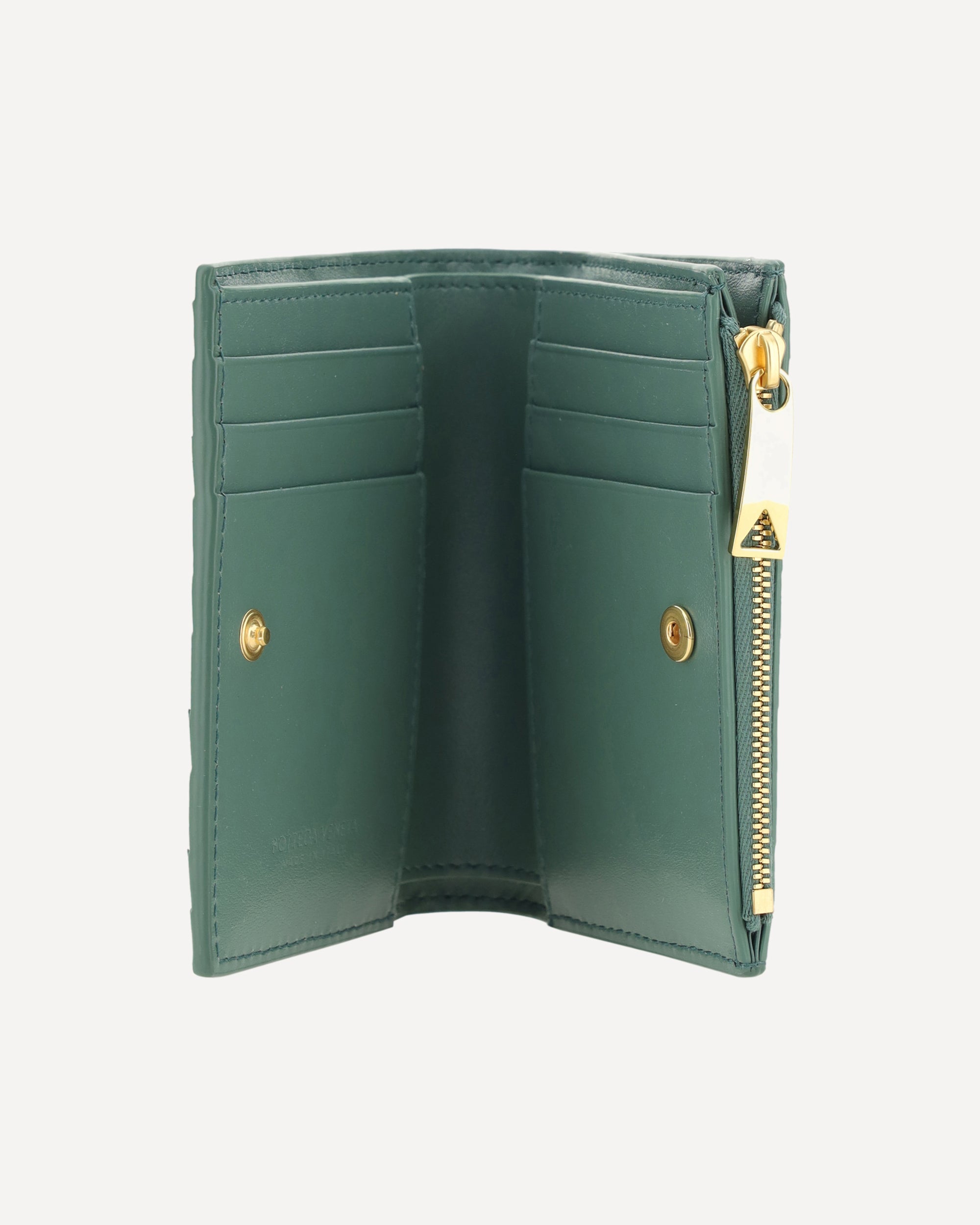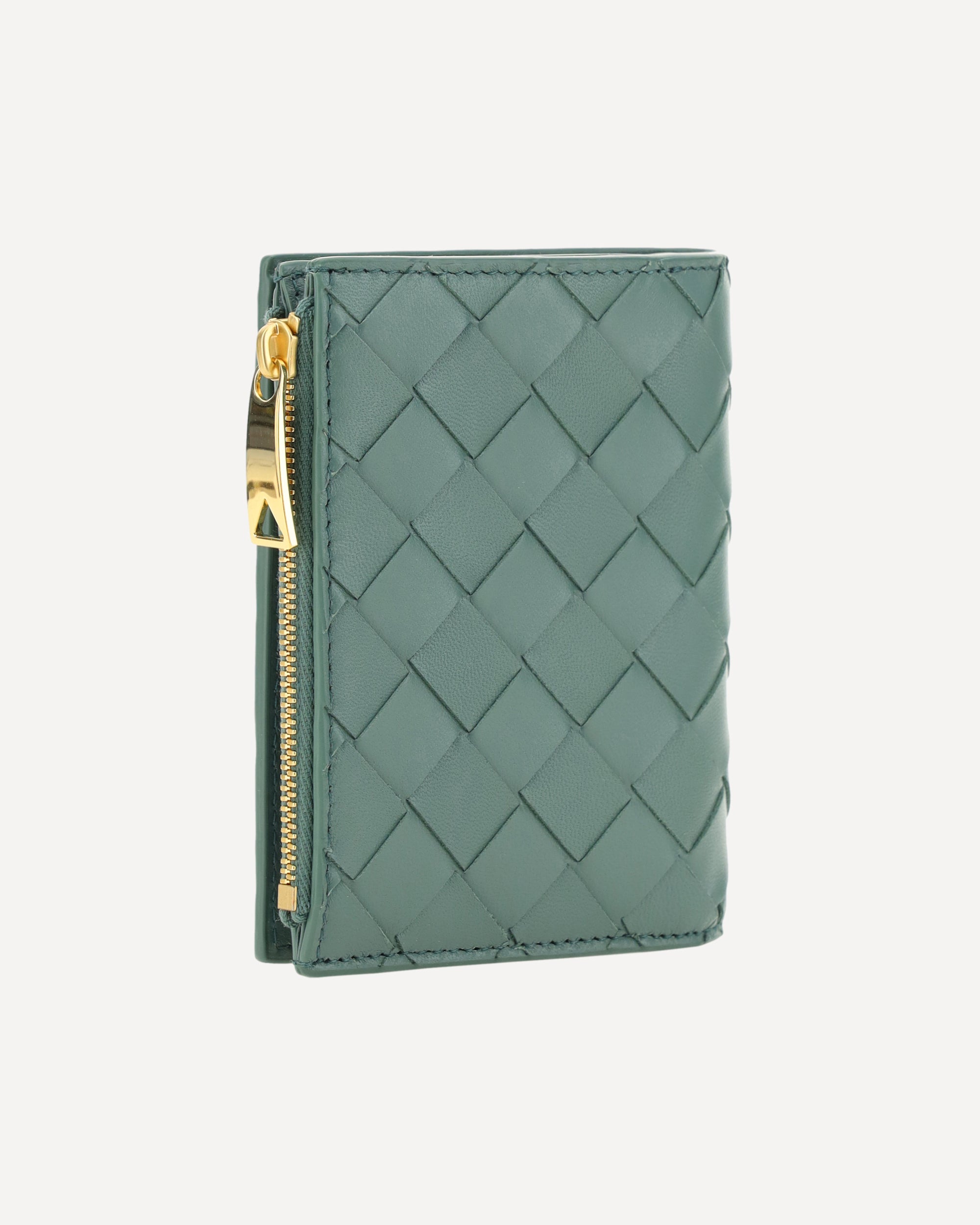Il Portafoglio in pelle d’agnello di Bottega Veneta unisce eleganza e funzionalità con il suo iconico motivo intrecciato all-over. Dotato di doppio slot portacarte, scomparto per banconote e porta monete con chiusura a cerniera, presenta una chiusura con bottone a pressione e il monogramma del brand stampato all’interno. Un accessorio compatto e sofisticato, perfetto per chi cerca stile e praticità.