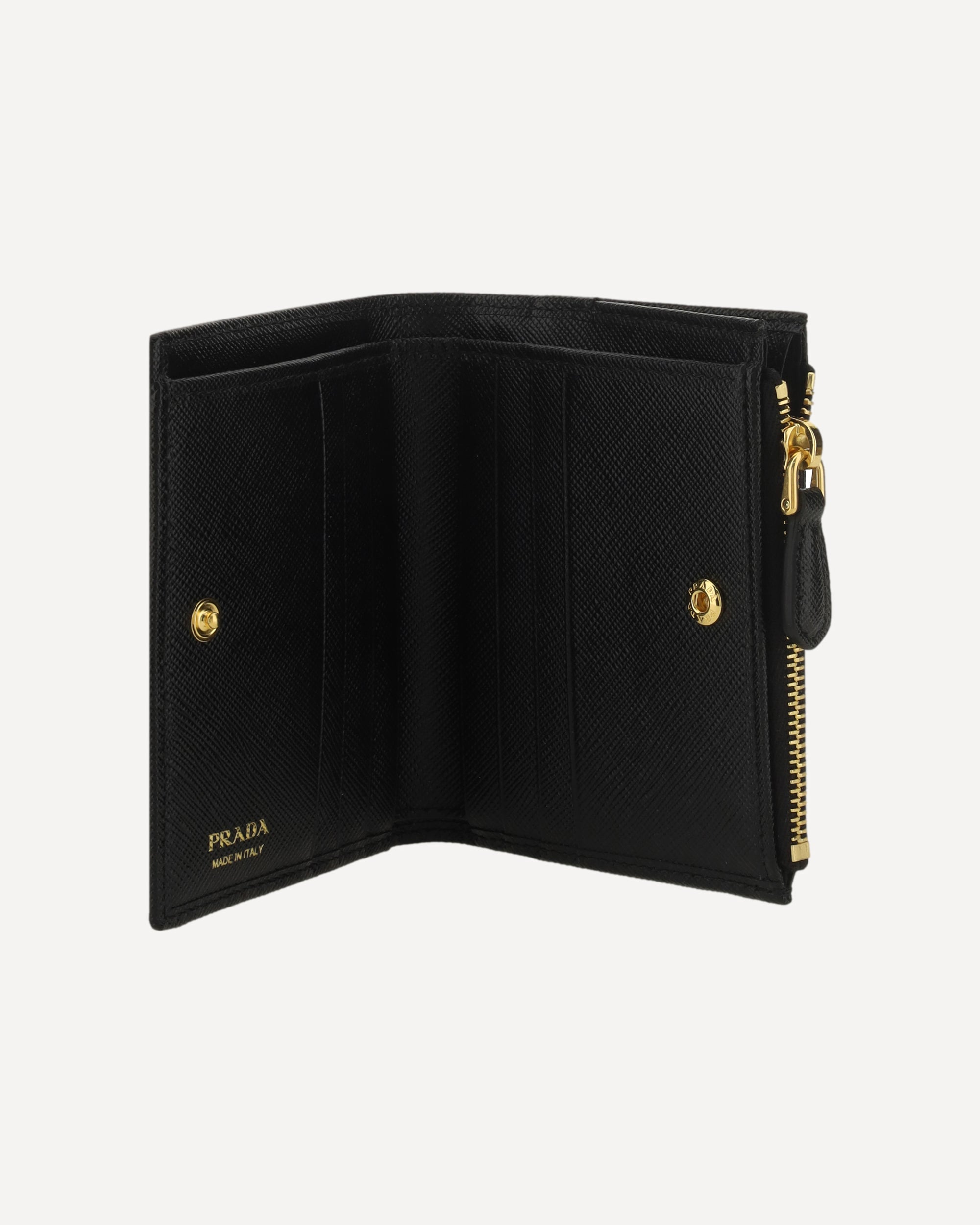 Il portafogli in pelle di Prada unisce eleganza e funzionalità in un design compatto e raffinato. All’interno è dotato di slot per carte, uno scomparto porta monete con chiusura a bottone a pressione e uno scomparto per le banconote. Sul fronte spicca l’iconica placca triangolare smaltata con il logo del brand, applicata in rilievo, che conferisce al portafogli un tocco distintivo e immediatamente riconoscibile.