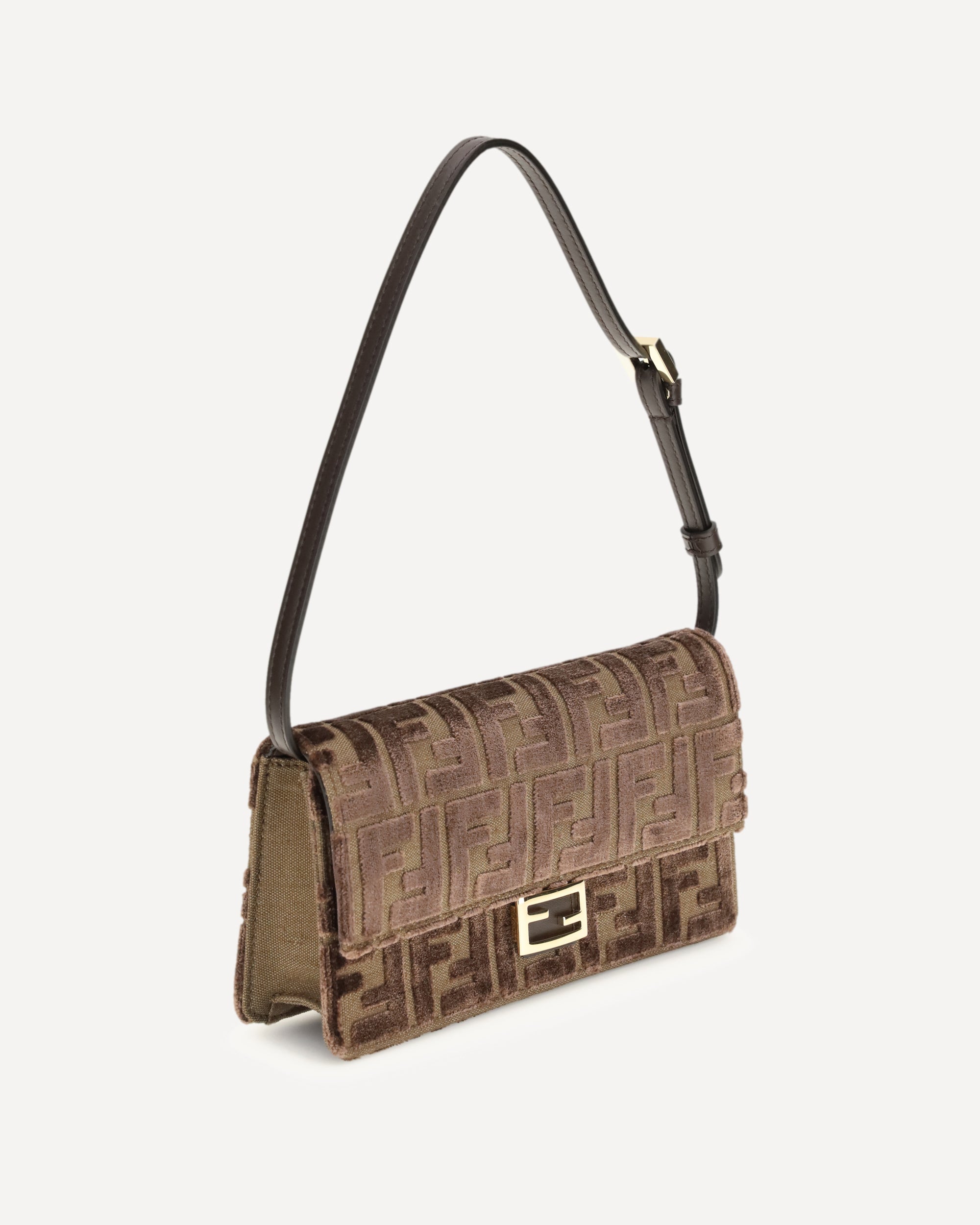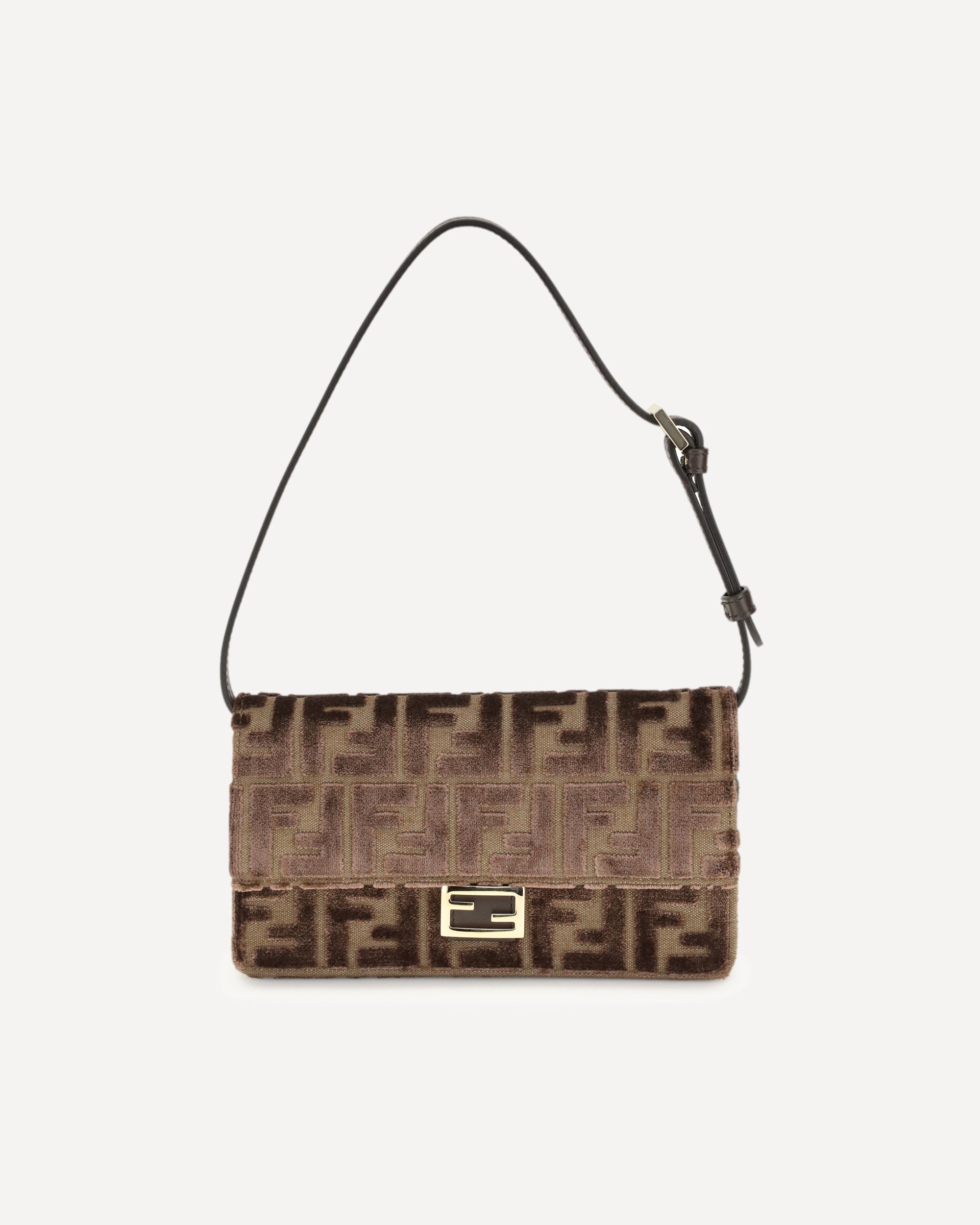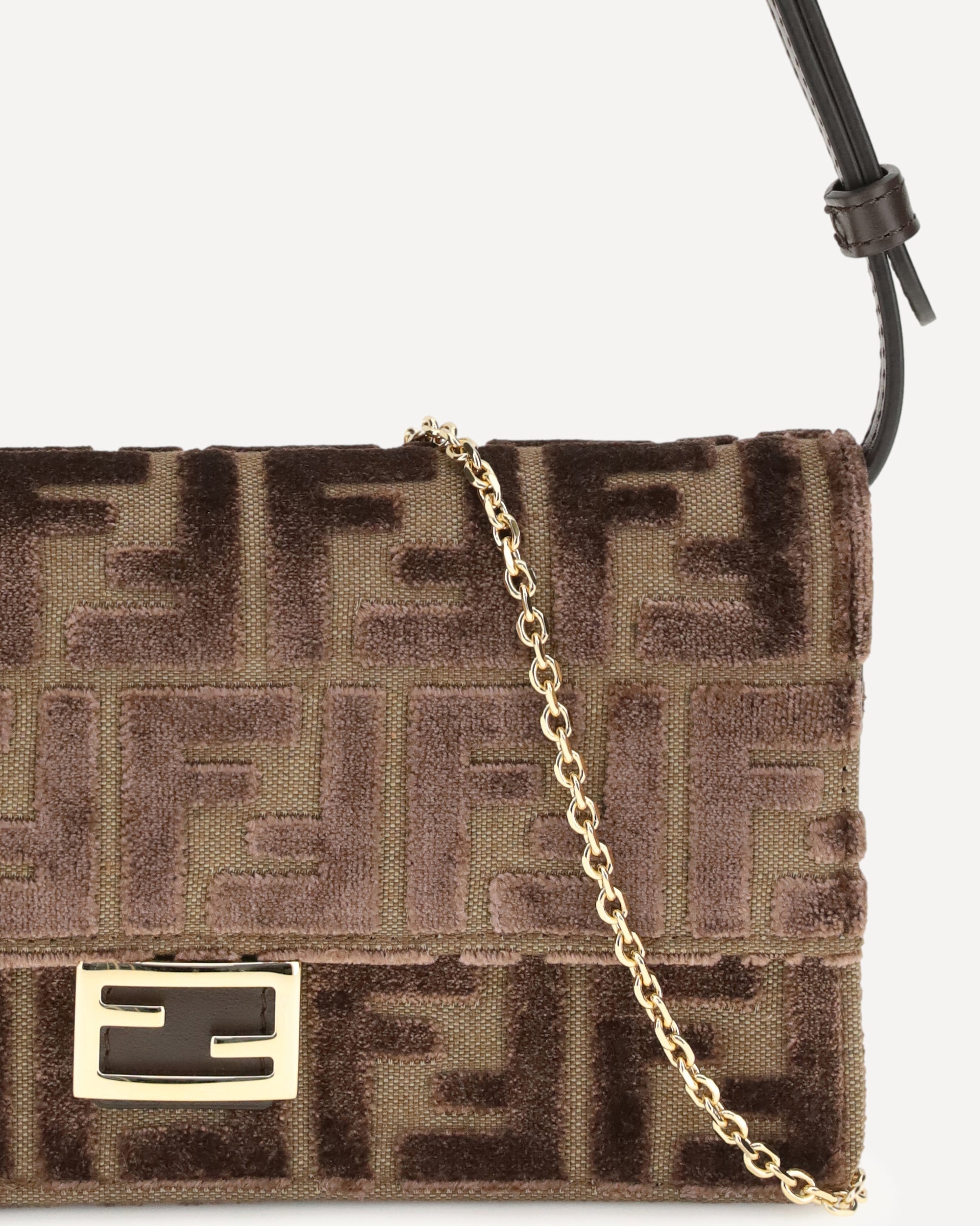 Il Portafoglio in velluto FF jacquard di Fendi è un accessorio compatto e raffinato, caratterizzato dal motivo FF a rilievo in velluto verde matcha su base beige. Dotato di una patta con chiusura FF, offre uno scomparto interno con 6 slot portatessera, combinando praticità e stile. La doppia tracolla – una in pelle regolabile e una a catena sottile rimovibile – permette di portarlo sotto il braccio, cross-body o come clutch a mano. Con la fodera in pelle verde matcha e accessori metallici dorati, questo portafoglio rappresenta un mix perfetto di eleganza e funzionalità.