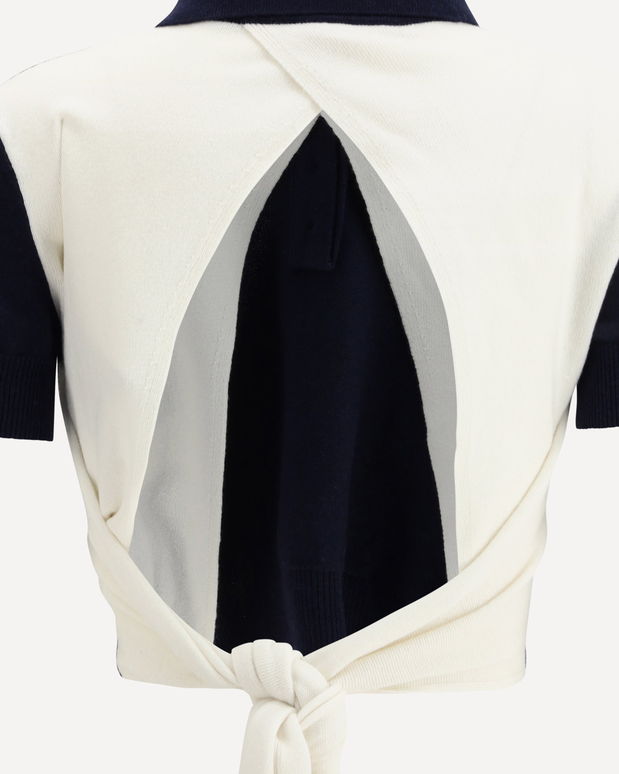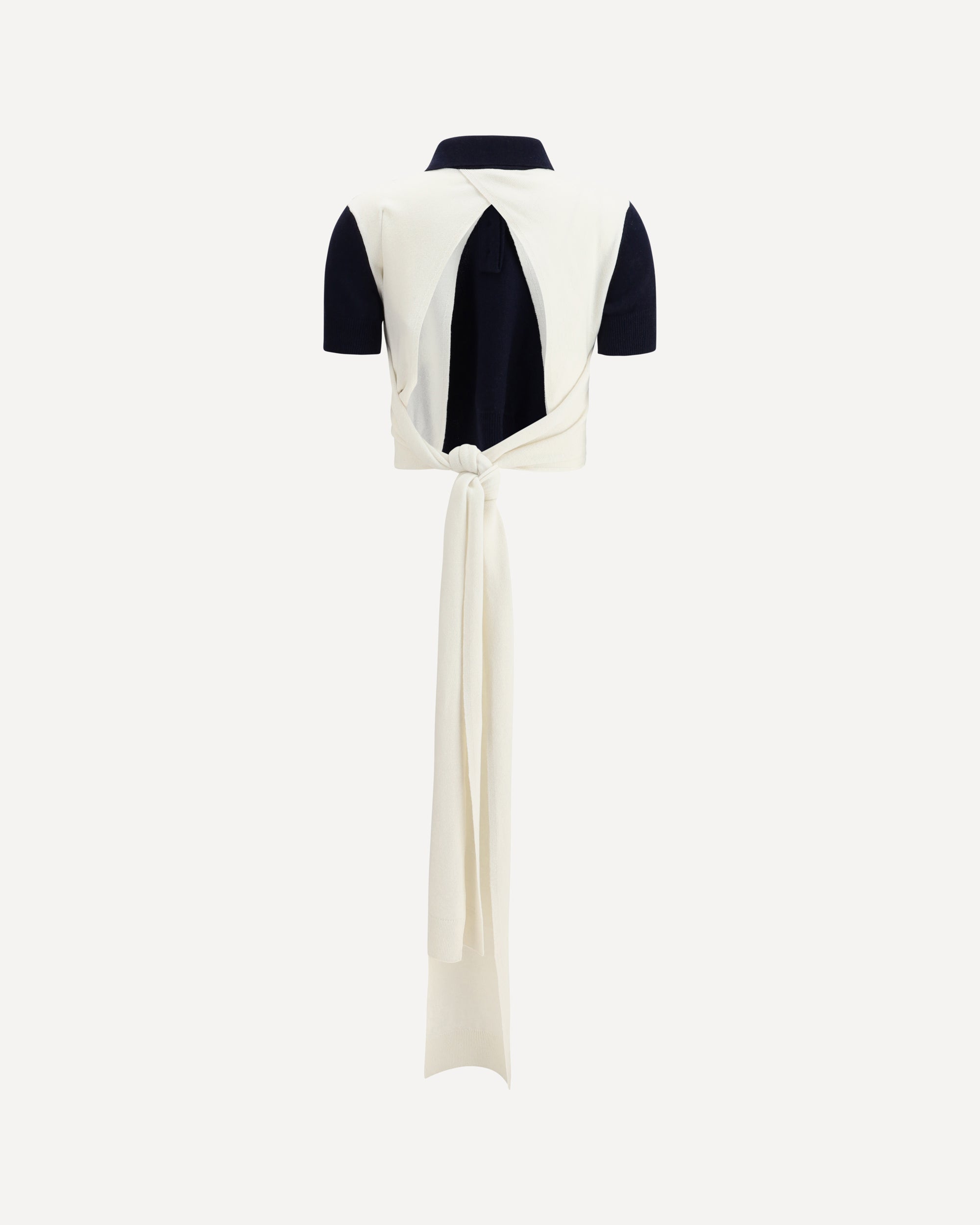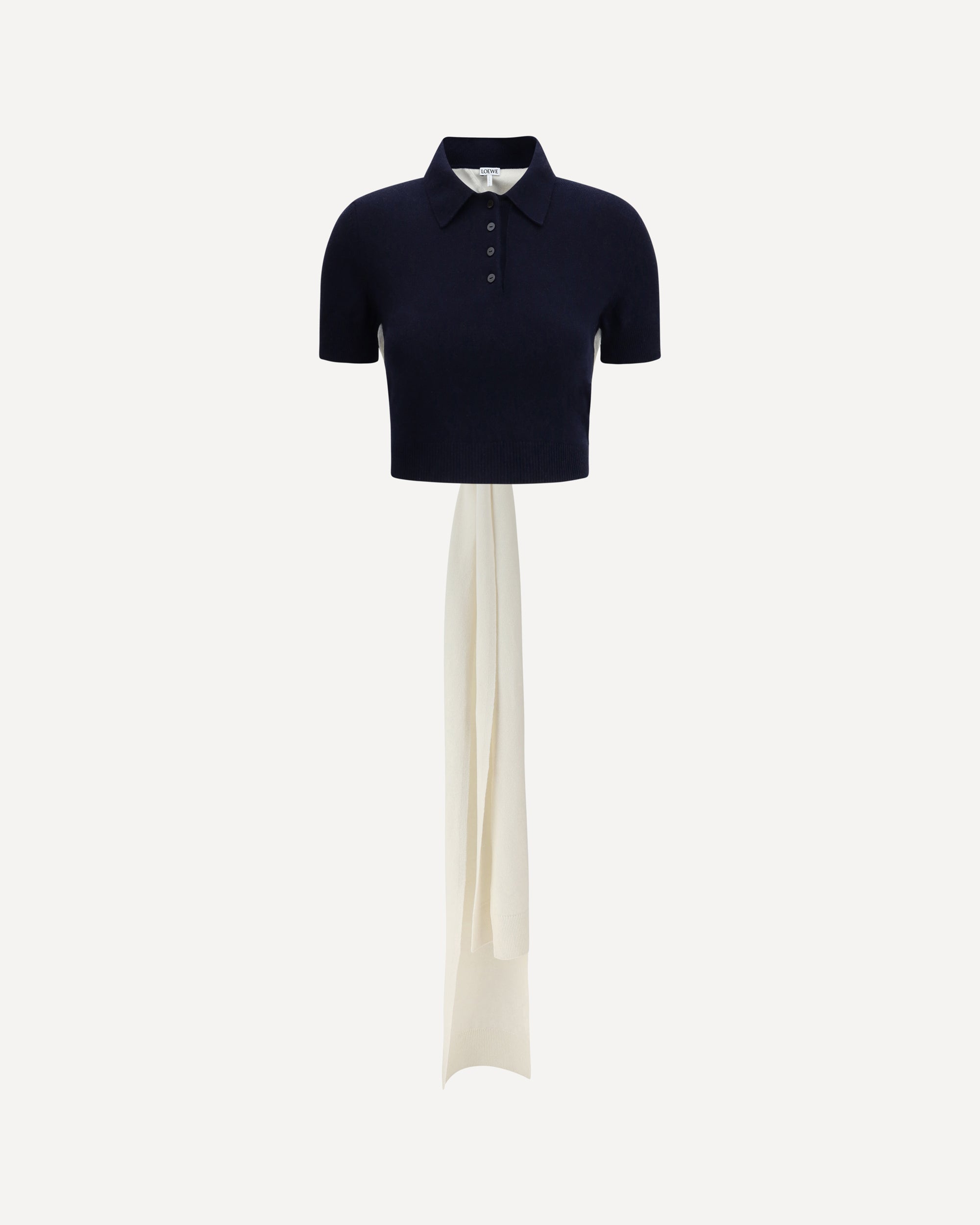 La Maglia Polo in lana di Loewe reinterpreta un classico dello stile sportivo con un tocco sofisticato e moderno. Il modello cropped a maniche corte presenta una chiusura frontale con tre bottoni, fedele alla tradizione della polo, ma si distingue per l’inaspettata apertura sul retro, che aggiunge dinamicità e femminilità al design. La cintura a contrasto, da annodare in vita, valorizza la silhouette e introduce un elemento grafico distintivo, in perfetto equilibrio tra eleganza e originalità.
