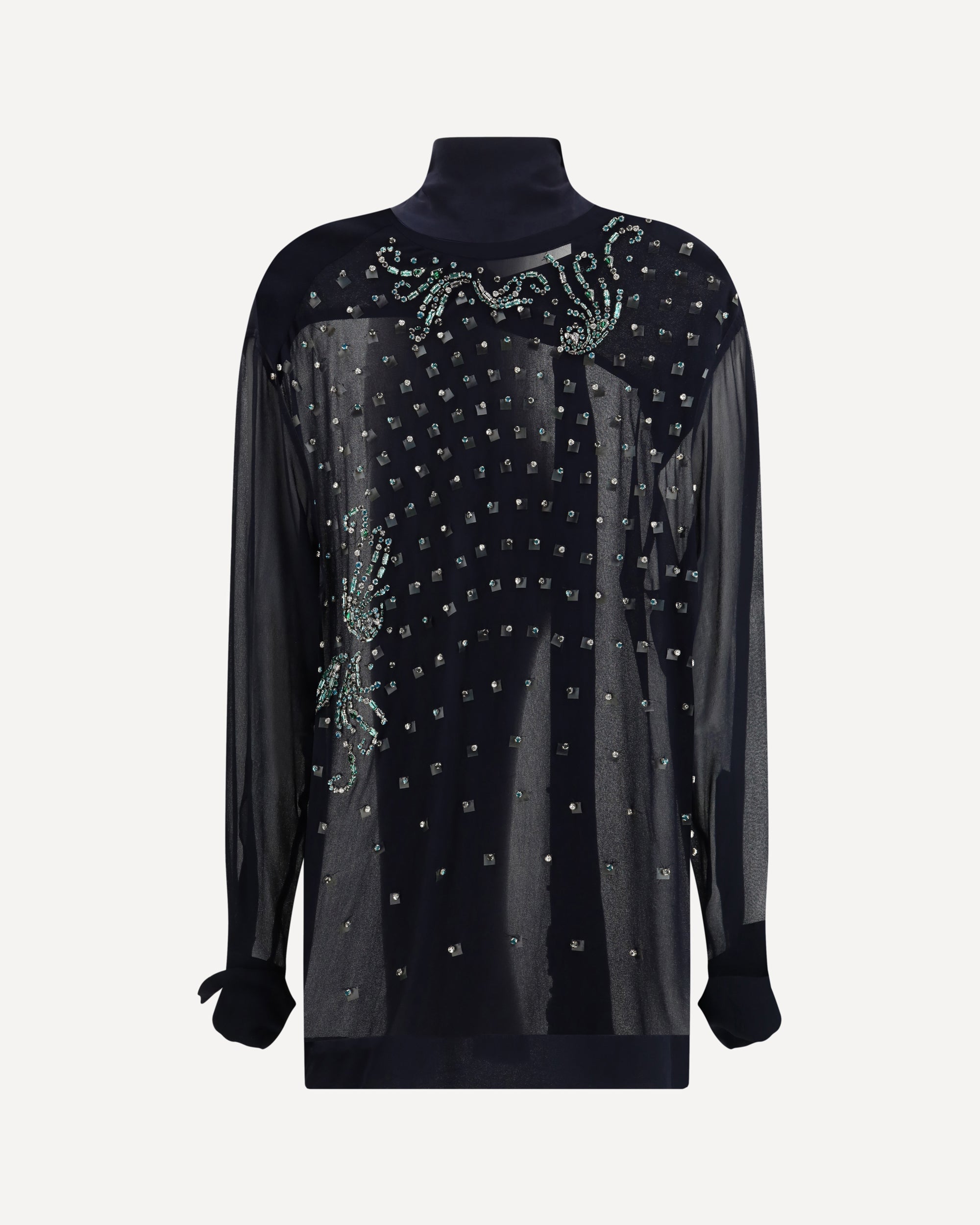 The Viscose Blouse with Pussy-Bow and Jewelry Embellishments by Dries Van Noten redefines elegance with a dramatic touch. The loose fit is enhanced by a bow-tied collar, adding refined femininity, while allover jewelry embellishments bring light and character to the design. Buttoned cuffs complete a creation that blends fluidity with sophistication, conceived for a distinctive and contemporary style.