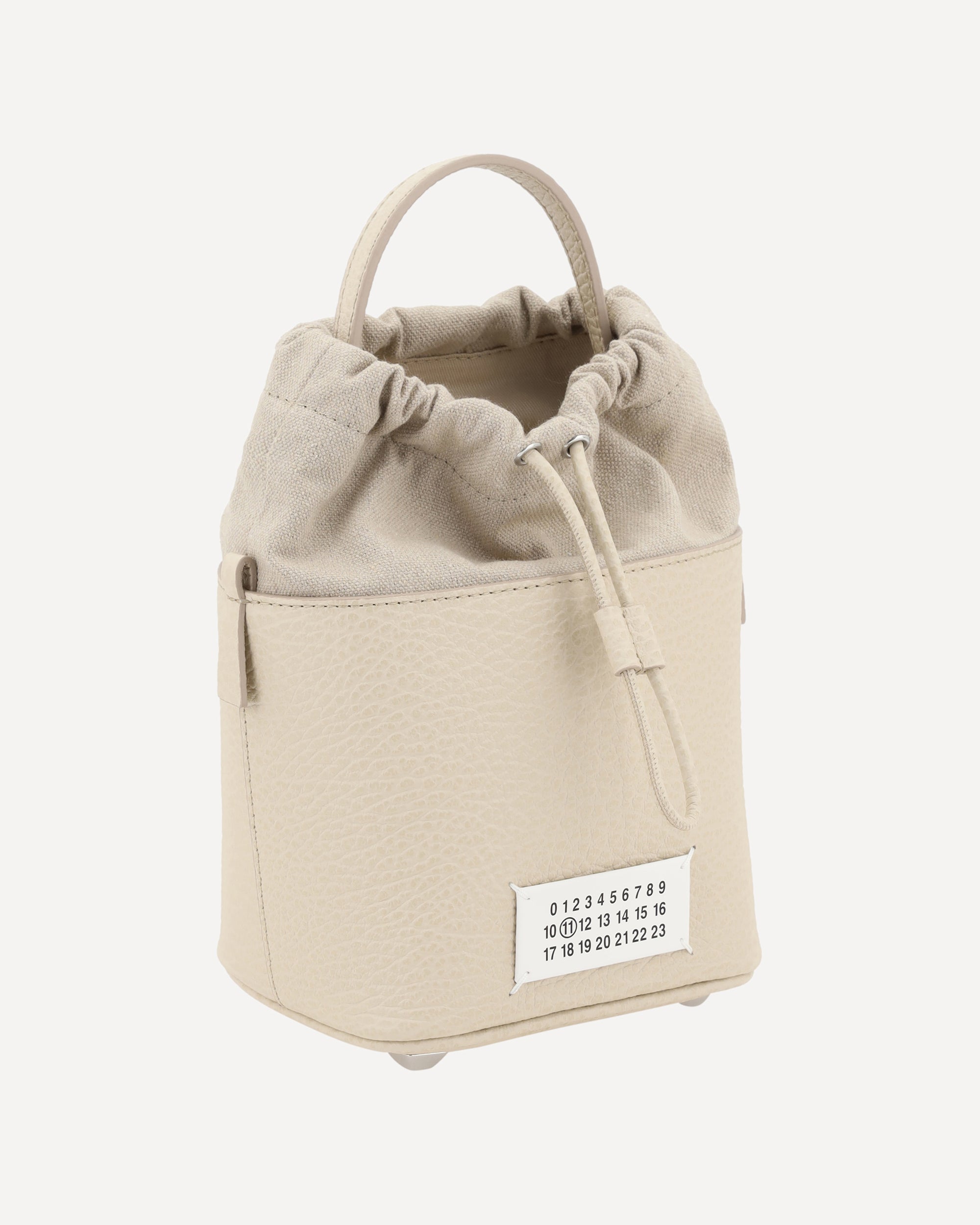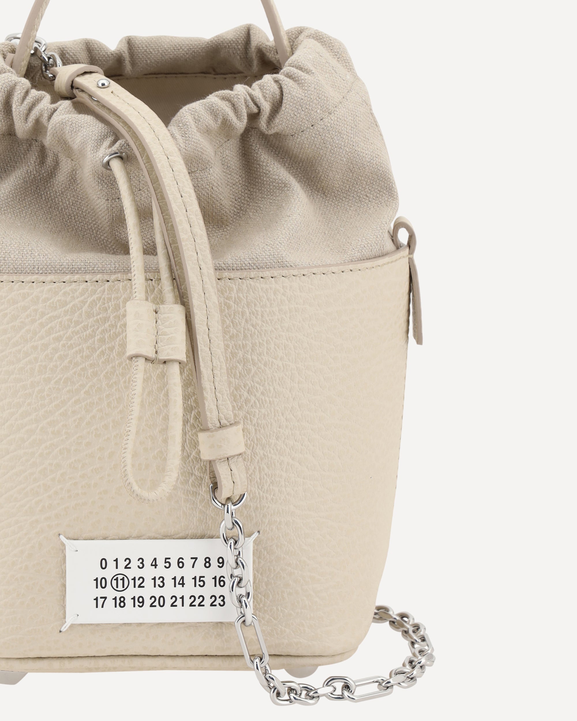 Calfskin Bucket Bag by Margiela, adjustable drawstring closure, top handle, removable chain shoulder strap, front logo tag, bottom purse feet, internal compartment.
