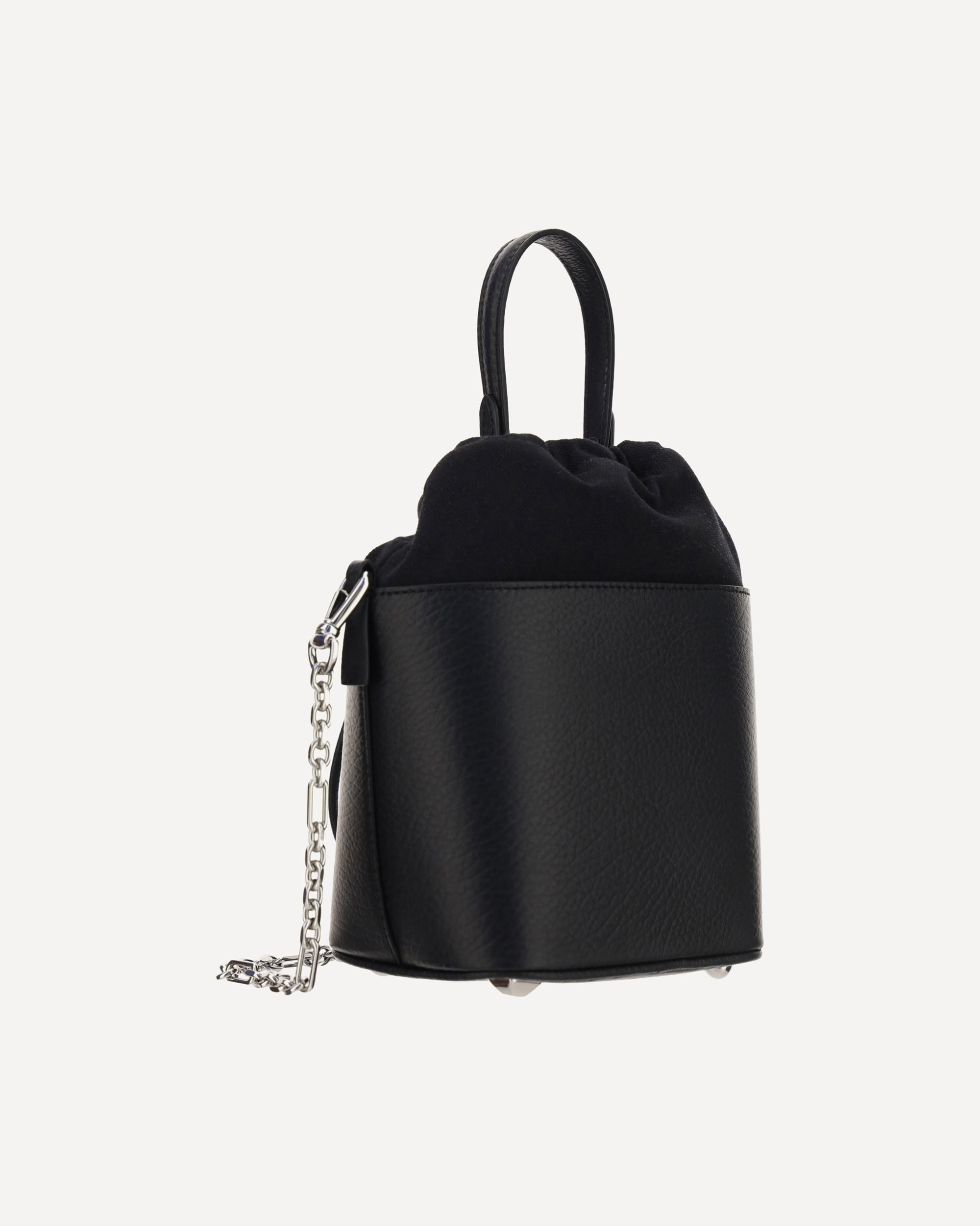 Calfskin Bucket Bag by Margiela, adjustable drawstring closure, top handle, removable chain shoulder strap, front logo tag, bottom purse feet, internal compartment.
