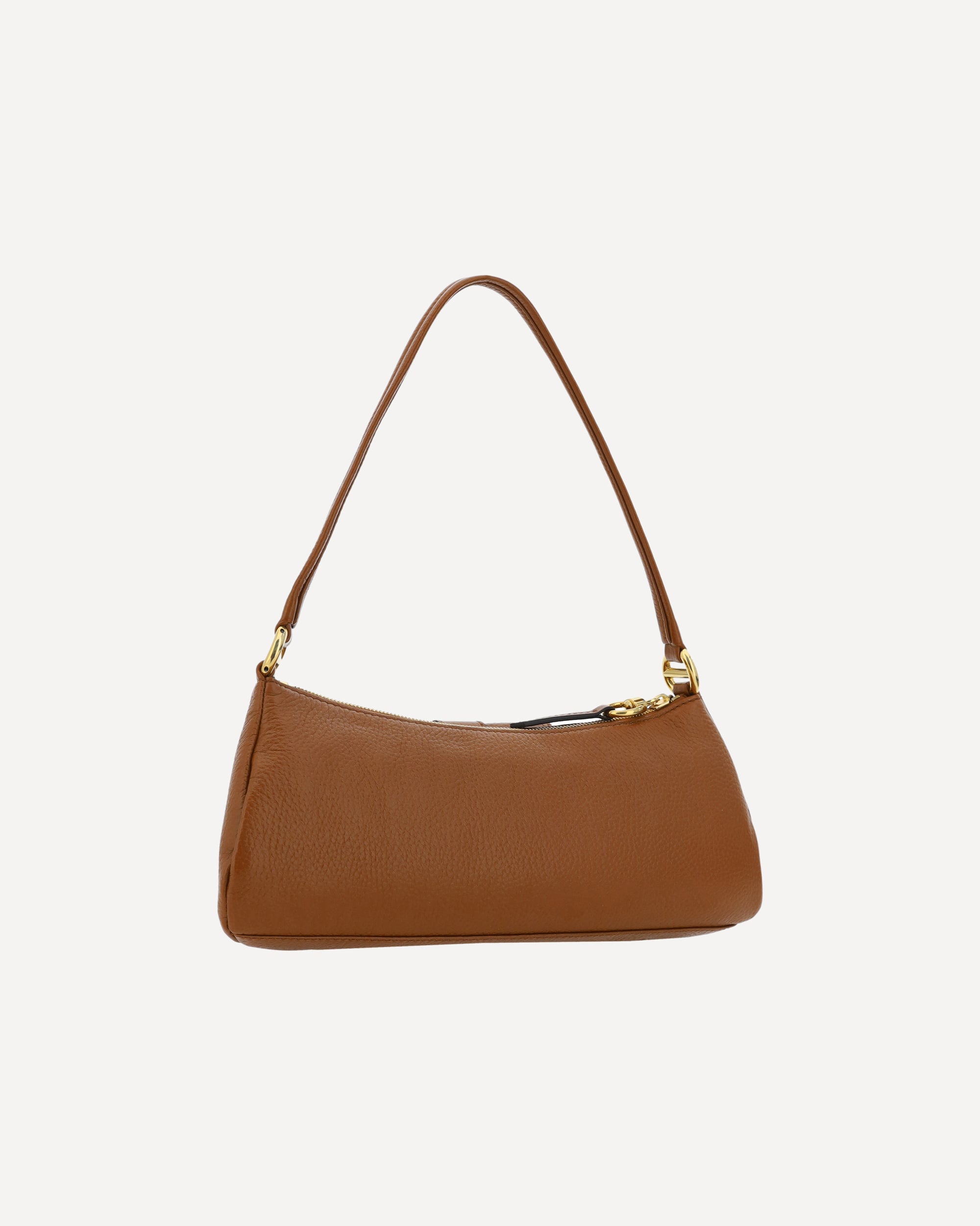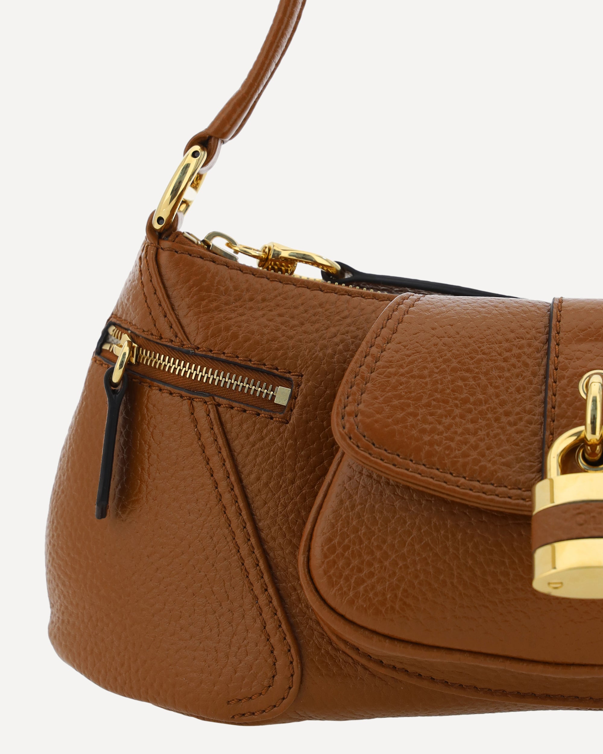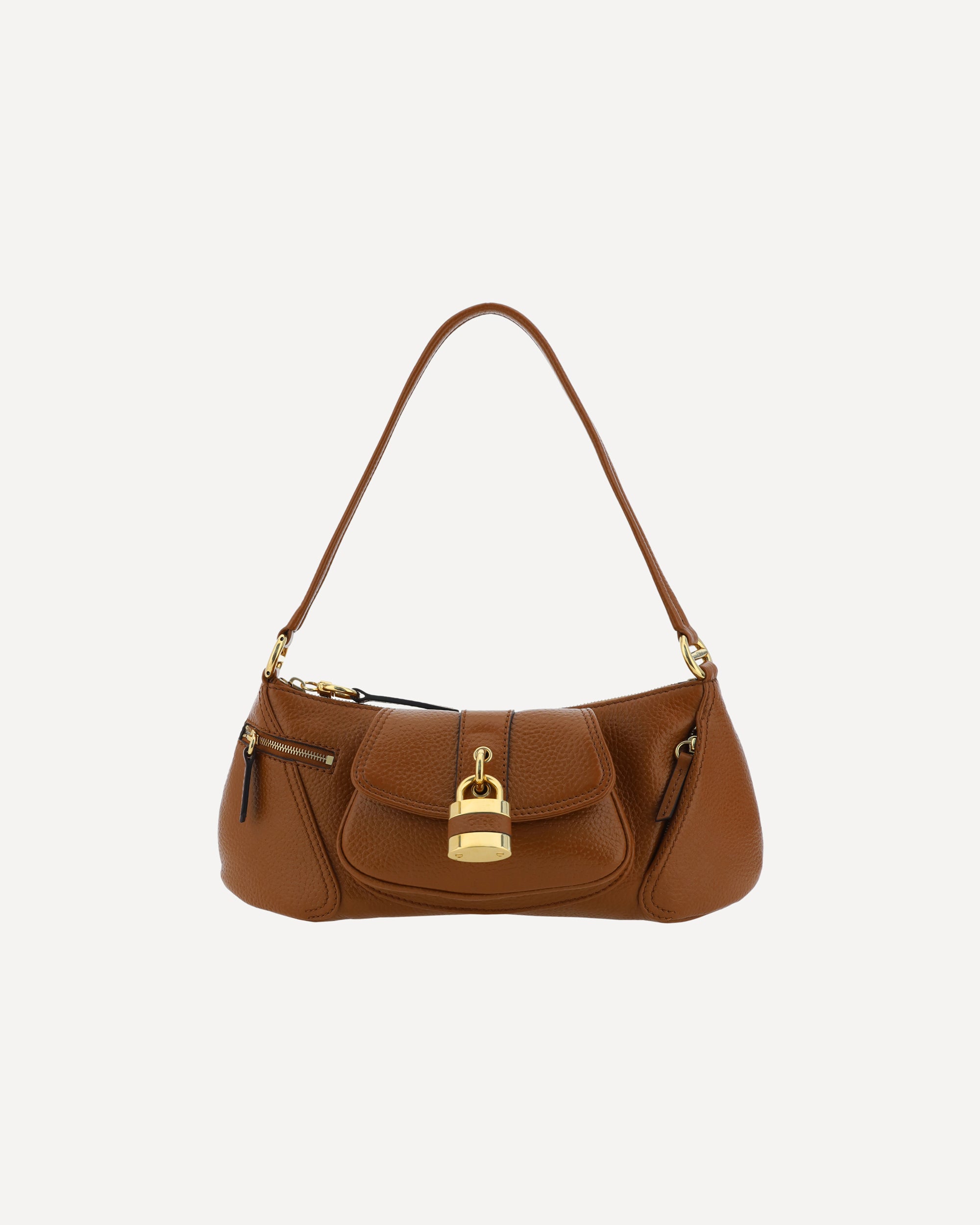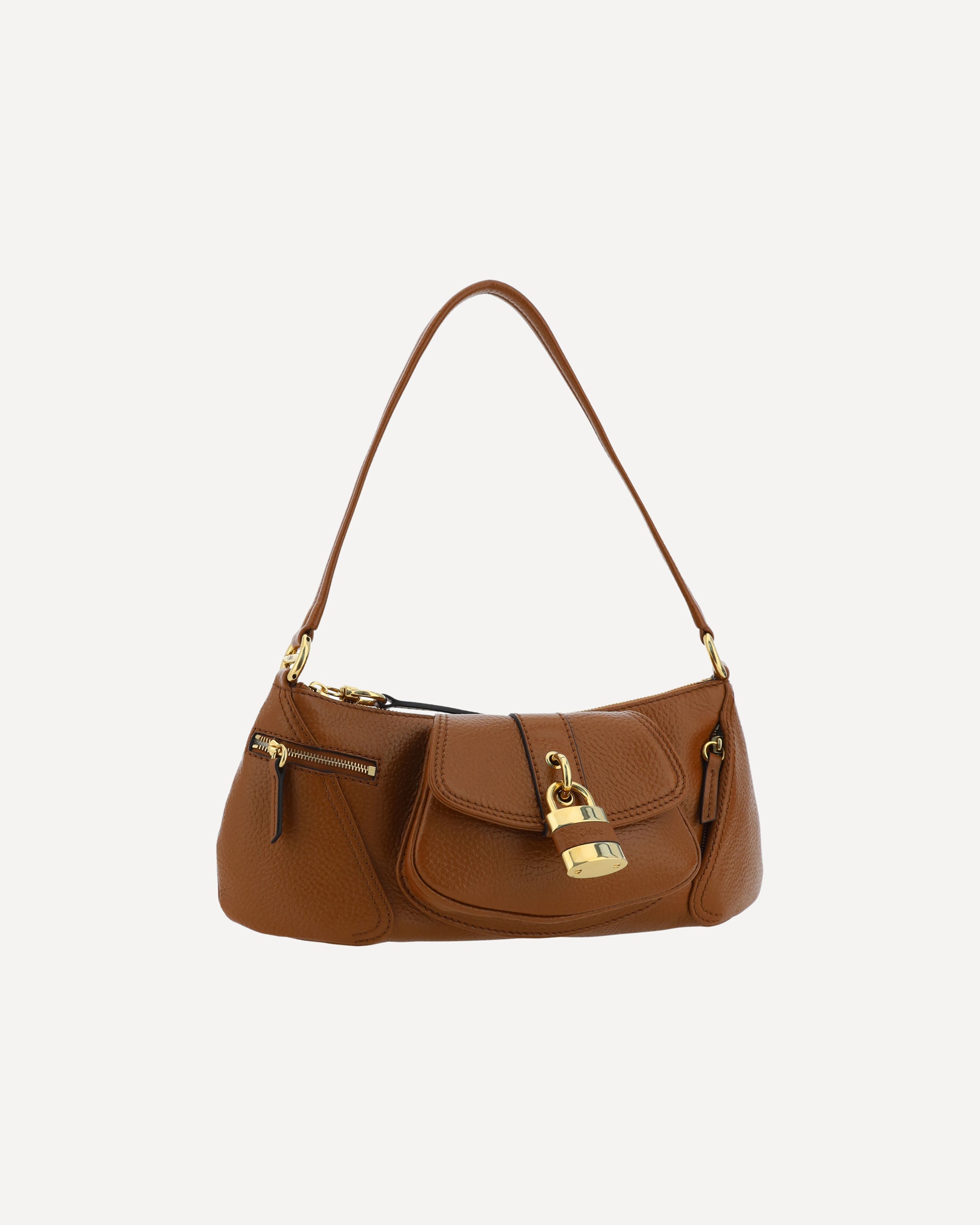 Leather 99 Shoulder Bag by Chloé, one flat handle at top, top zipper closure, two zippered pockets at sides, one patch pocket at top closable by padlock flap engraved with brand monogram, single compartment.