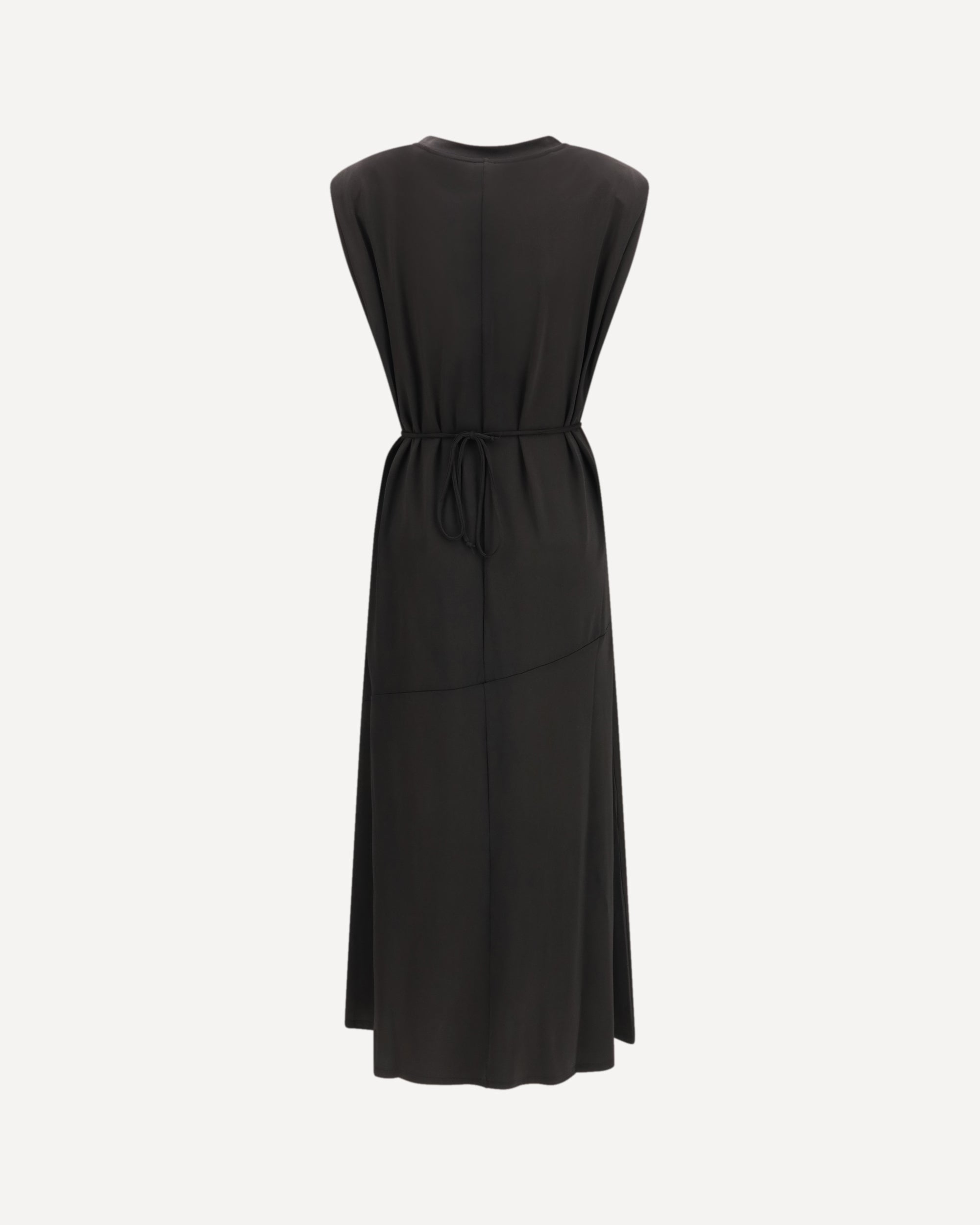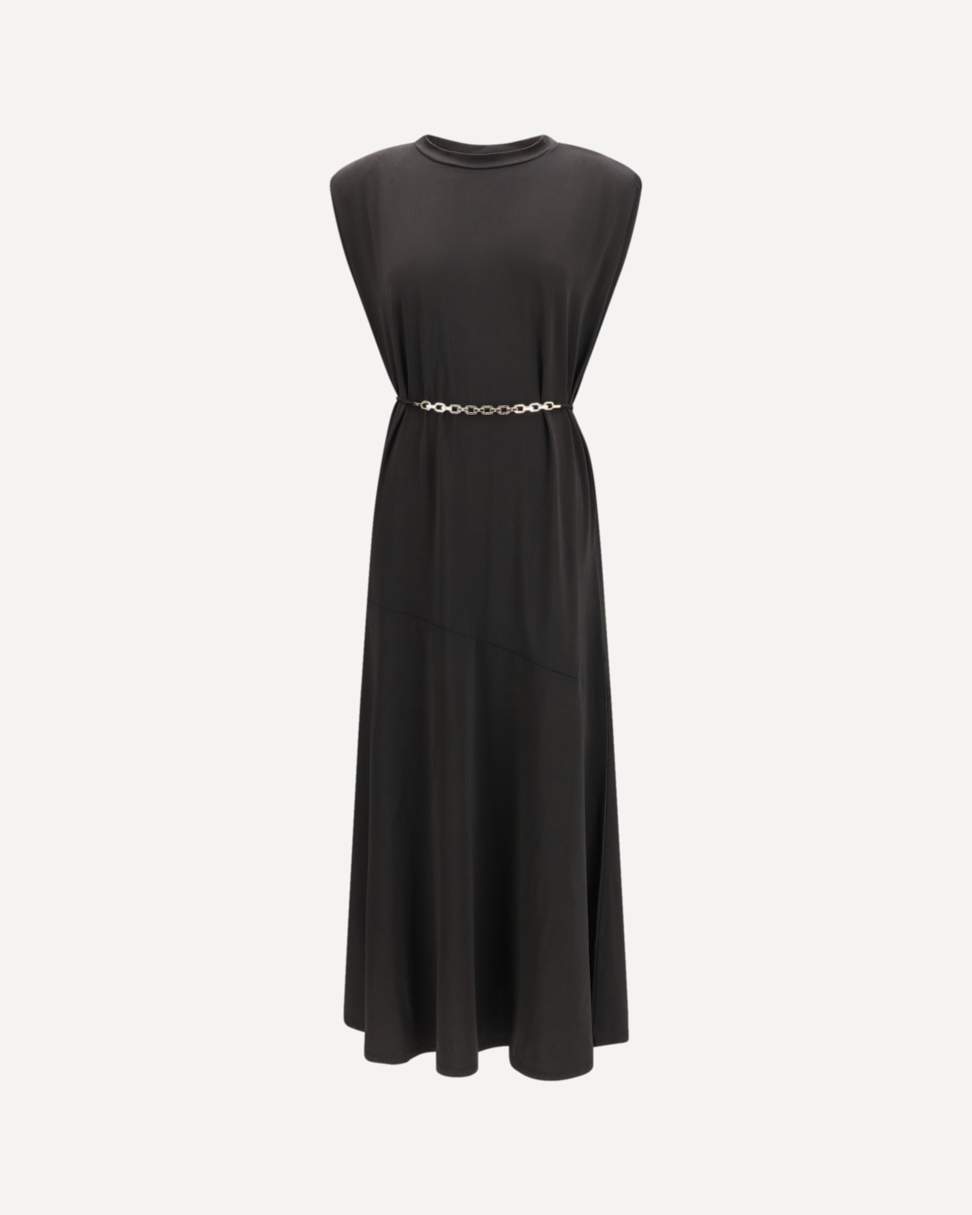 The Alexiana Jersey Dress by Pinko delivers contemporary elegance with bold character. Crafted from jersey, it features a crew neckline, sleeveless design, and padded shoulders that create a structured, feminine silhouette. The belt with metal detail enhances the waist with a distinctive touch. Fully Made in Italy, it is a refined piece perfect for modern, sophisticated styling.