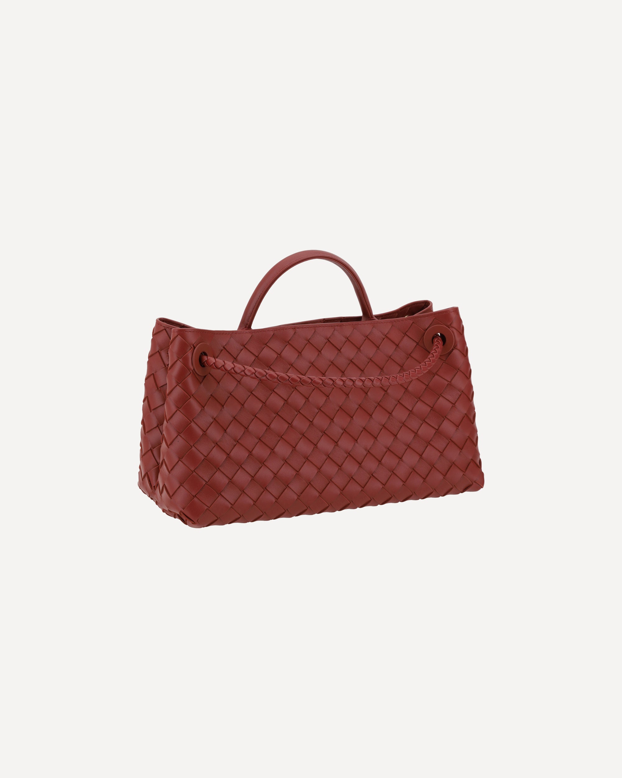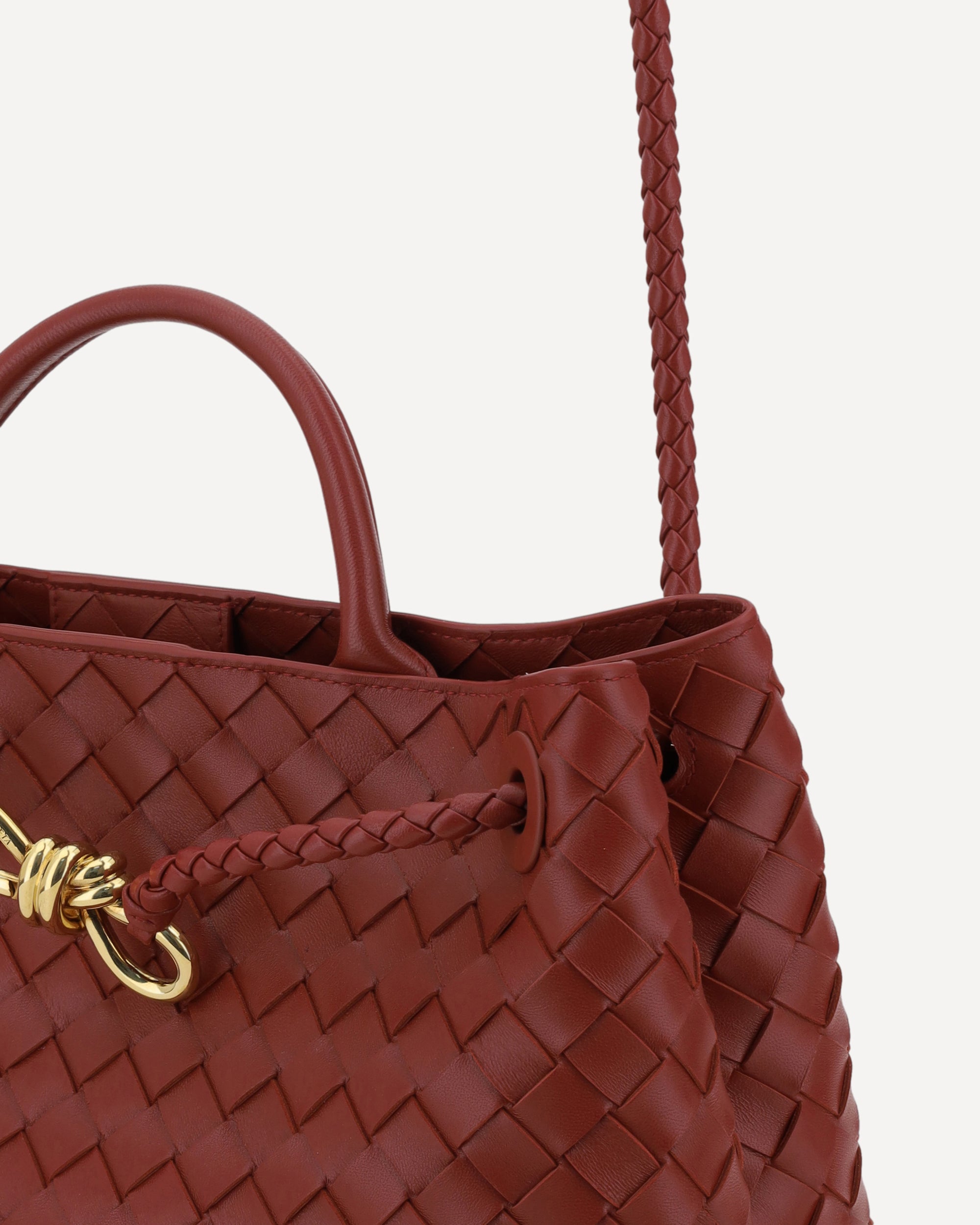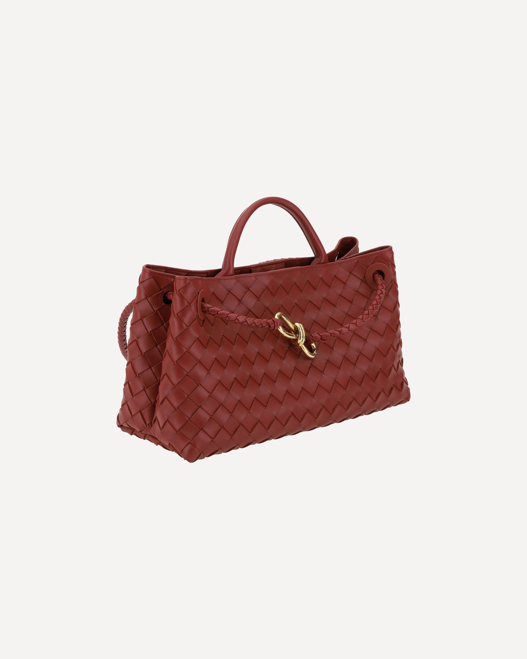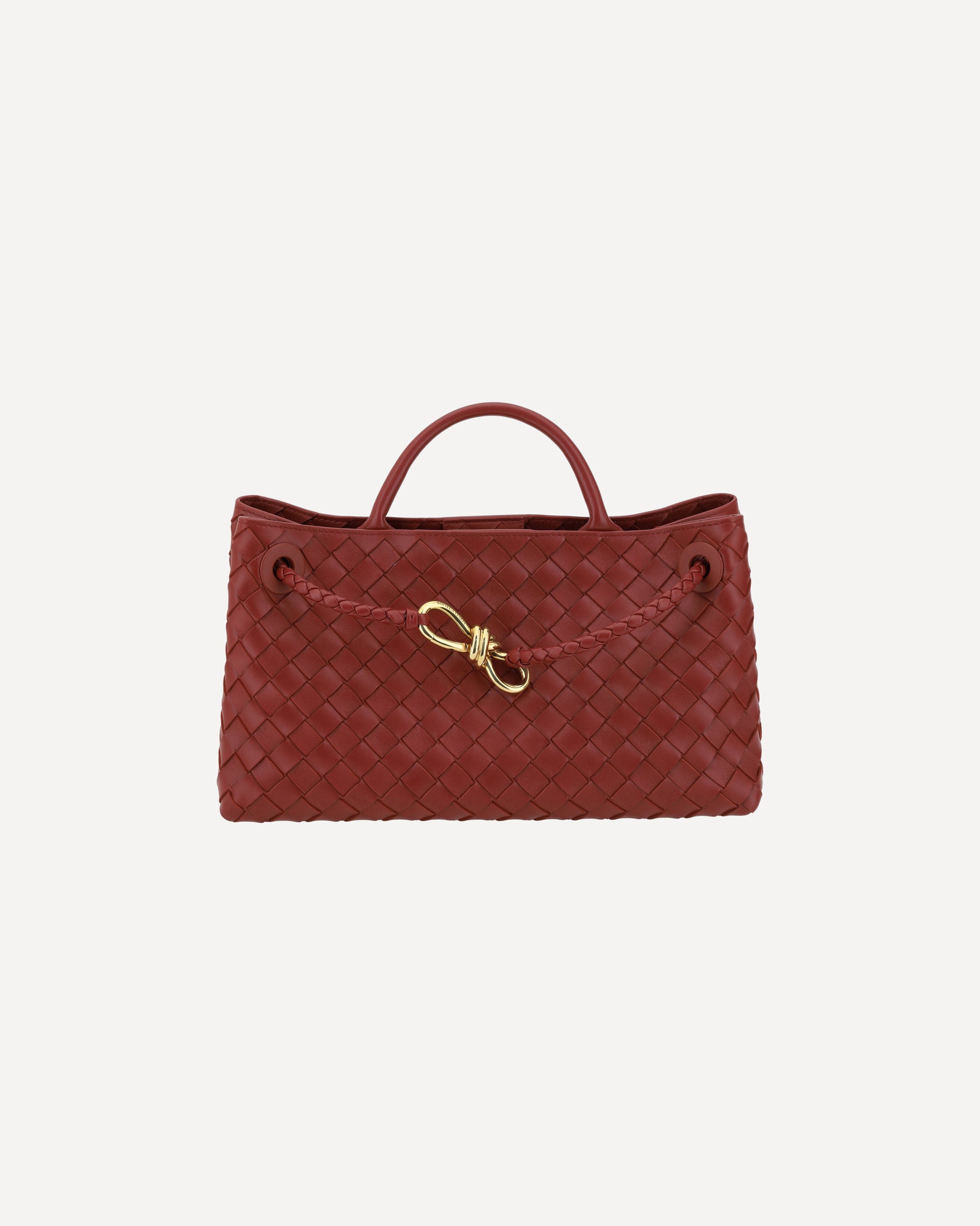The Andiamo East-West Lambskin Shoulder Bag is an elegant and refined accessory with a sliding shoulder strap and a tubular top handle, embellished with the iconic woven pattern, adds an extra touch of class. The interior is organized with two separate compartments, closed at the top by a magnetic button, providing security and practicality. The bag's distinctive design is enhanced by the brand's iconic woven motif, combined with a metal knot applied to the front panel, making the accessory easily recognizable and representative of the brand.
