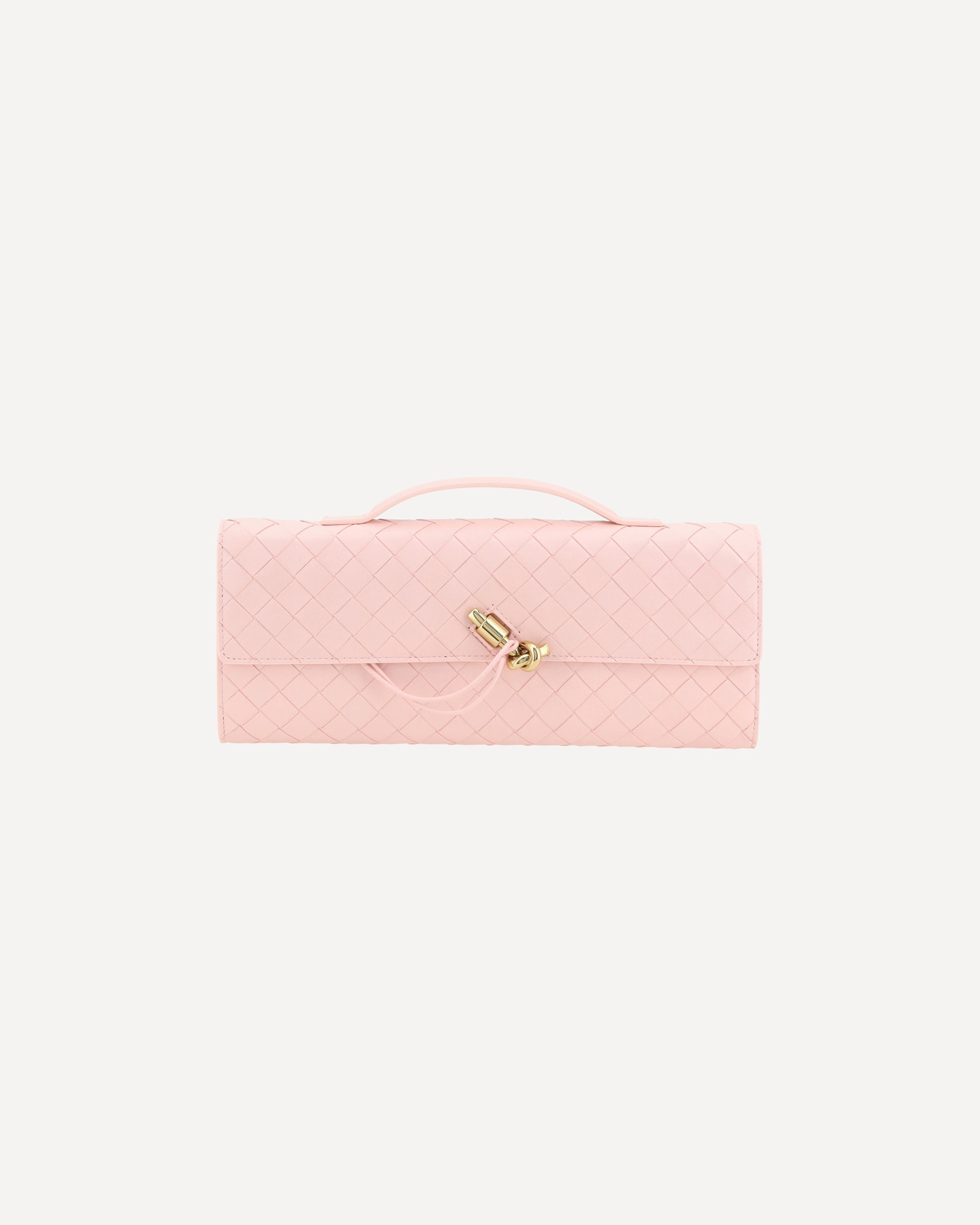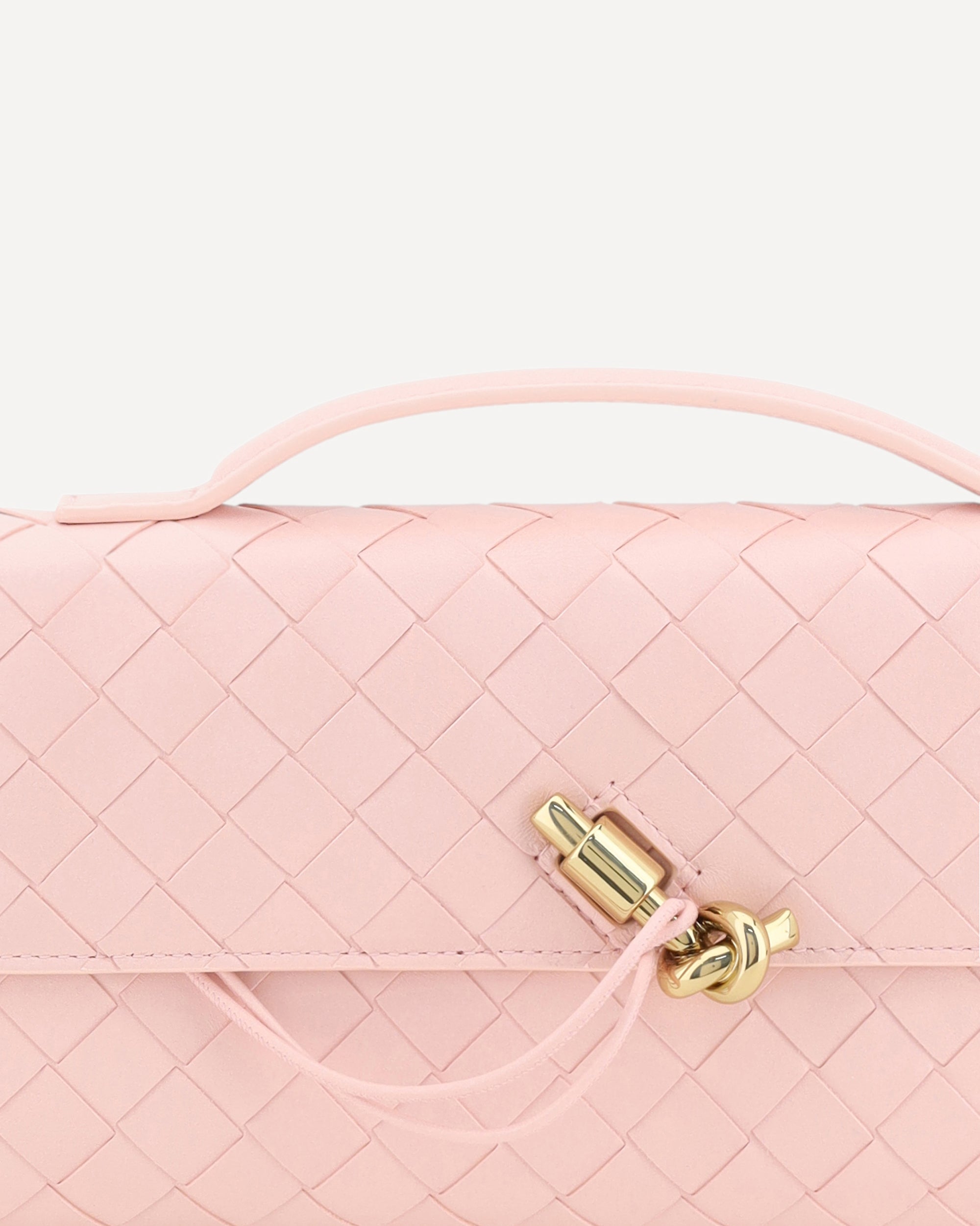 The Andiamo Handbag in lambskin leather by Bottega Veneta features a flat top handle that adds an elegant and practical touch. The bag features the brand's iconic woven workmanship, which defines its distinctive design. The front closure is secured by a magnetic flap and an iconic detailed Knot hook plated in antiqued brass. Inside, it offers a single compartment, perfect for holding everything neatly and elegantly.
