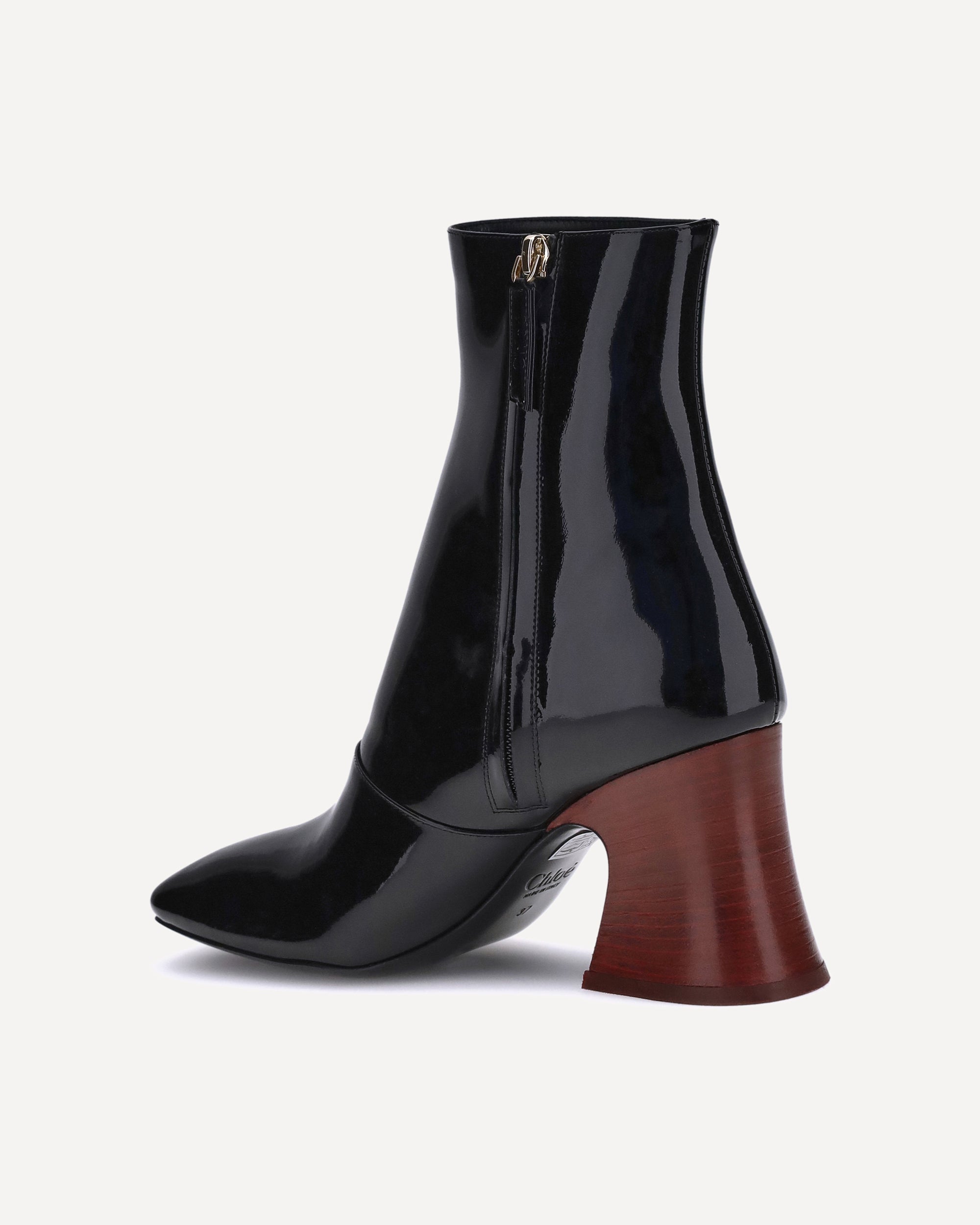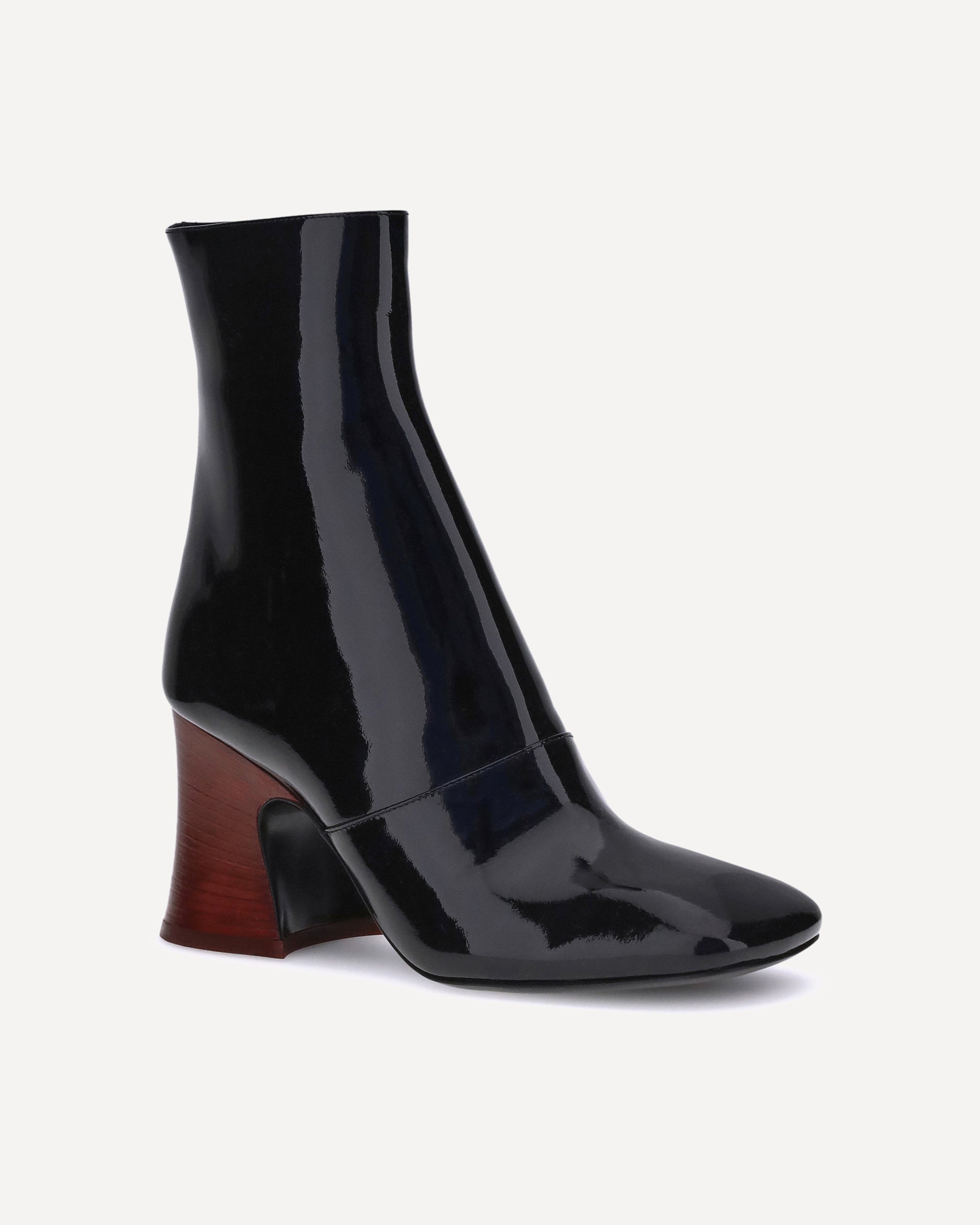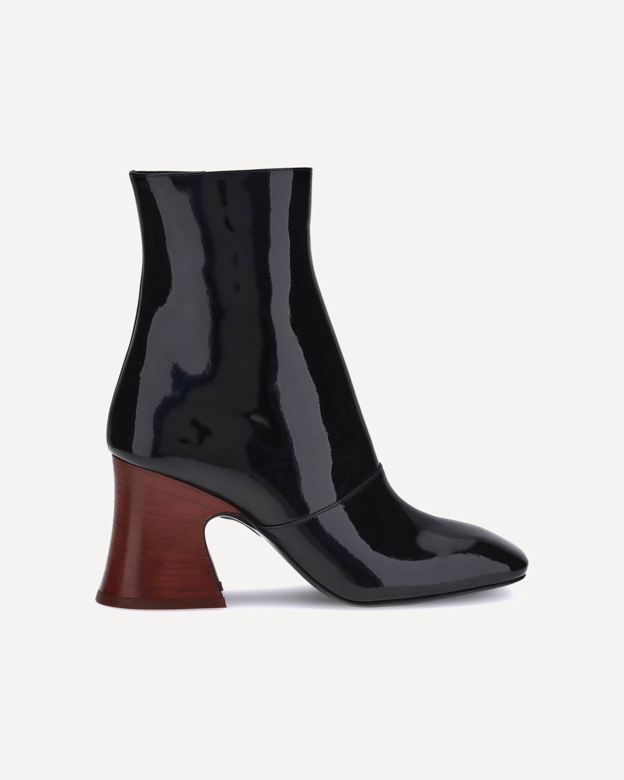 The patent leather ankle boots by Chloé combine elegance and character thanks to the square toe and the contrasting sculptural heel, a modern and distinctive element. The practical zip on the internal panel ensures a comfortable and linear fit, completing a sophisticated and contemporary design.