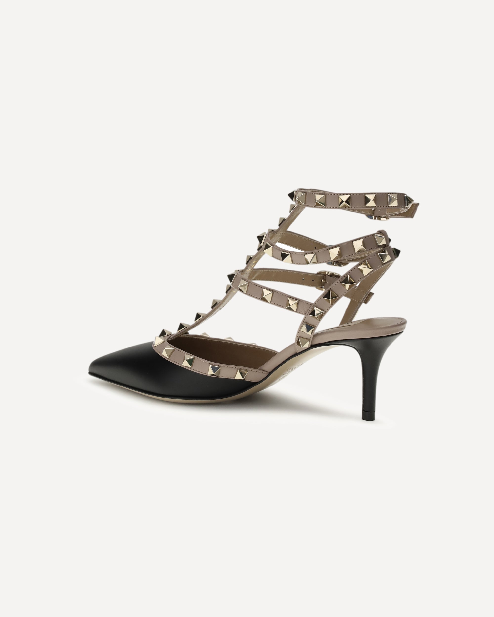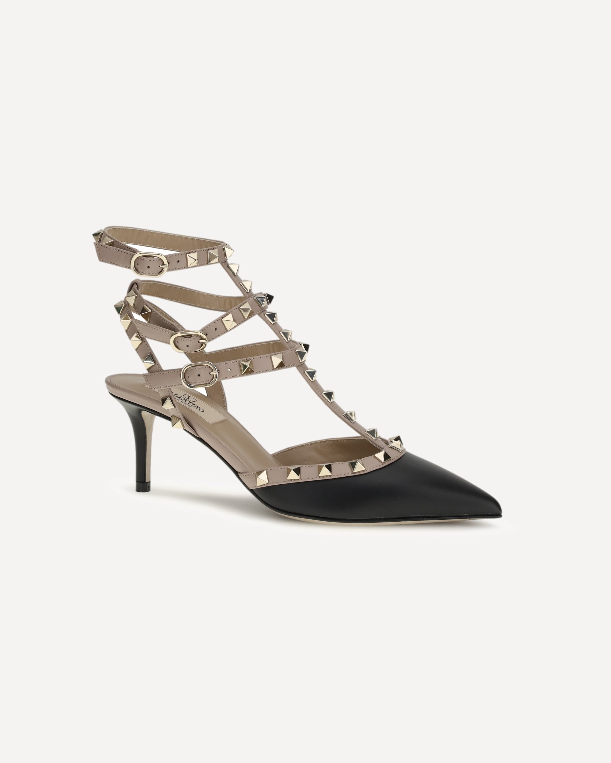 The Rockstud Pump by Valentino Garavani embodies confident elegance through its sleek pointed toe and slender ankle straps adorned with the iconic contrast studs. Crafted from smooth calfskin leather, it features an adjustable closure, a leather sole, and a mid-height stiletto heel that elevates the silhouette with effortless refinement.