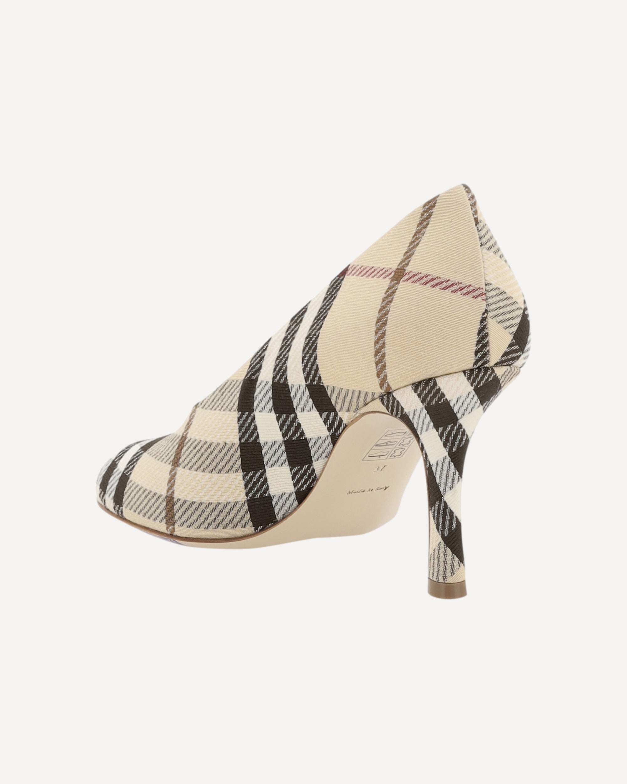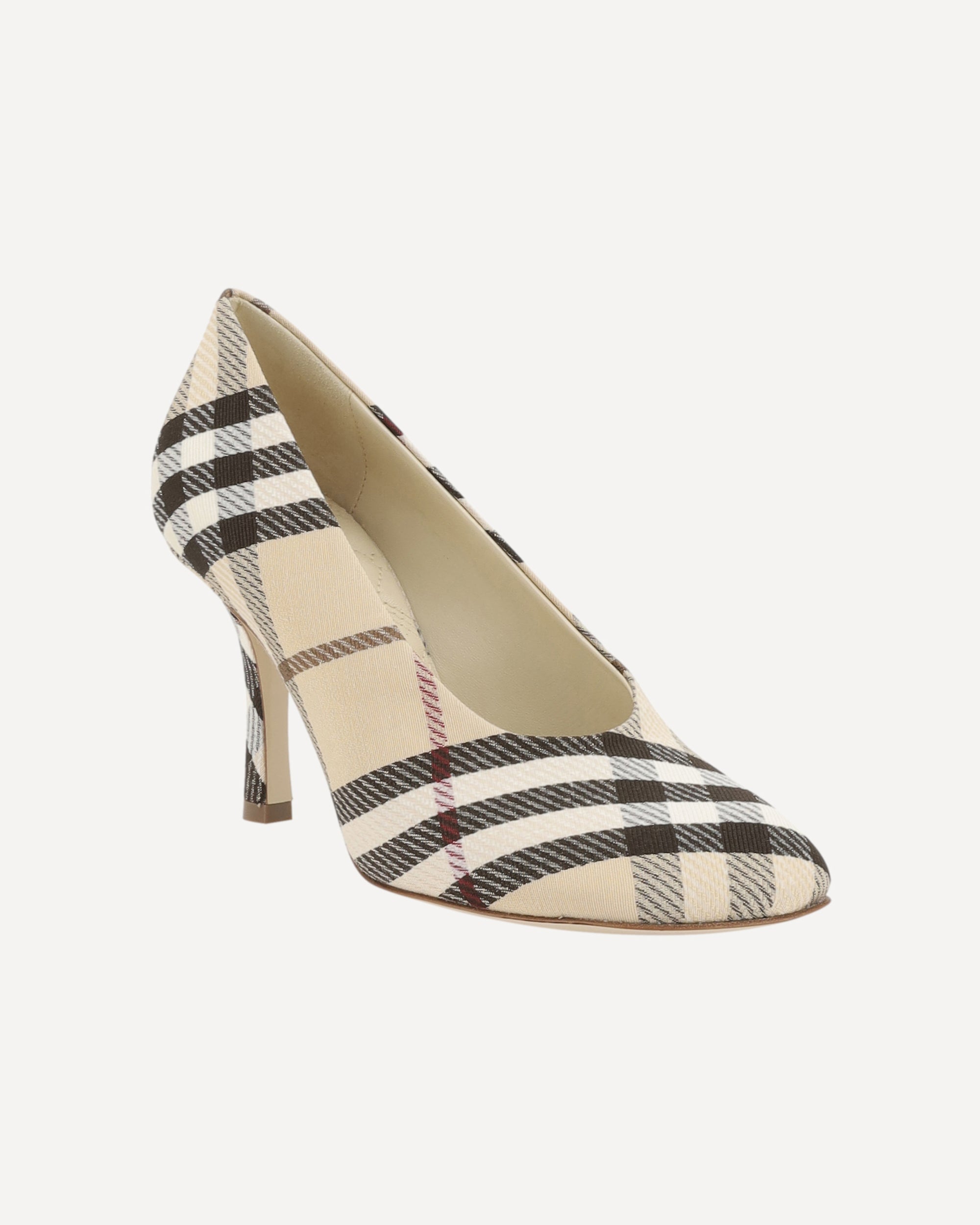 Burberry's Archivio Check Baby Pumps combine classic elegance with the brand's signature details. With a round toe for comfort and style, these pumps feature a stiletto heel that slims the figure. The iconic Archivio Check pattern, a timeless symbol of the house, decorates the upper, while the sole features the Equestrian Knight design, a tribute to the brand's equestrian tradition. These pumps are perfect for those seeking a mix of sophistication and exclusive design, ideal for any formal or evening occasion.