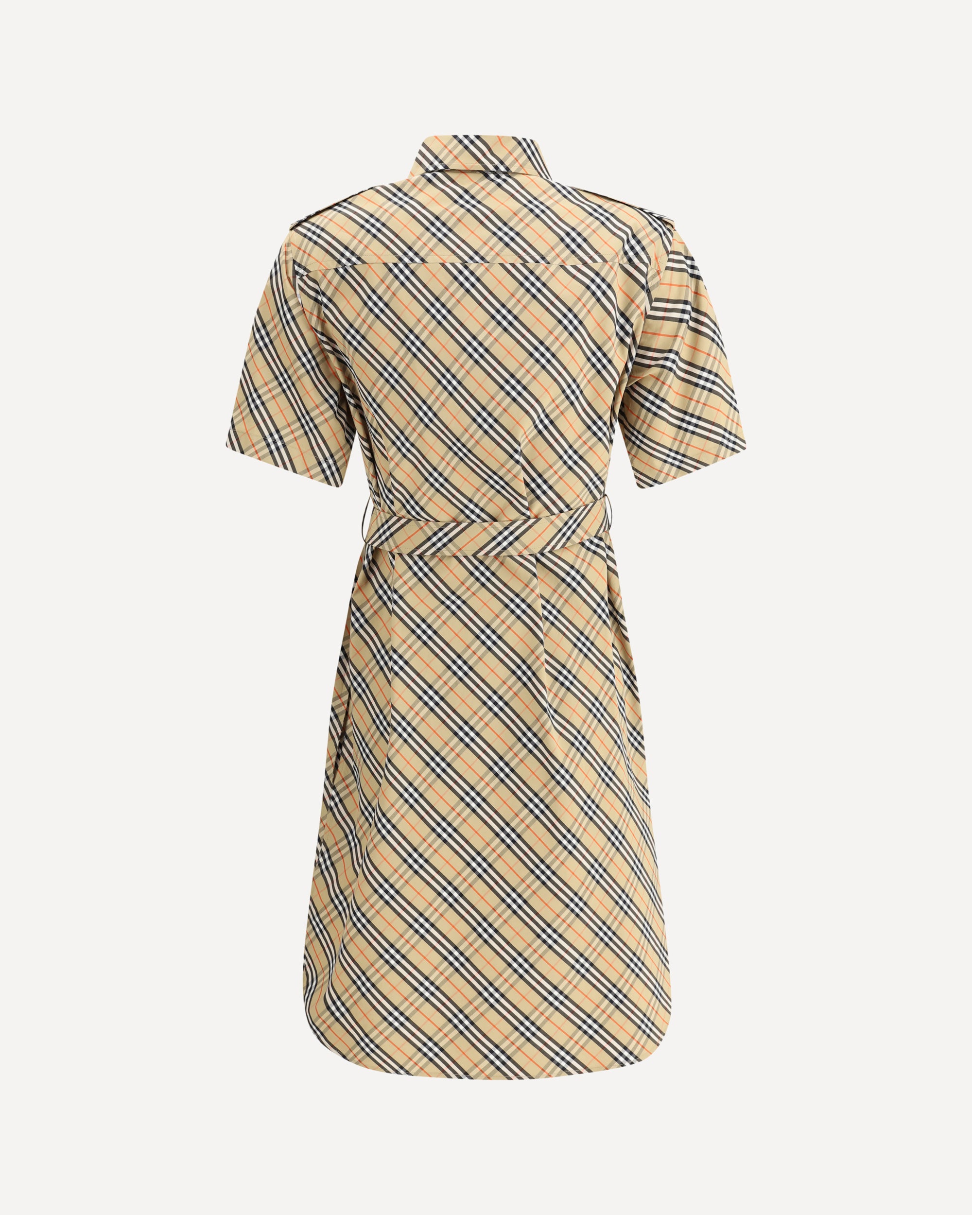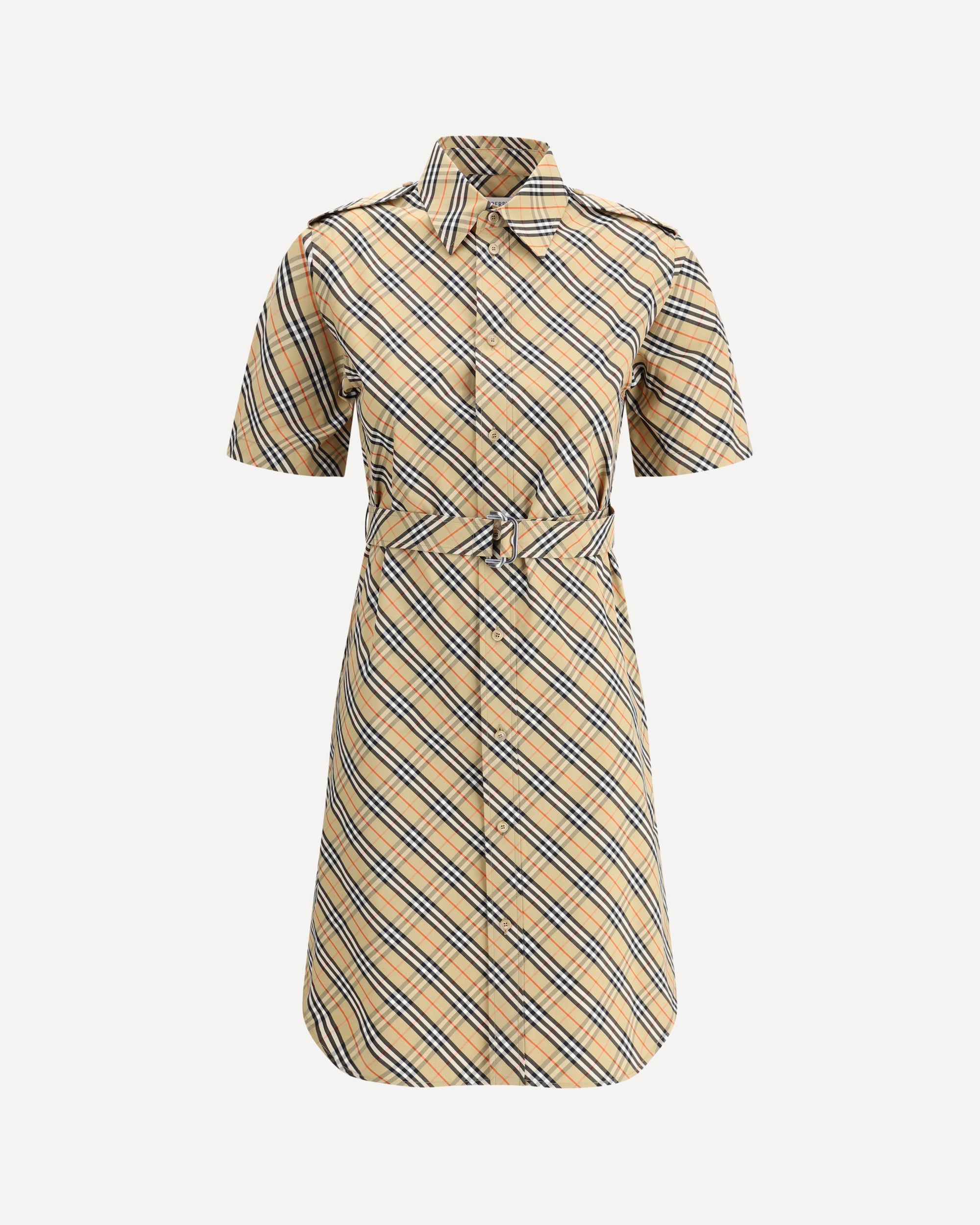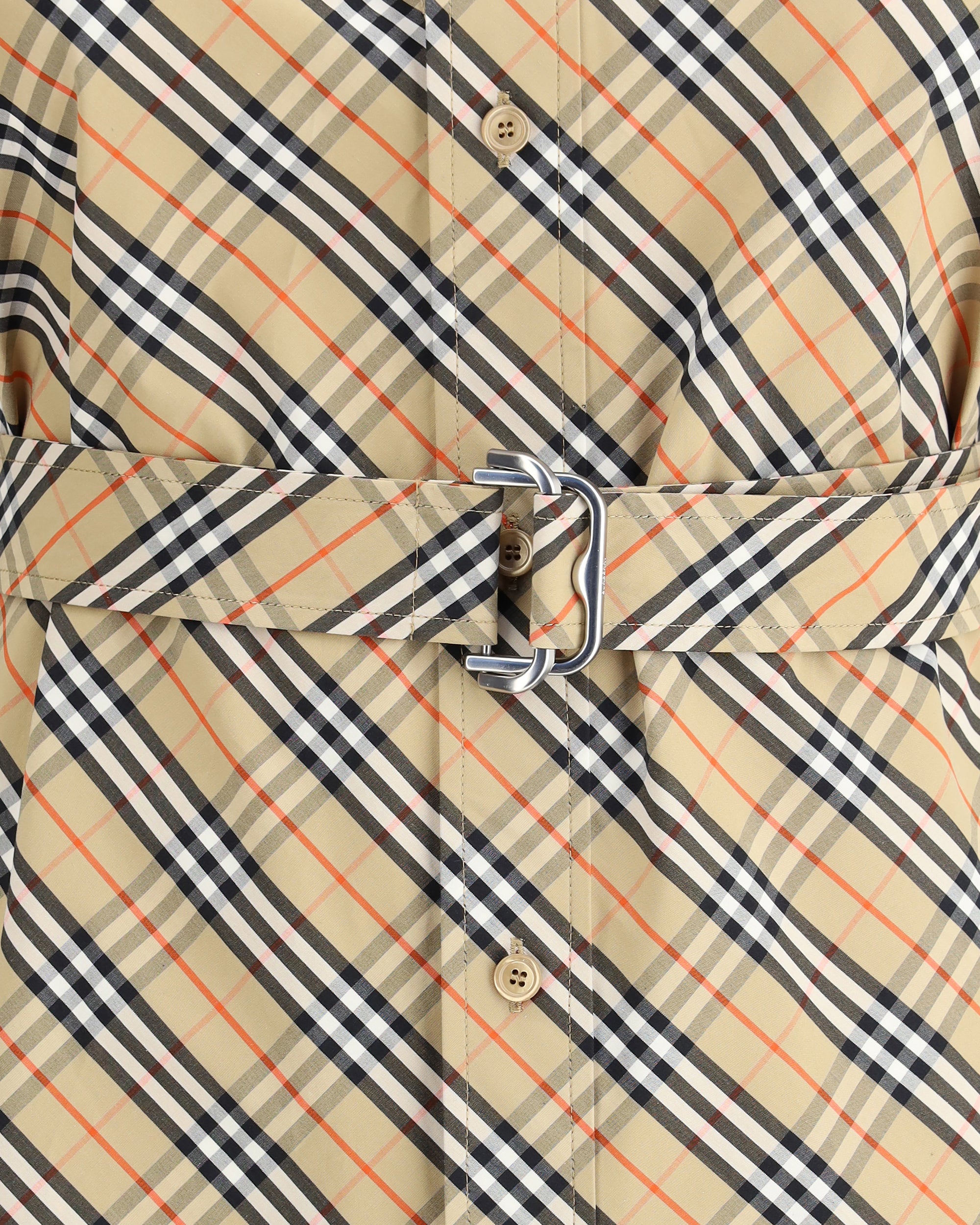 The Burberry Archivio Check shirt Dress is the perfect mix of elegance and practicality. The short-sleeved design and classic collar lend a sophisticated yet fresh air, ideal for warmer seasons. The front button fastening adds a refined detail, while the matching, adjustable sash with belt allows you to personalise the fit, emphasizing the silhouette. Belt loops at the waist offer additional styling possibilities. The brand's iconic check print adds a touch of classicism, making this dress a versatile and timeless piece.