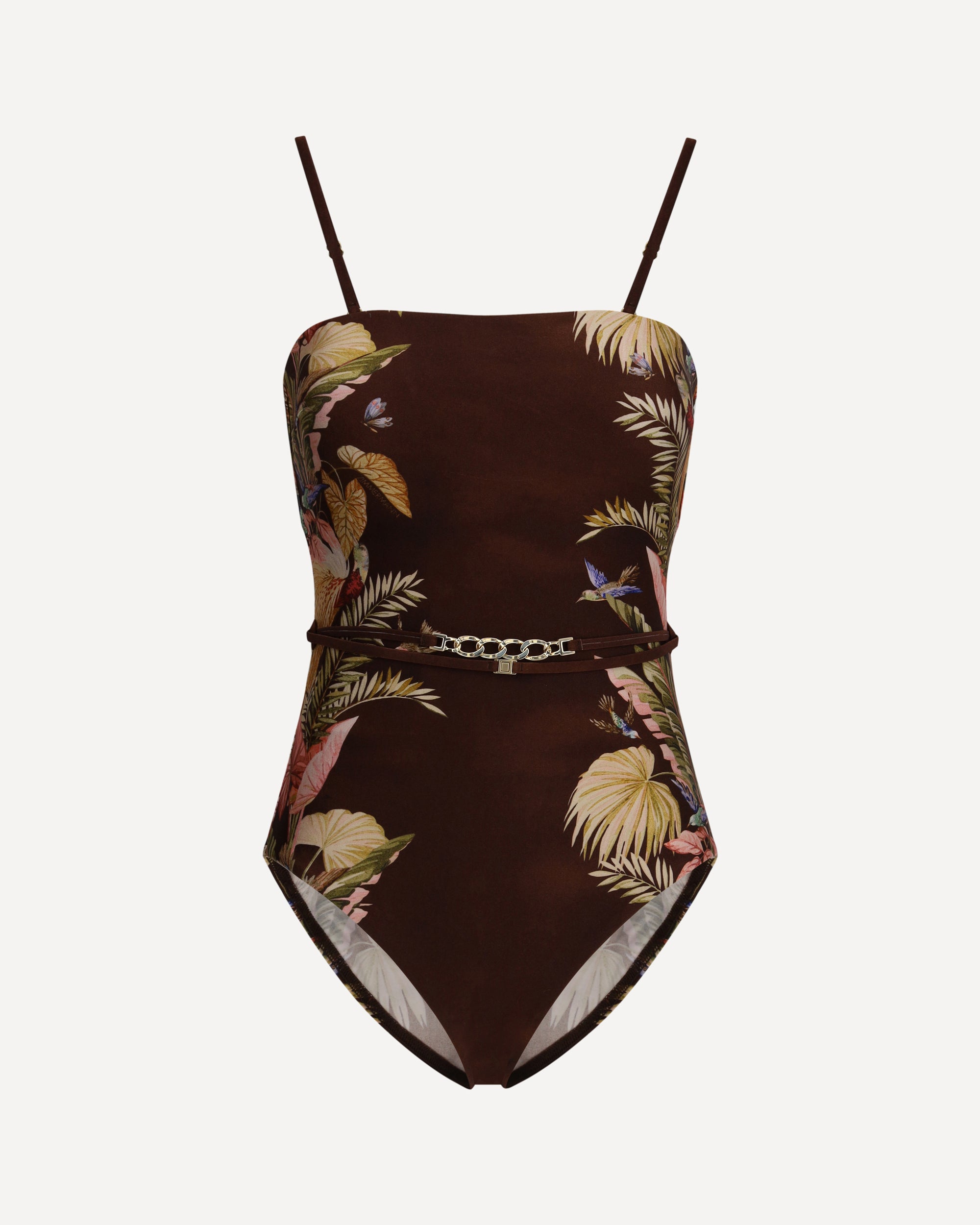 The Ascension one-piece Swimsuit by Zimmerman is a bold and elegant choice designed for those who like to stand out even under the sun. Featuring a vibrant floral pattern, the bandeau style with balconette bra offers optimal support and a sensual shape, enhancing the neckline. The design is further enhanced by reinforcements at the side seams that ensure a perfect fit and define the silhouette. The non-slip elastic front ensures that the swimsuit stays in place, while the removable chain belt adds a touch of sophistication and a luxurious accent.