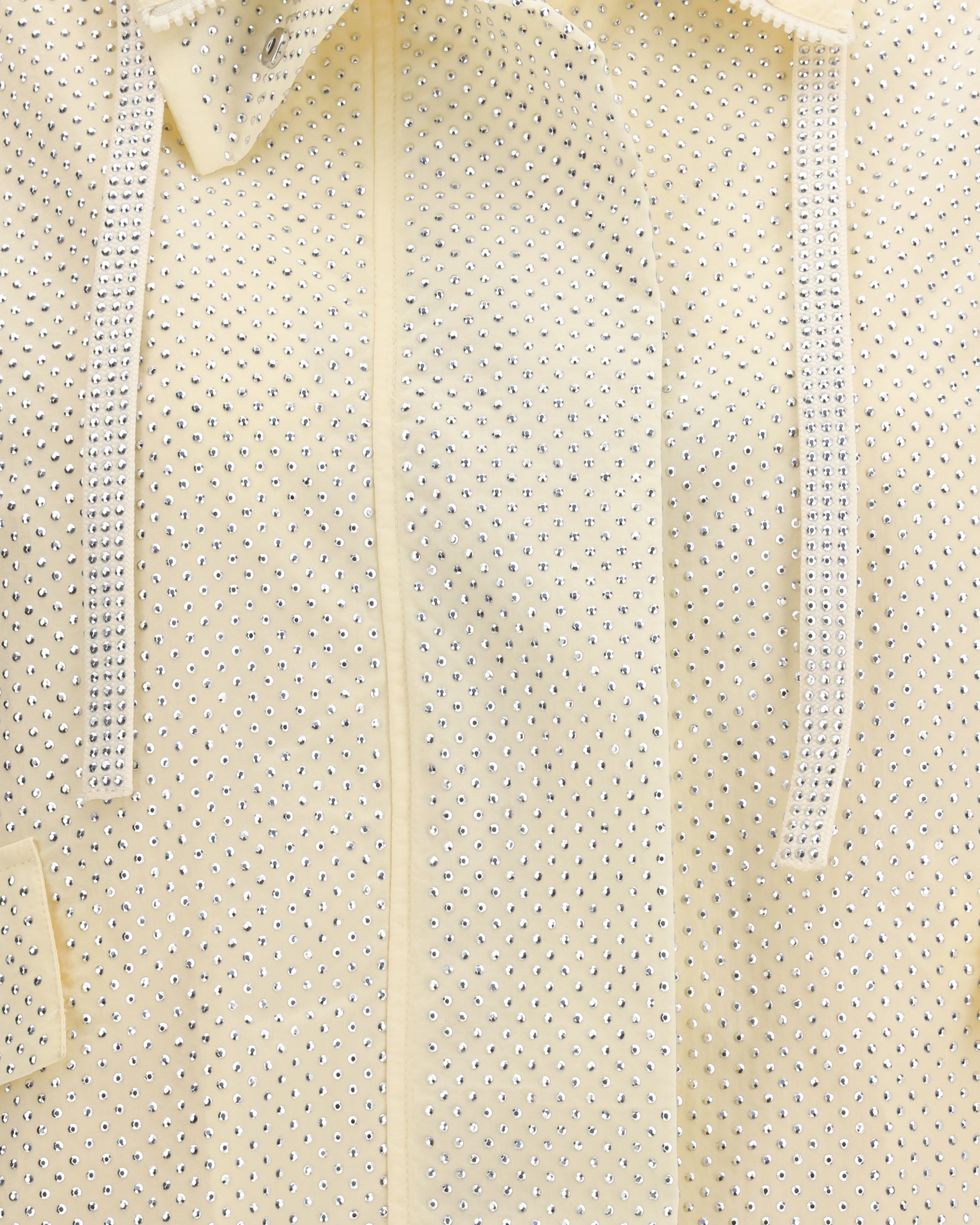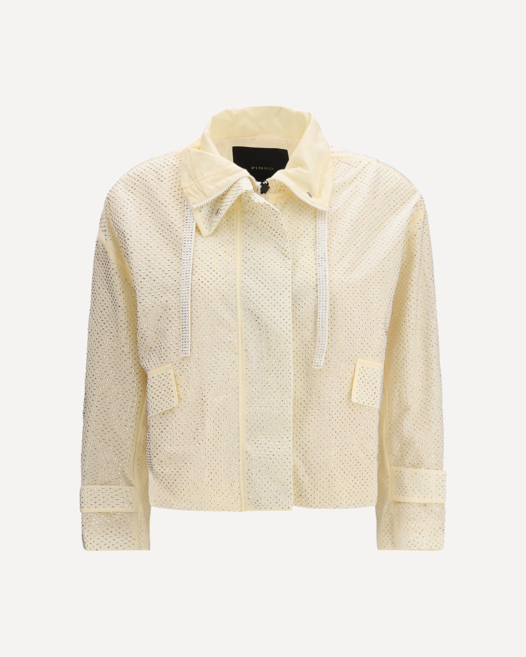 The Babette Jacket by Pinko is a bold and refined piece, made from technical canvas with a slightly crinkled effect that gives it a unique character. The shower of micro rhinestone studs all over adds a sparkling touch, capturing the light with every movement. The model stands out for its high collar with adjustable drawstring, also featured at the bottom, and for the flap pockets on the front. The fabric straps with hook-and-loop fasteners on the cuffs and the zip closure hidden by a maxi flap complete the design, making this jacket a perfect blend of style and functionality.