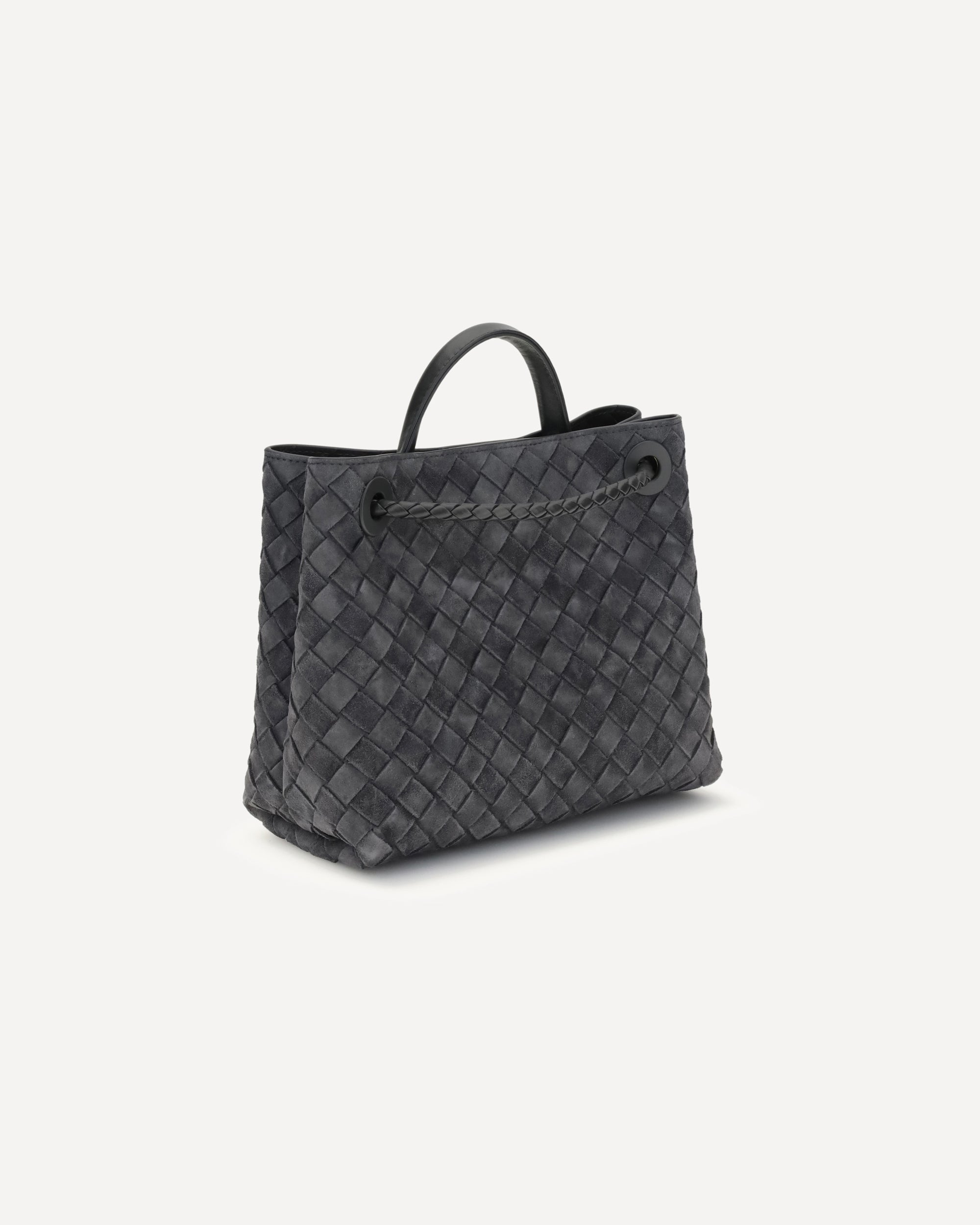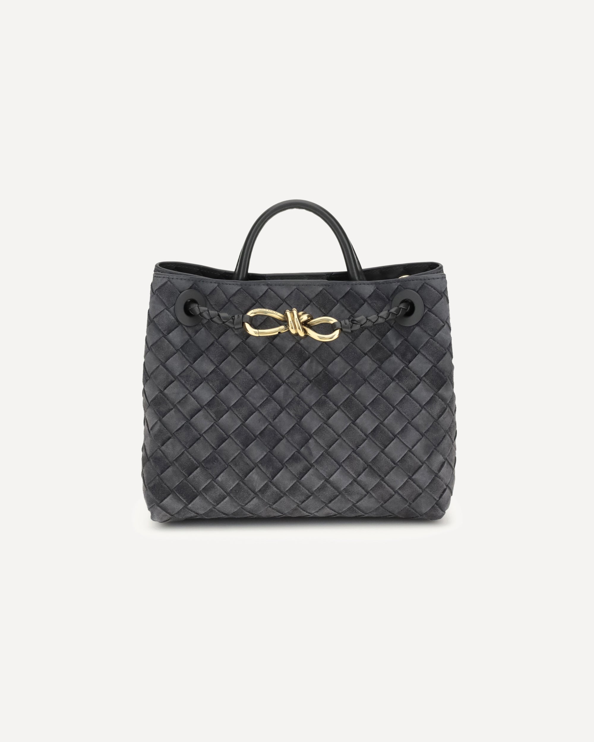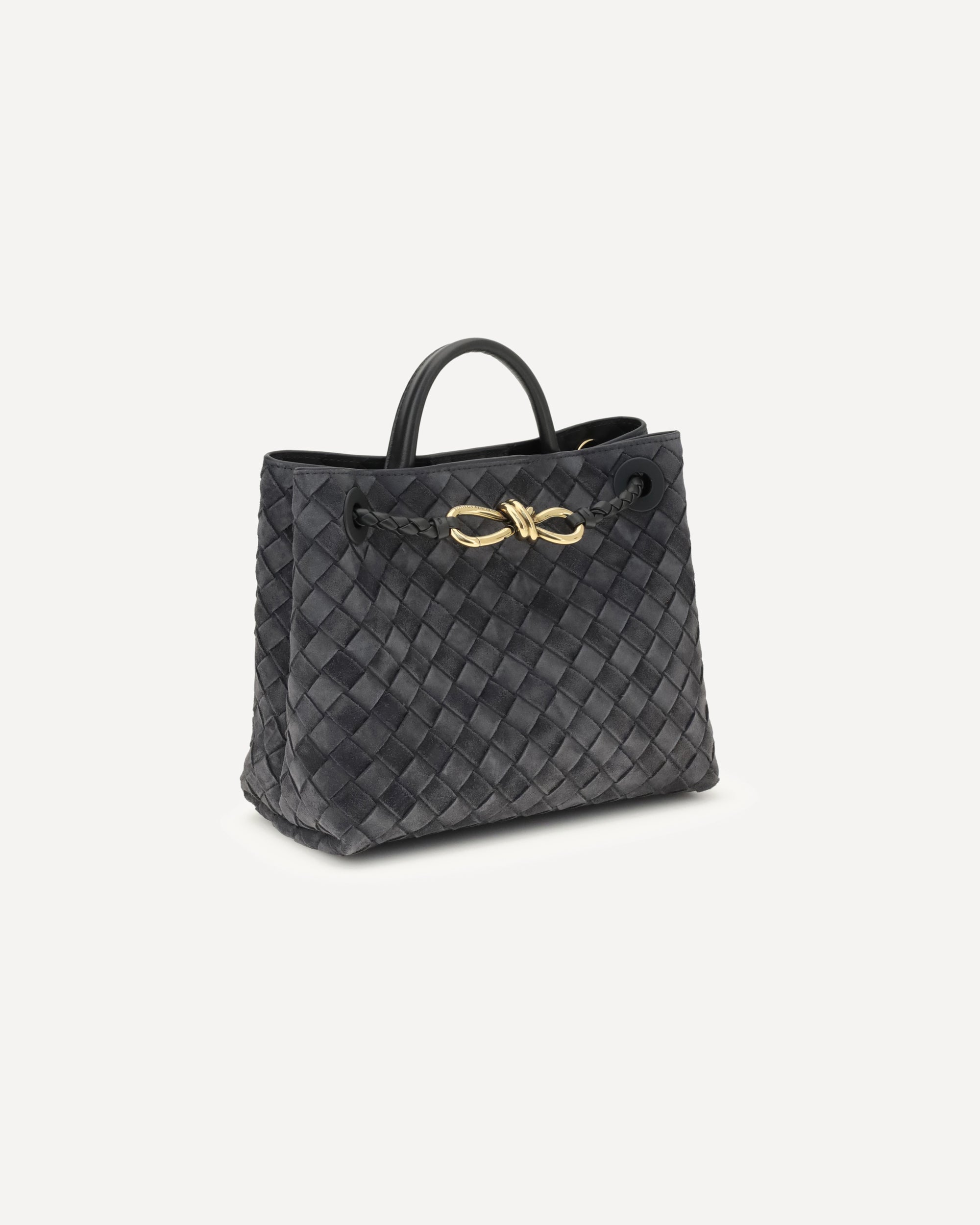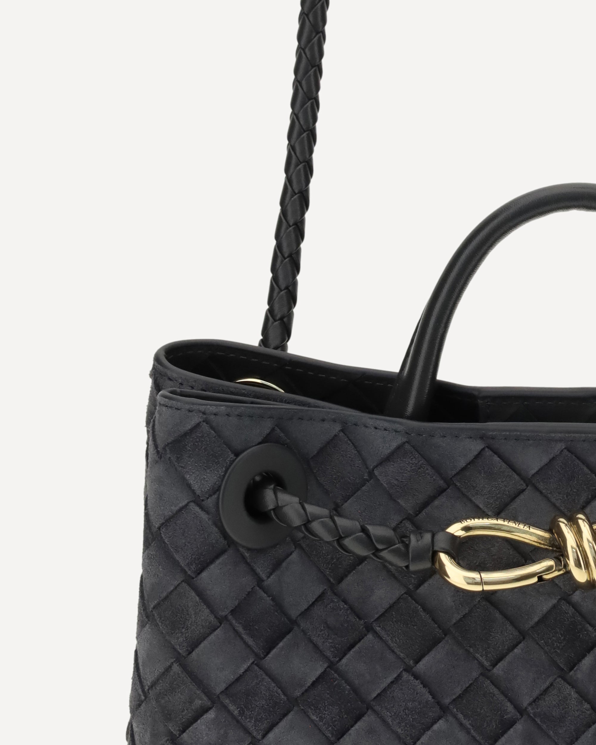 Leather Andiamo Shoulder Bag by Bottega Veneta, suede-effect leather design, brand's iconic woven design, sliding tubular shoulder strap with emblematic Knot detail, tubular top handle, magnetic button closure, single interior compartment.