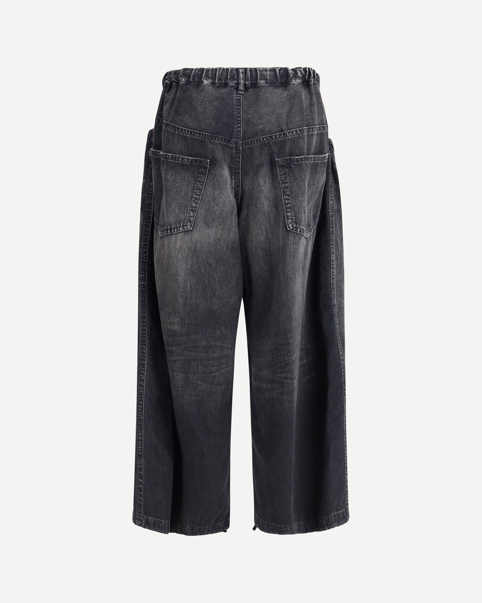 Maison Mihara's cotton Jeans are a modern, comfortable style with a baggy pattern and five-pocket construction. The elasticated waistband with drawstring ensures a comfortable and adjustable fit. The front closure features a zipper and button, adding a practical and stylish touch. An iconic monogram patch is applied to the front, giving the jeans a distinctive and recognizable look. Perfect for those seeking a balance between casual comfort and refined style.