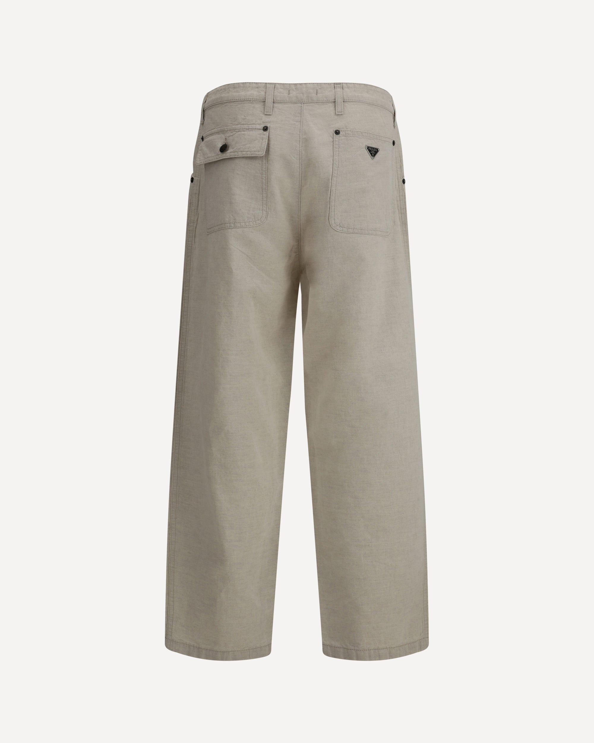 Prada's baggy wide-leg cotton Pants offer a loose, relaxed fit perfect for a casual yet fashionable look. The front closure is button and zipper, while the waistband features belt loops, allowing you to customize the fit. The iconic triangular logo plaque applied on the back adds a distinctive and luxurious touch, characteristic of the brand. A pair of jeans that combine comfort and contemporary style.