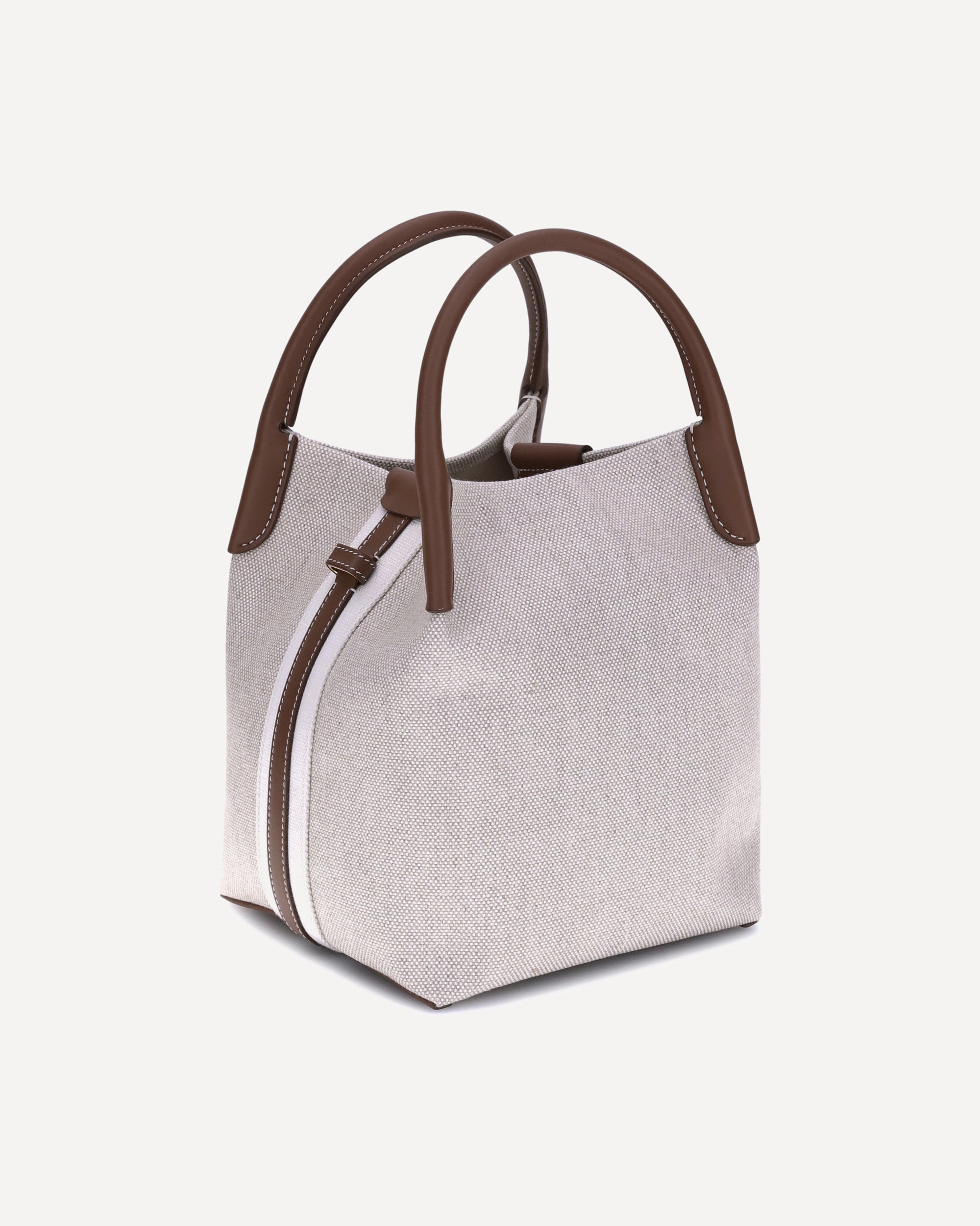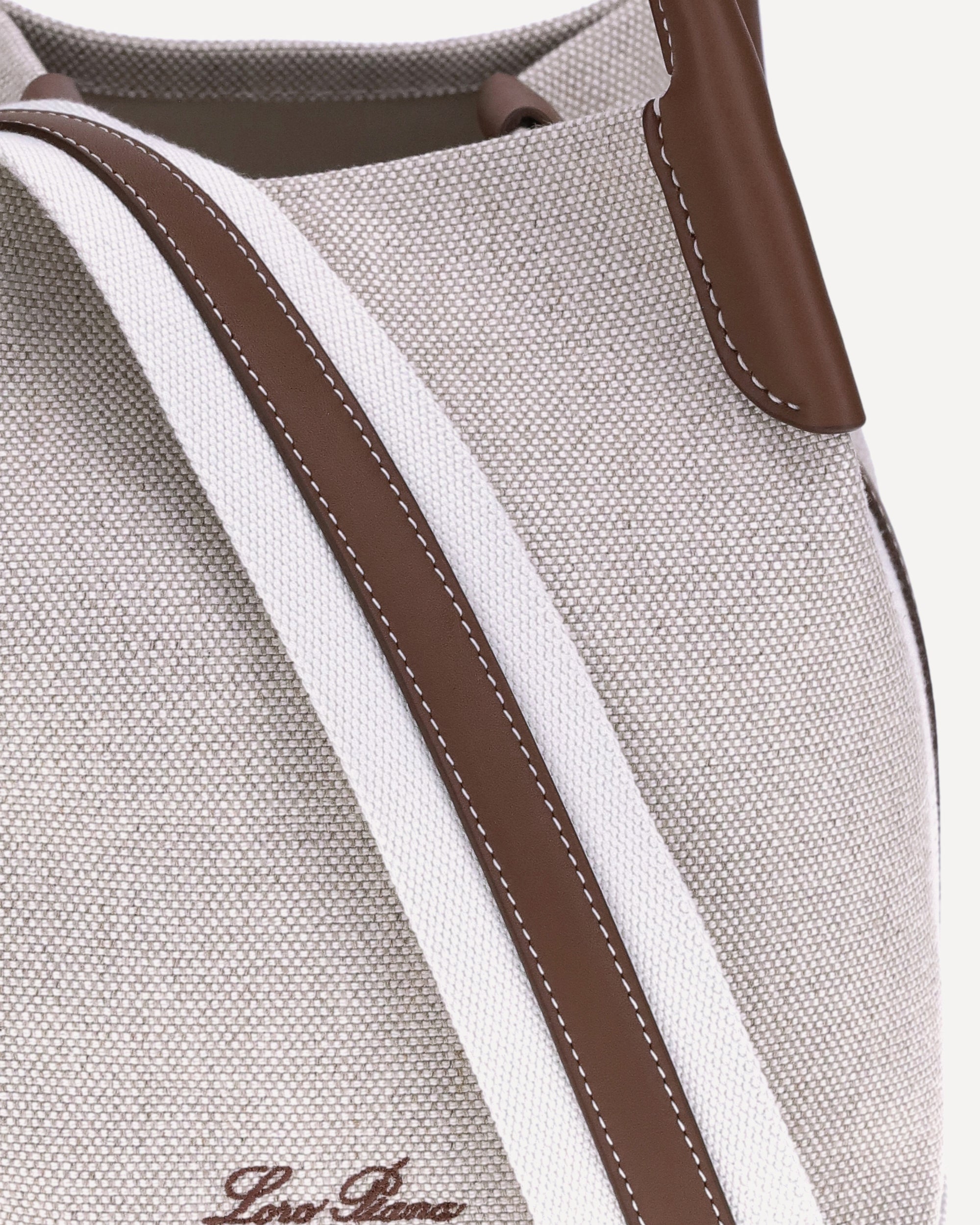 Loro Piana's Bale Small Bucket Bag in grained leather features two upper rigid tubular handles that provide a stable and comfortable grip. The adjustable and removable cotton and leather shoulder strap wraps around the bag creating an elegant loop pattern, adding versatility to the design. The interior metal frog closure provides security, while the removable interior leather pouch, attached with another frog, offers additional practicality. The iconic contrasting press-on monogram on the front lends a distinctive touch, while the interior features a single compartment for simple and functional organization.