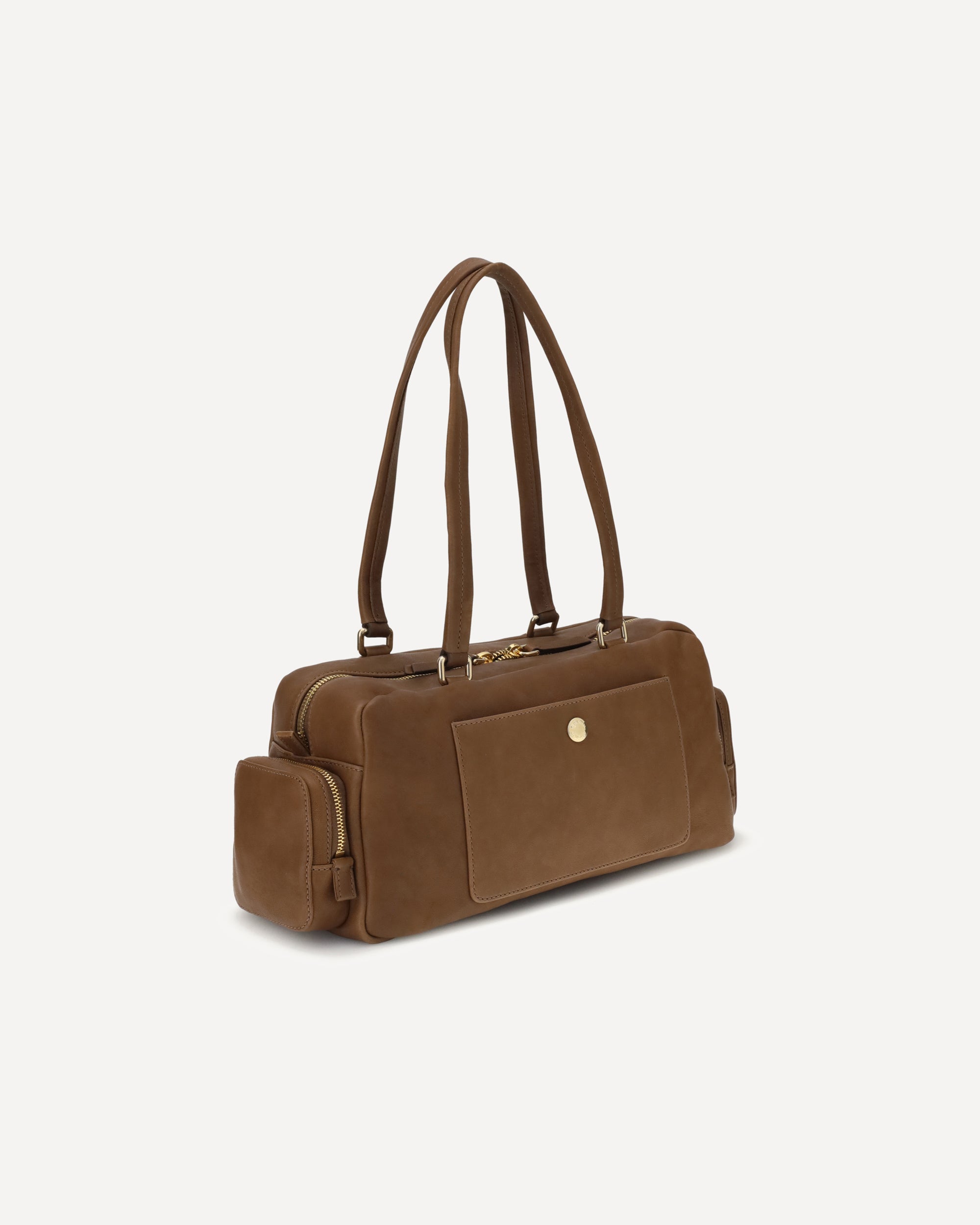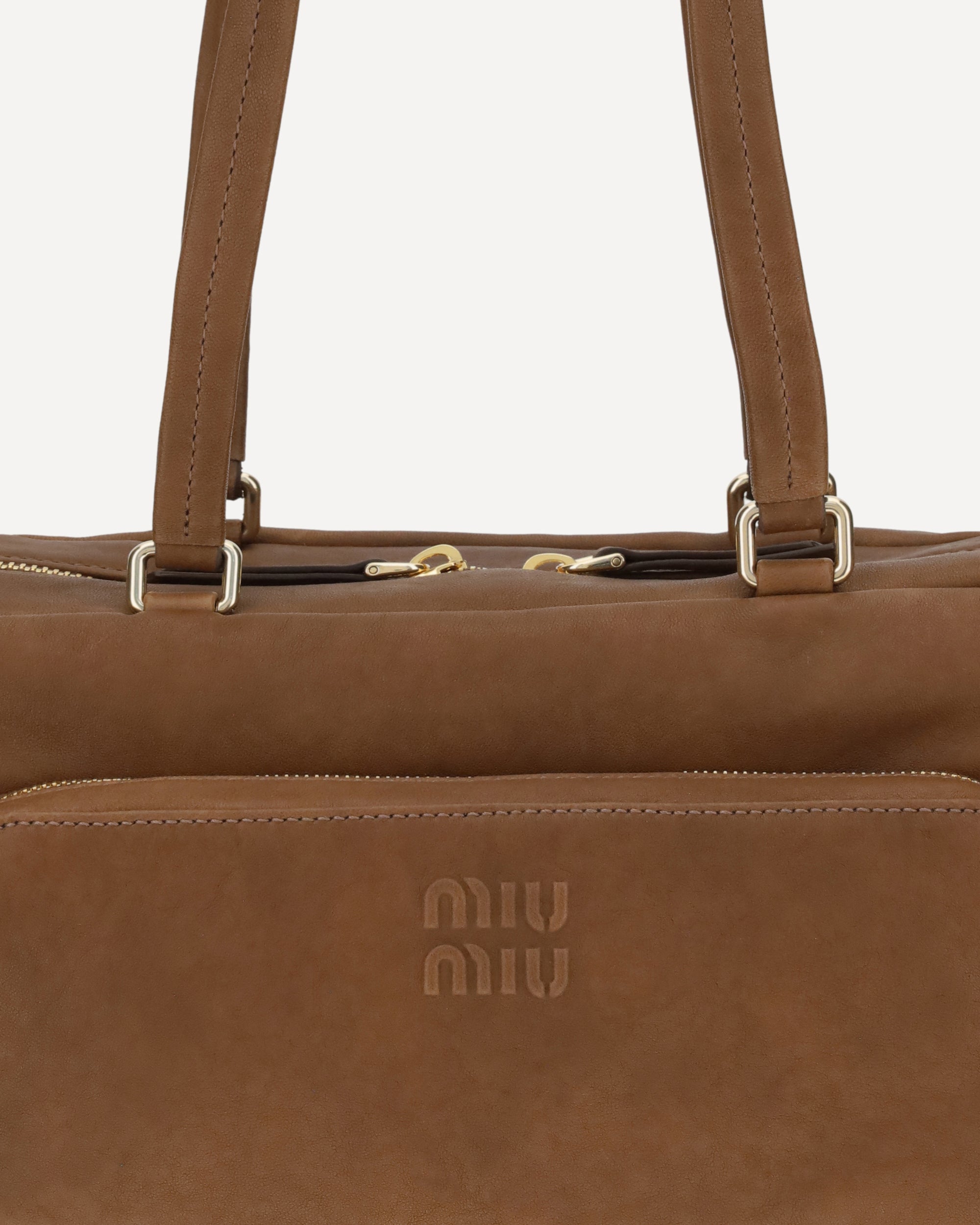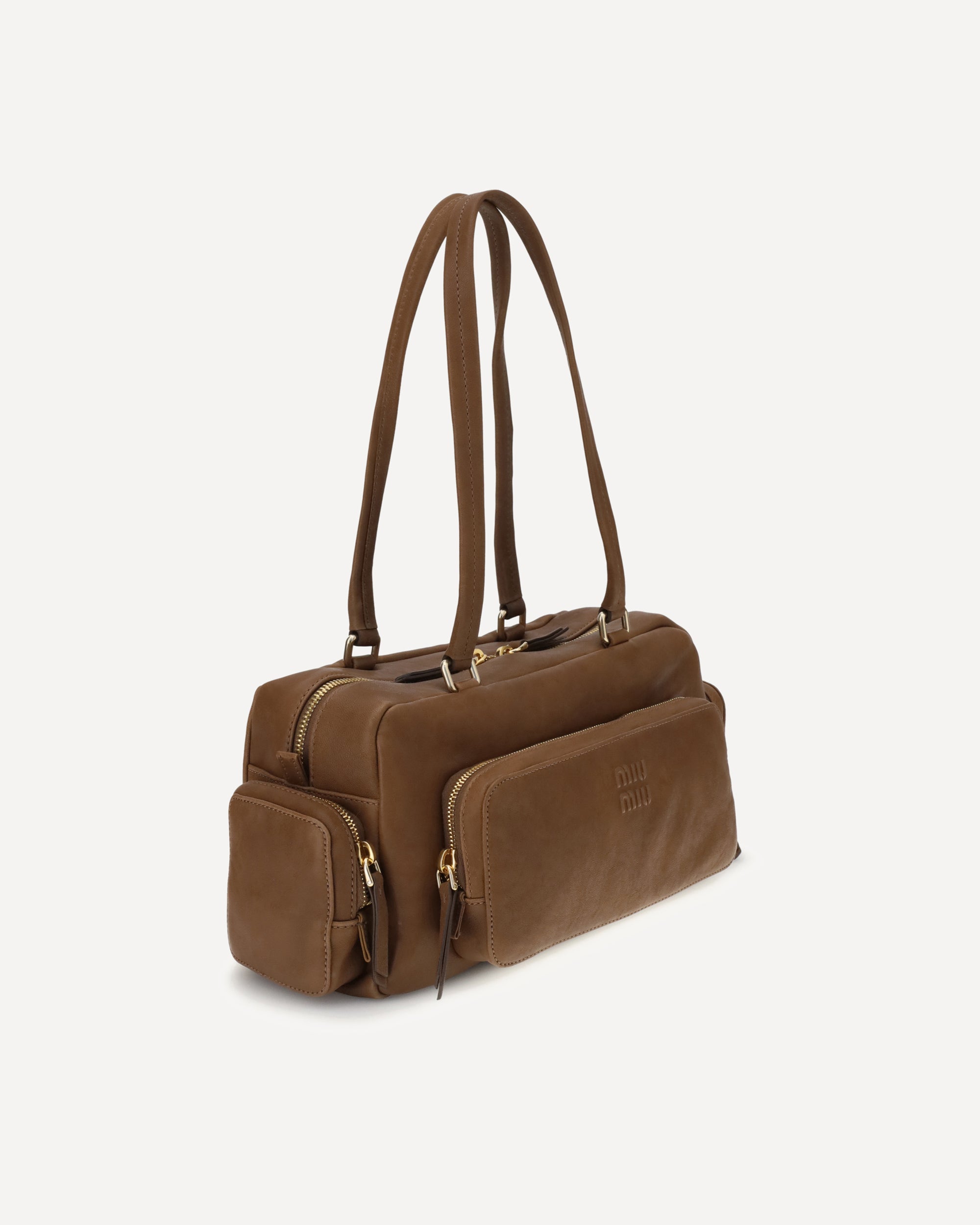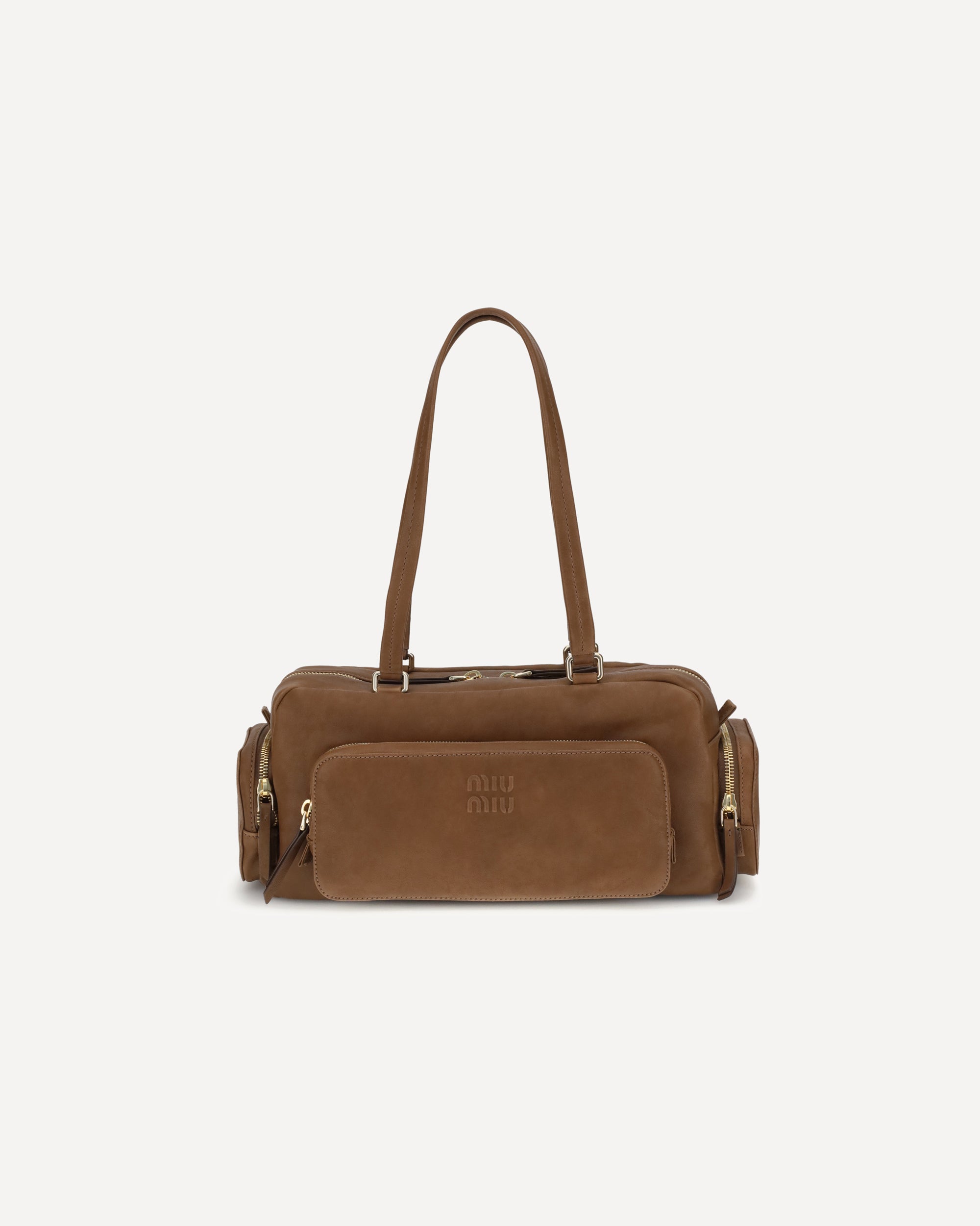 Miu Miu's suede Shoulder Bag combines functionality and retro style in a soft, structured design. Featuring two long handles for convenient portability, it has a zippered front patch pocket and two zippered side pockets, ideal for keeping everything tidy. The embossed logo on the front adds a distinctive touch, while the zipper closure provides security and convenience. A versatile accessory perfect for everyday use with a touch of vintage elegance.