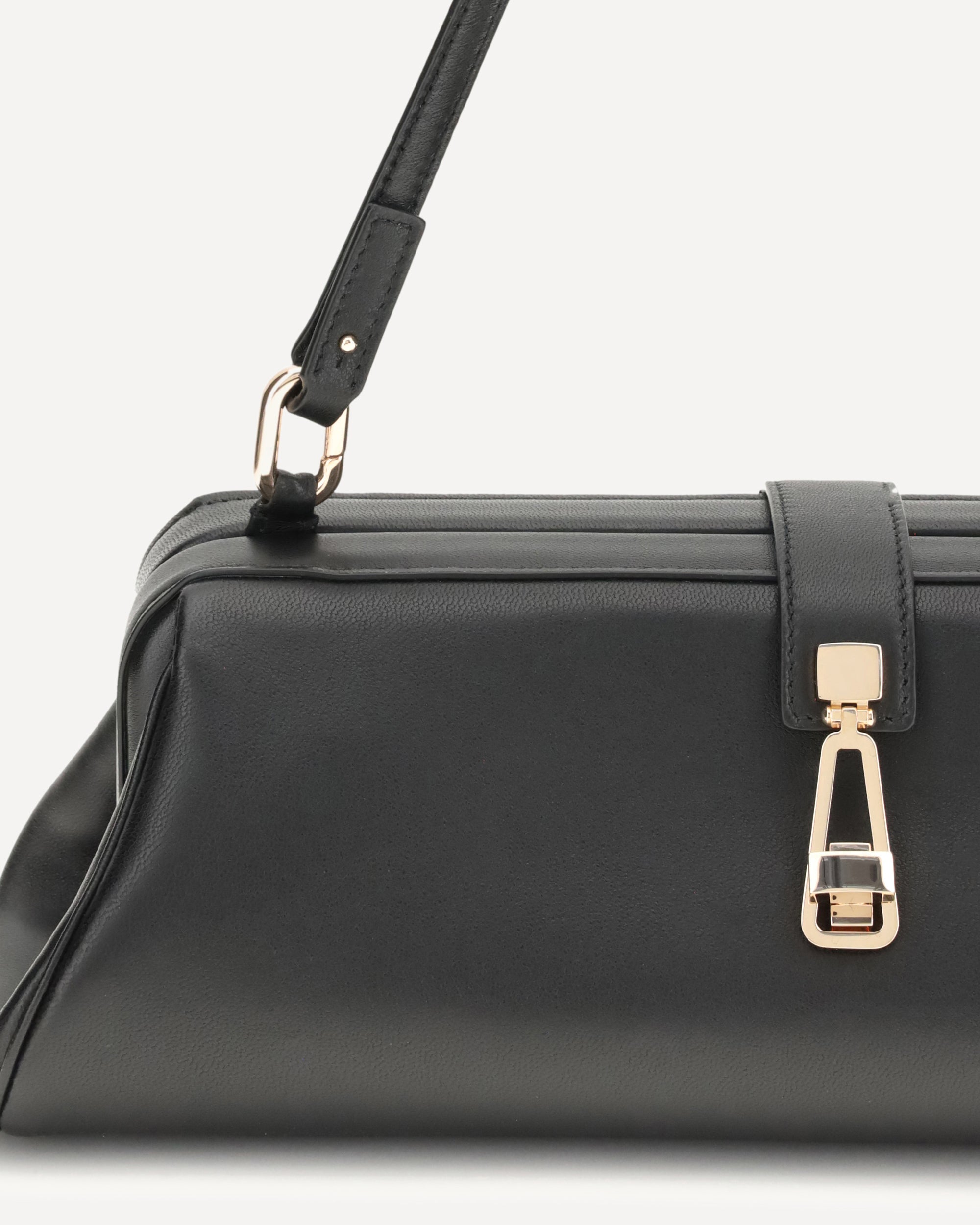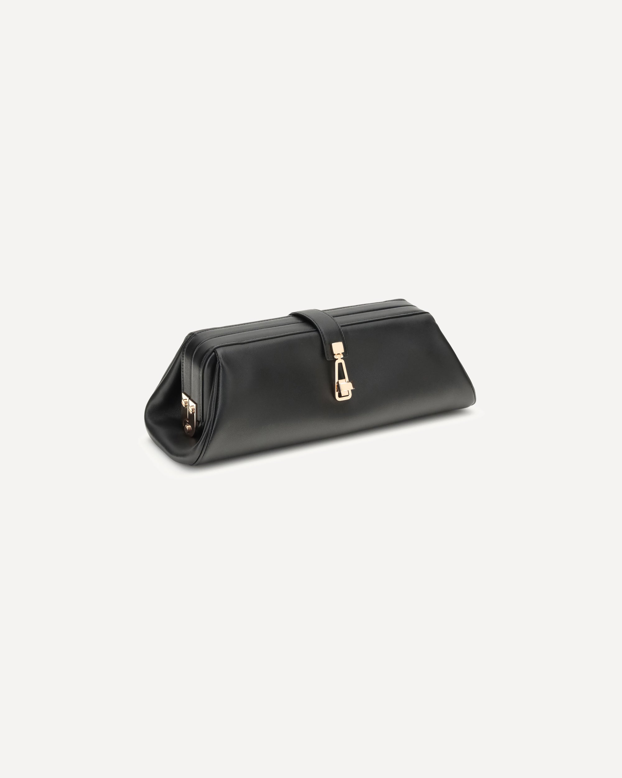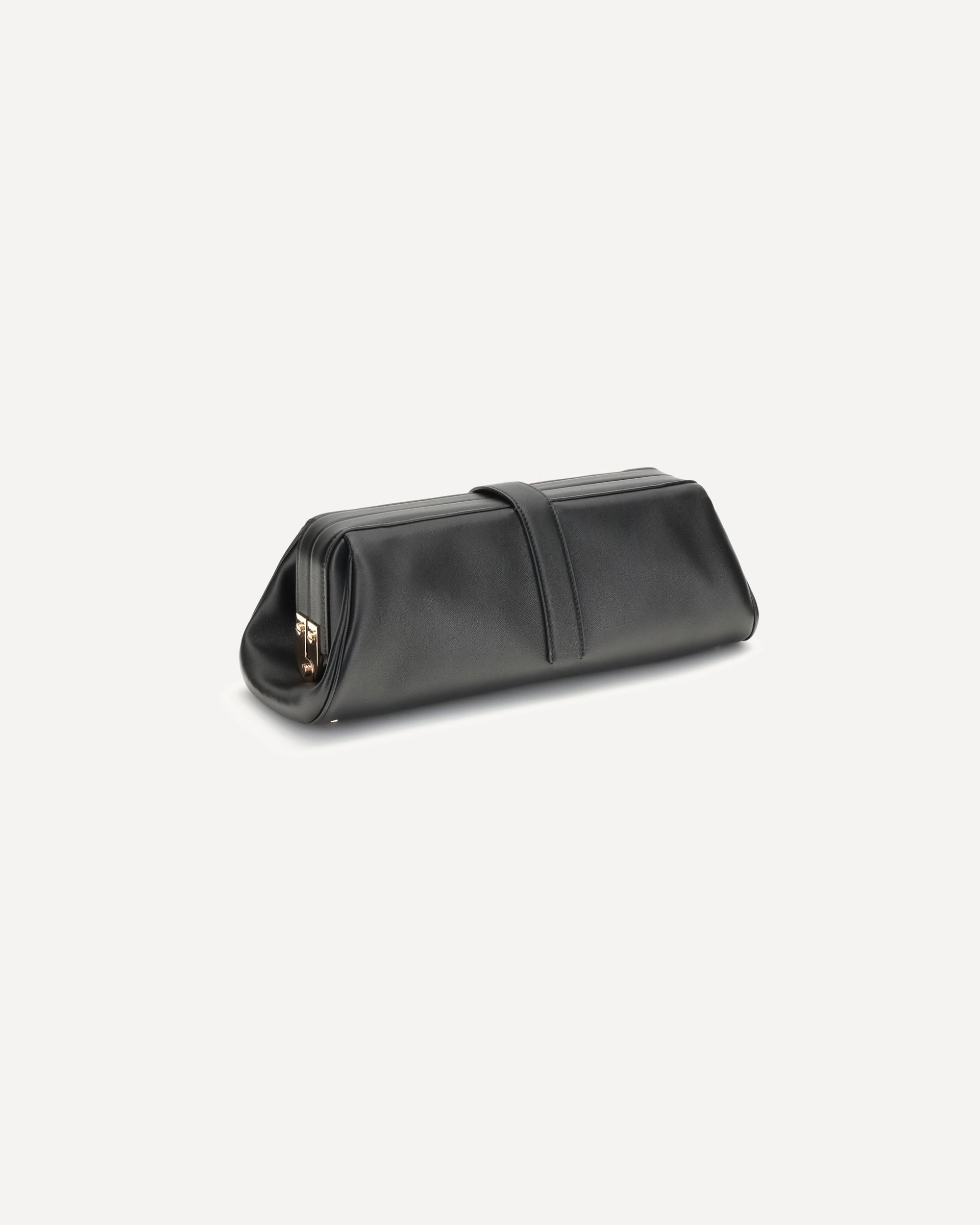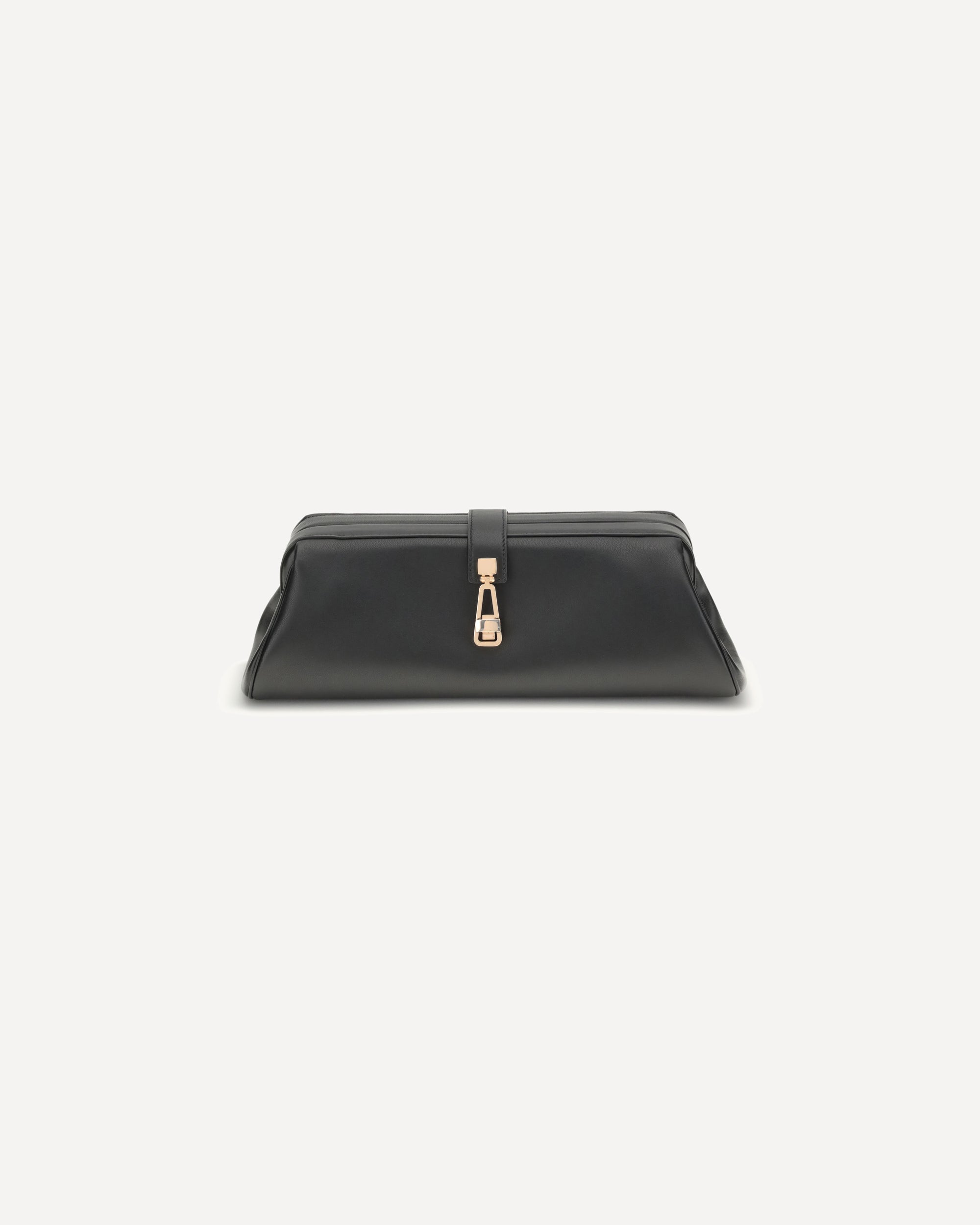 The Paola Clutch by Gabriela Hearst, crafted from smooth Italian leather, features a structured baguette silhouette softened by gentle curves and a distinctive metal clasp. Designed for versatility, it can be carried by hand or worn over the shoulder.
