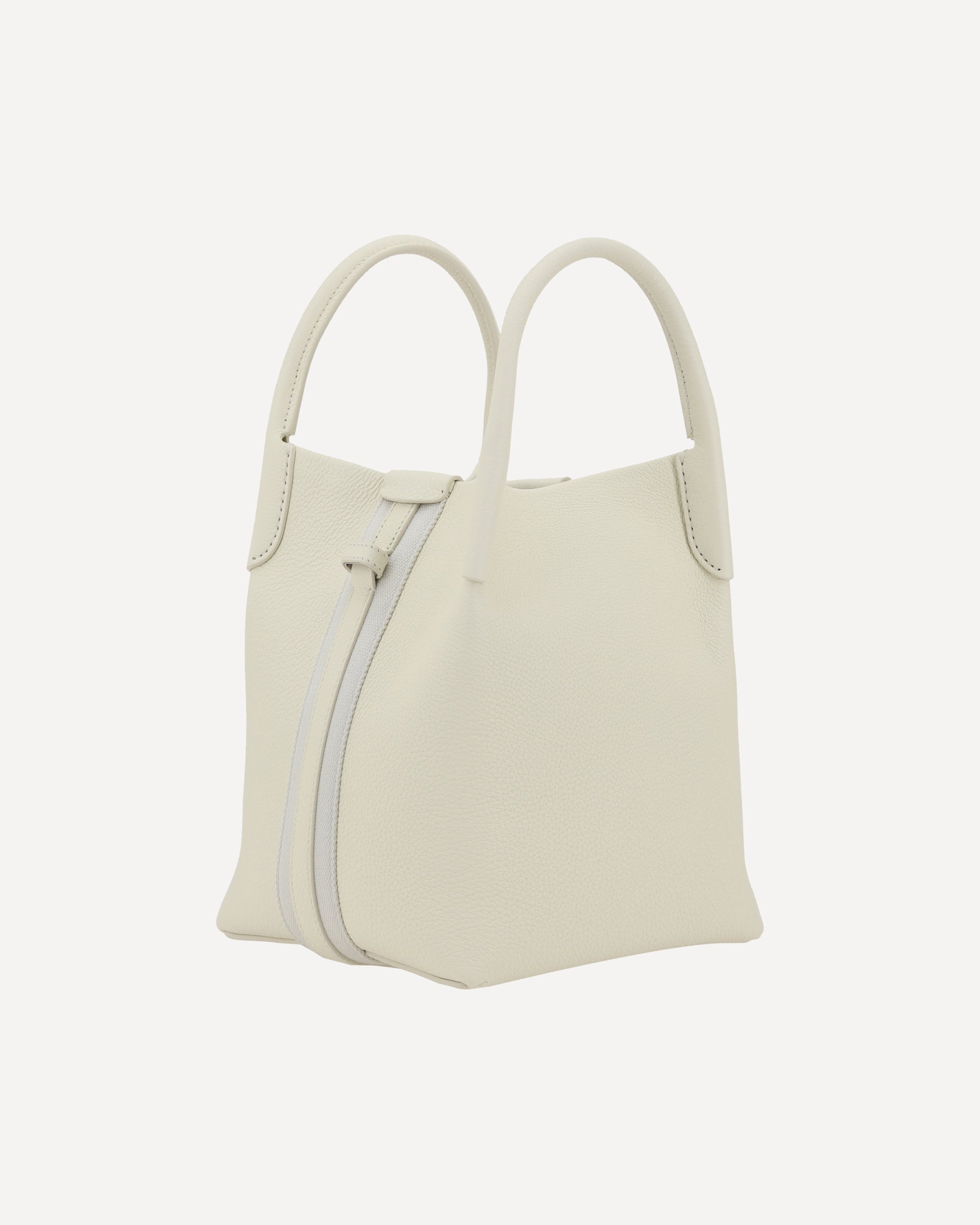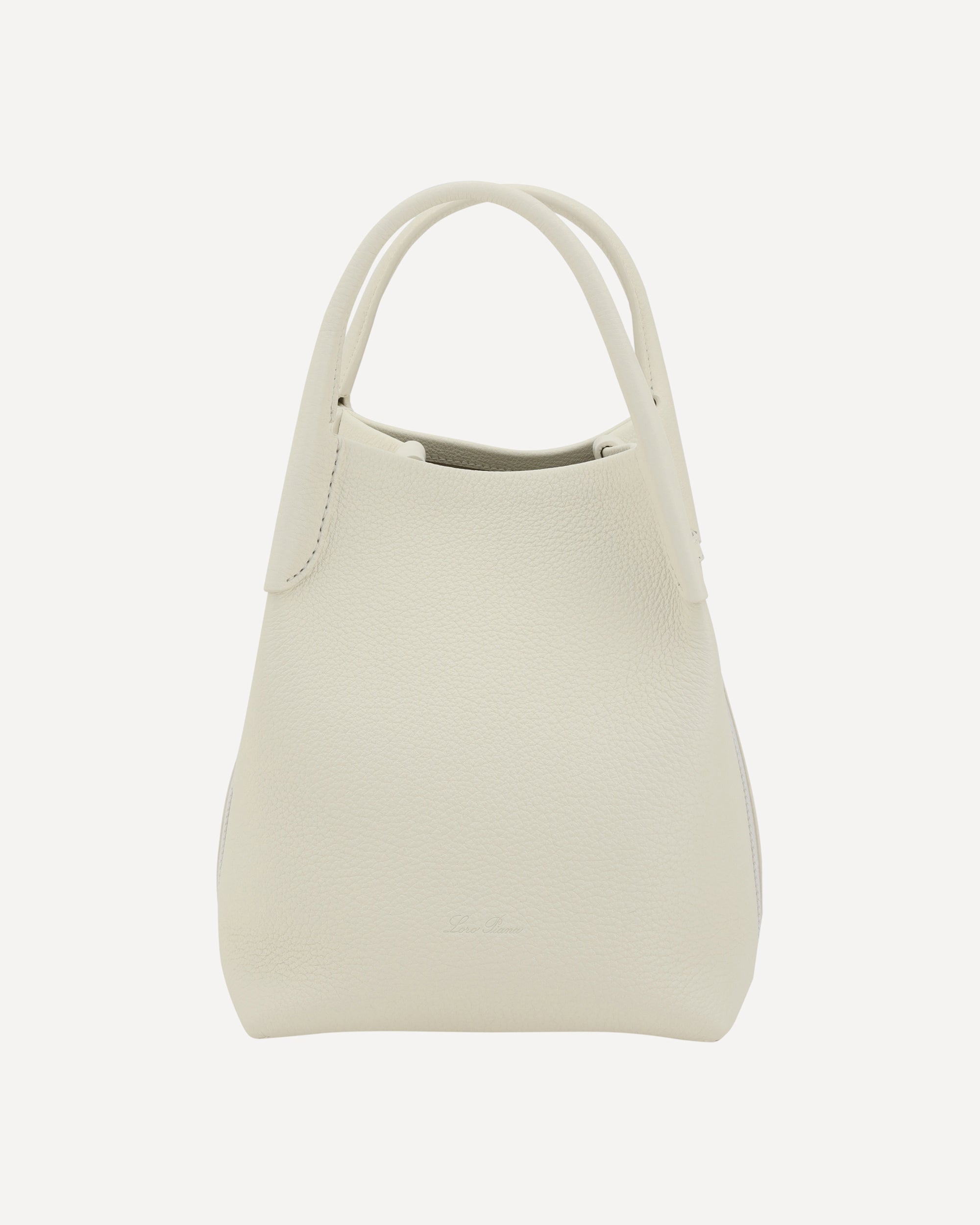 Loro Piana's Bale small Bucket Bag in grained leather features two upper rigid tubular handles that provide a stable and comfortable grip. The adjustable and removable cotton and leather shoulder strap wraps around the bag creating an elegant loop pattern, adding versatility to the design. The interior metal frog closure provides security, while the removable interior leather pouch, attached with another frog, offers additional practicality. The iconic contrasting press-on monogram on the front lends a distinctive touch, while the interior features a single compartment for simple and functional organization.