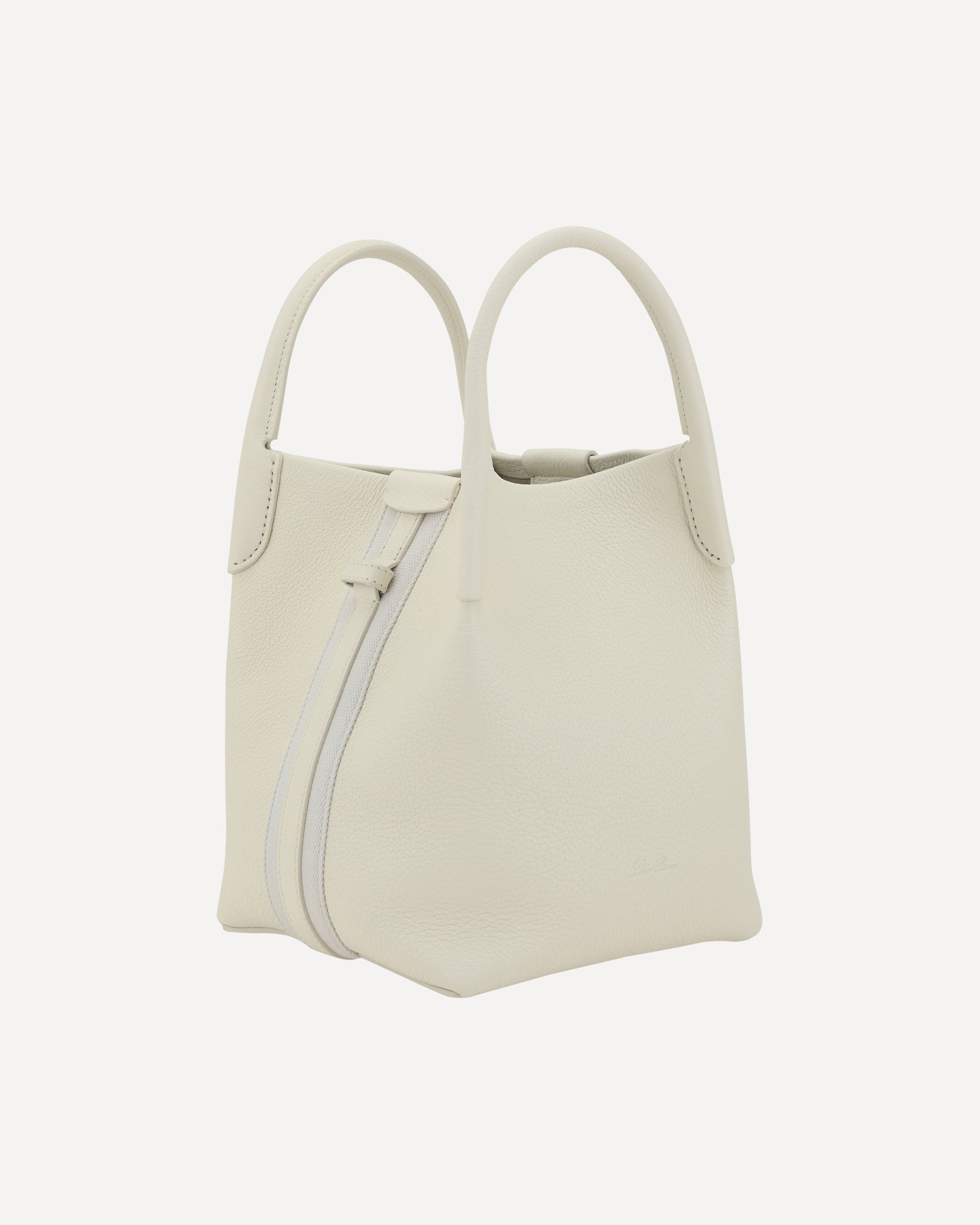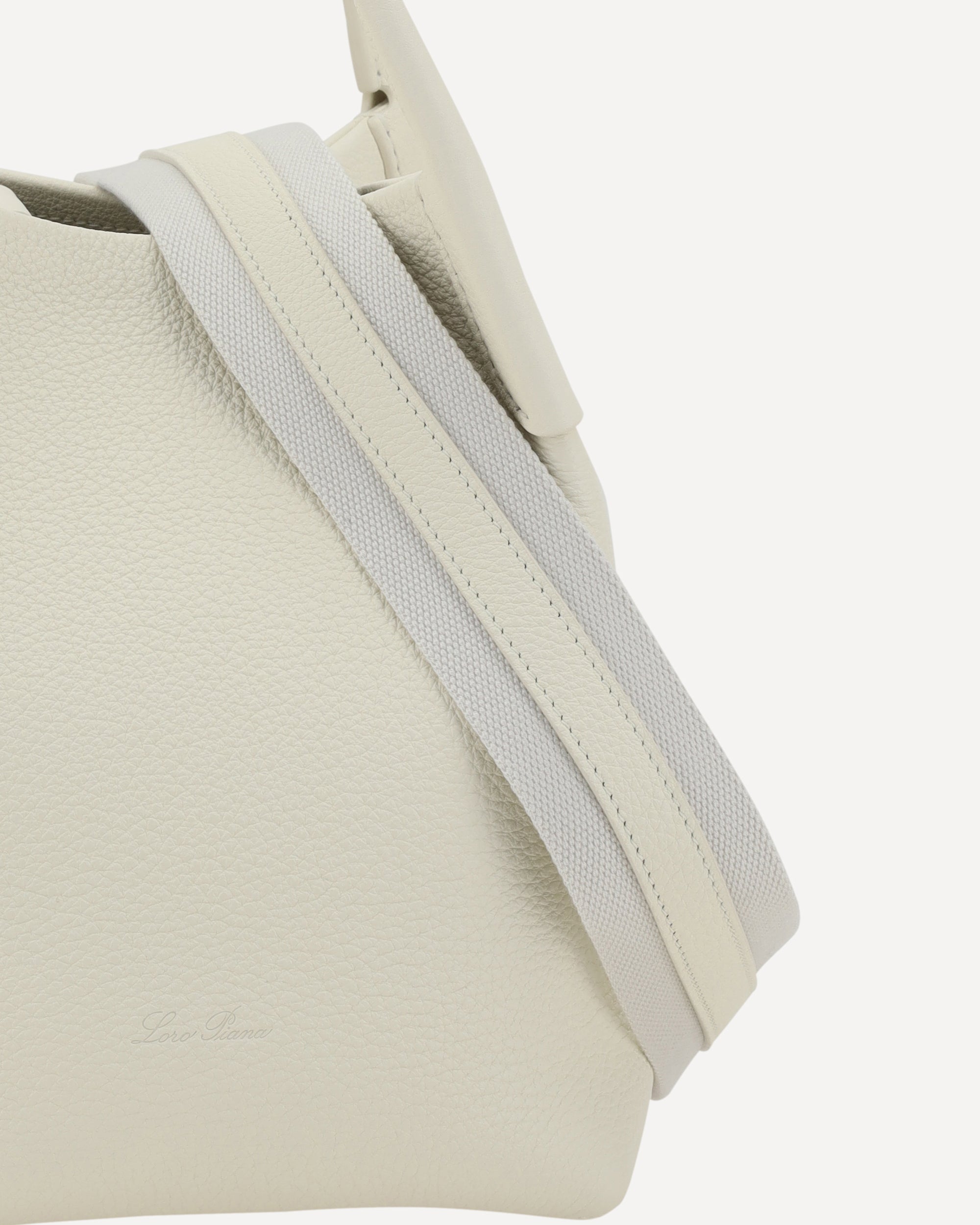 Loro Piana's Bale small Bucket Bag in grained leather features two upper rigid tubular handles that provide a stable and comfortable grip. The adjustable and removable cotton and leather shoulder strap wraps around the bag creating an elegant loop pattern, adding versatility to the design. The interior metal frog closure provides security, while the removable interior leather pouch, attached with another frog, offers additional practicality. The iconic contrasting press-on monogram on the front lends a distinctive touch, while the interior features a single compartment for simple and functional organization.