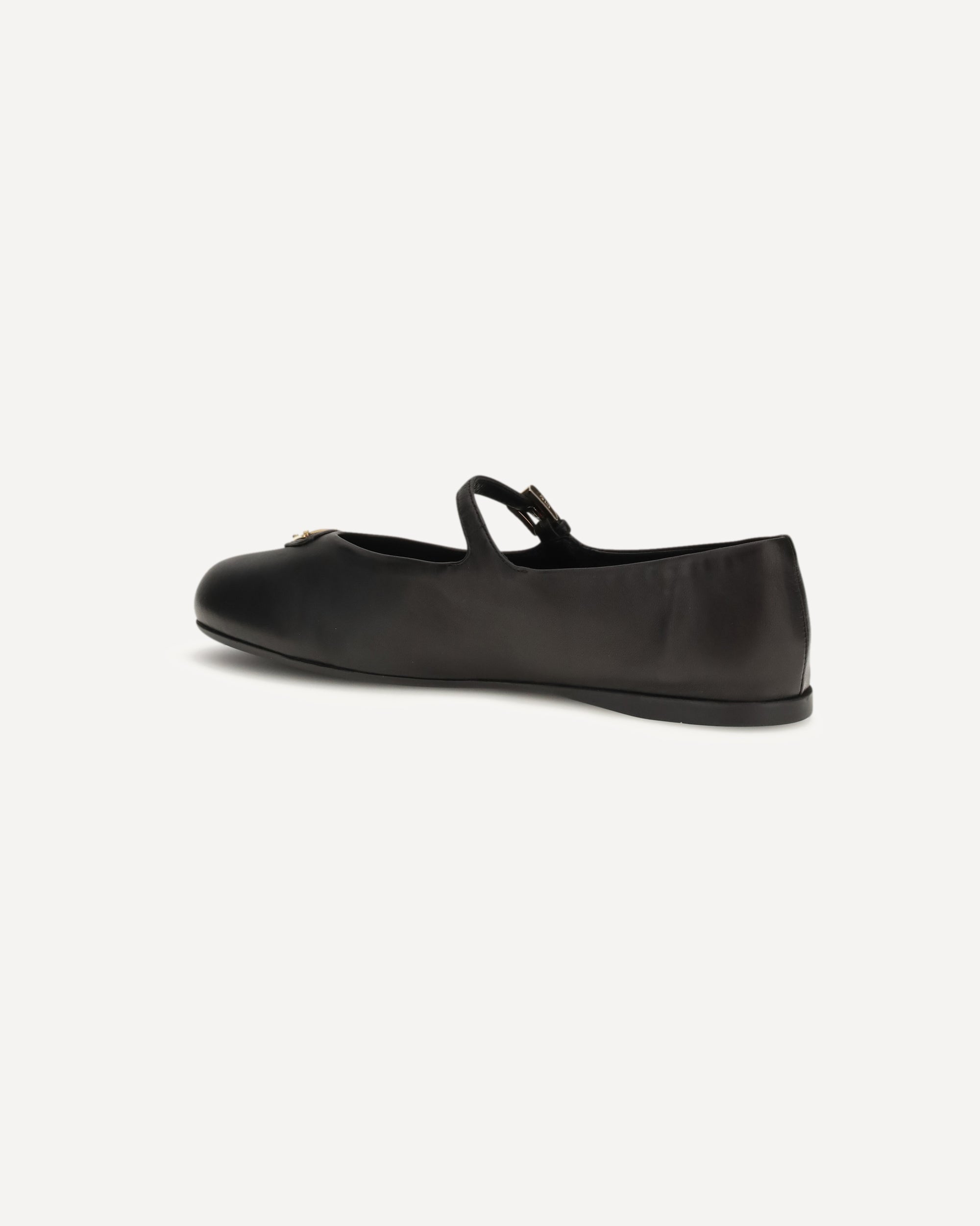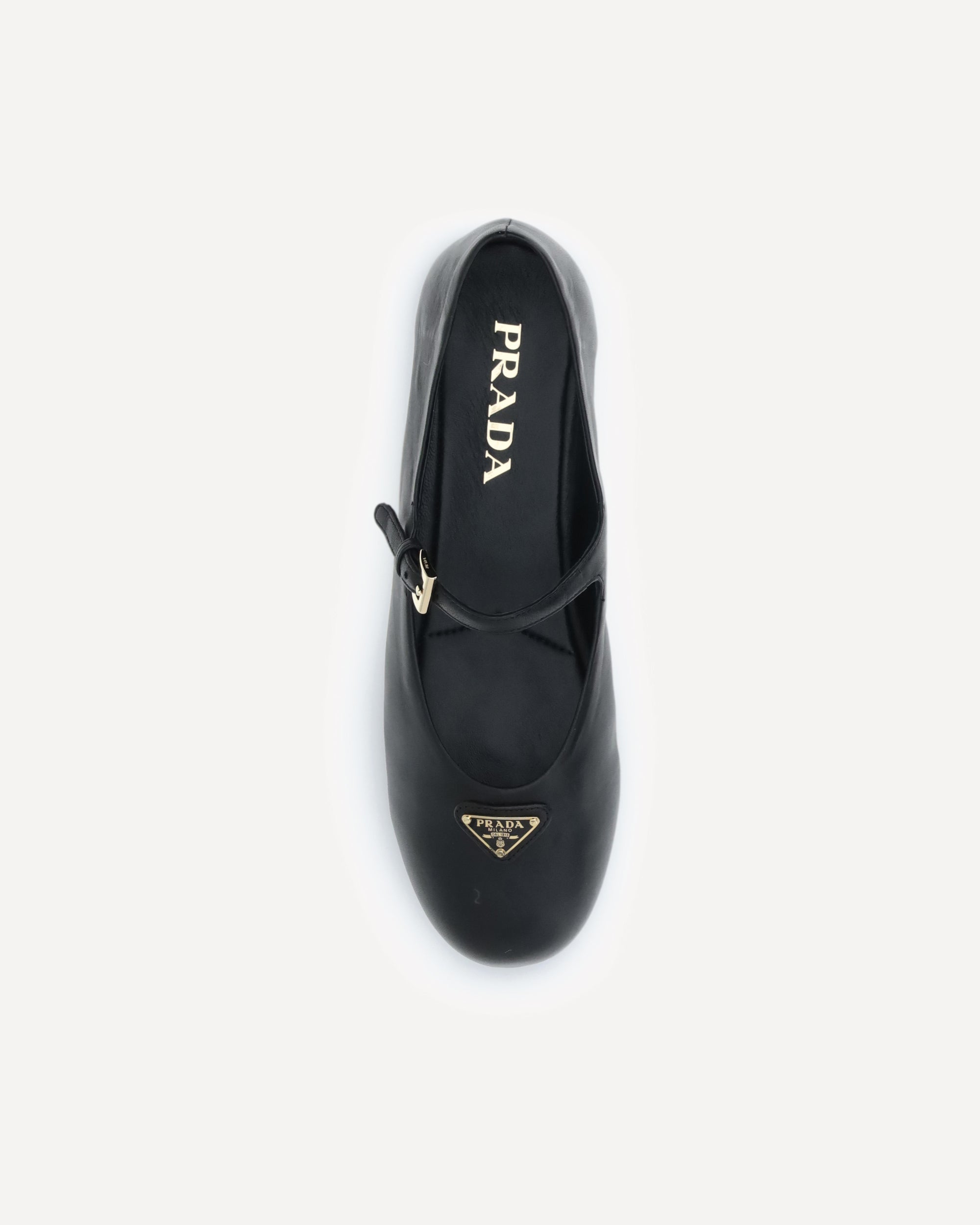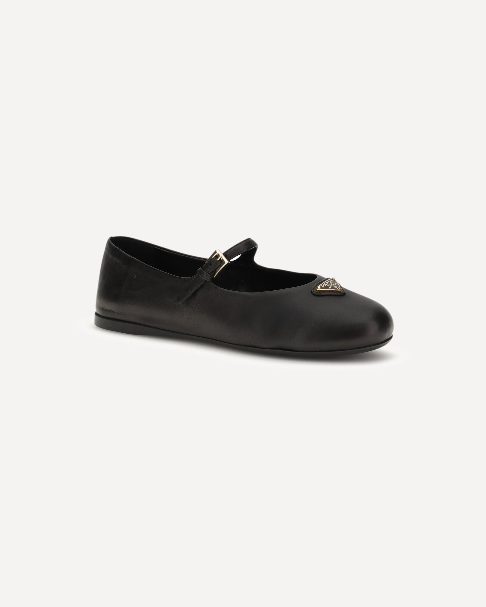 The nappa leather Ballerinas by Prada embody an elegant and feminine allure, defined by a soft nappa silhouette that enhances their refined character. Classic lines and sophisticated details shape the design, featuring a rounded toe and a lightweight rubber sole. The enamelled metal triangle logo and the signature metal buckle on the upper enrich the style with iconic Prada identity, while the 5 mm monobloc rubber sole with embossed logo completes the look with subtle contemporary appeal.