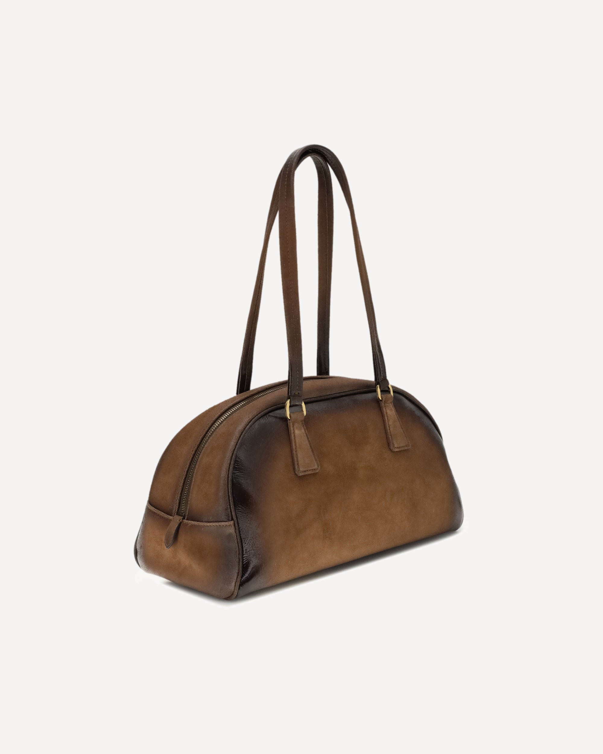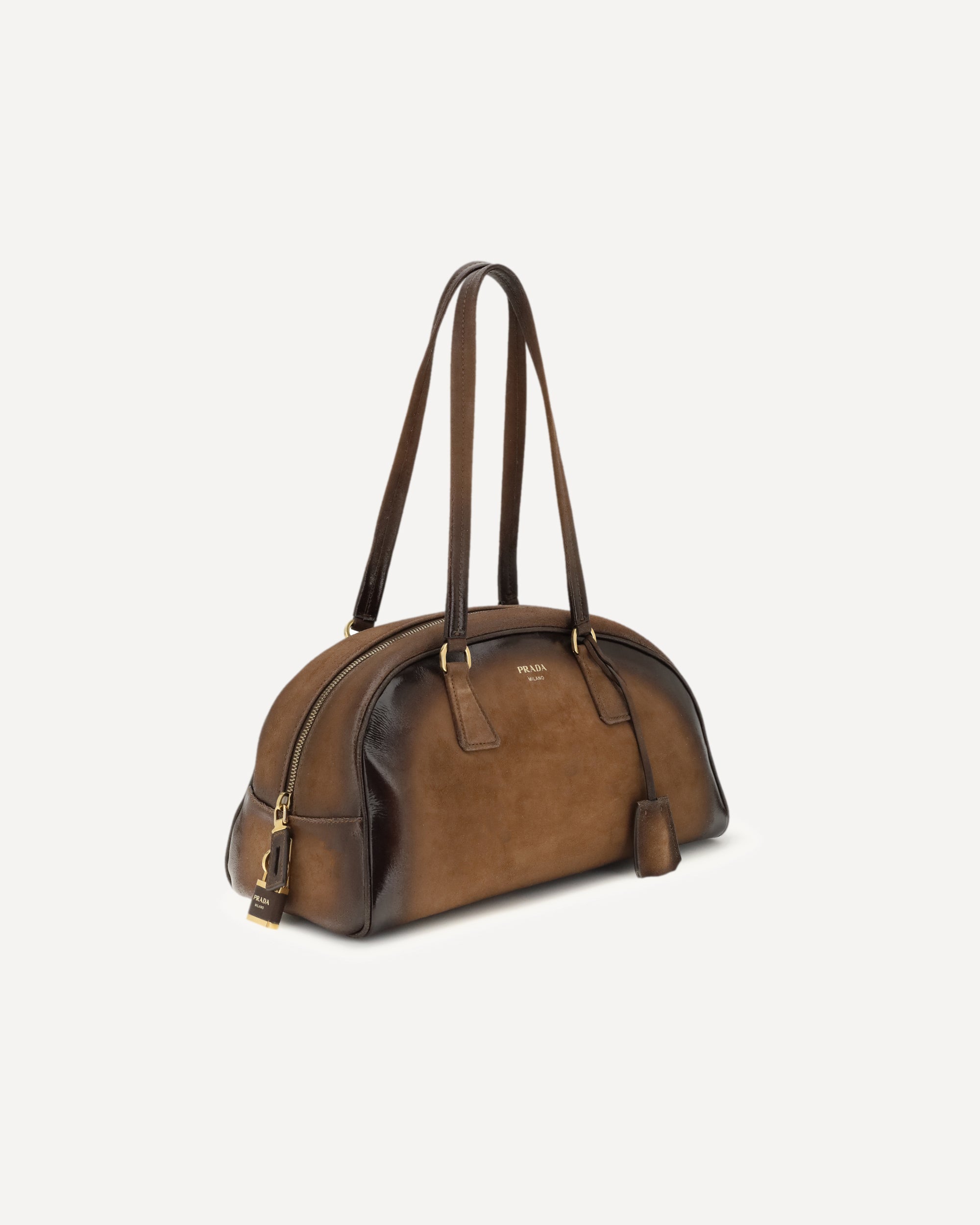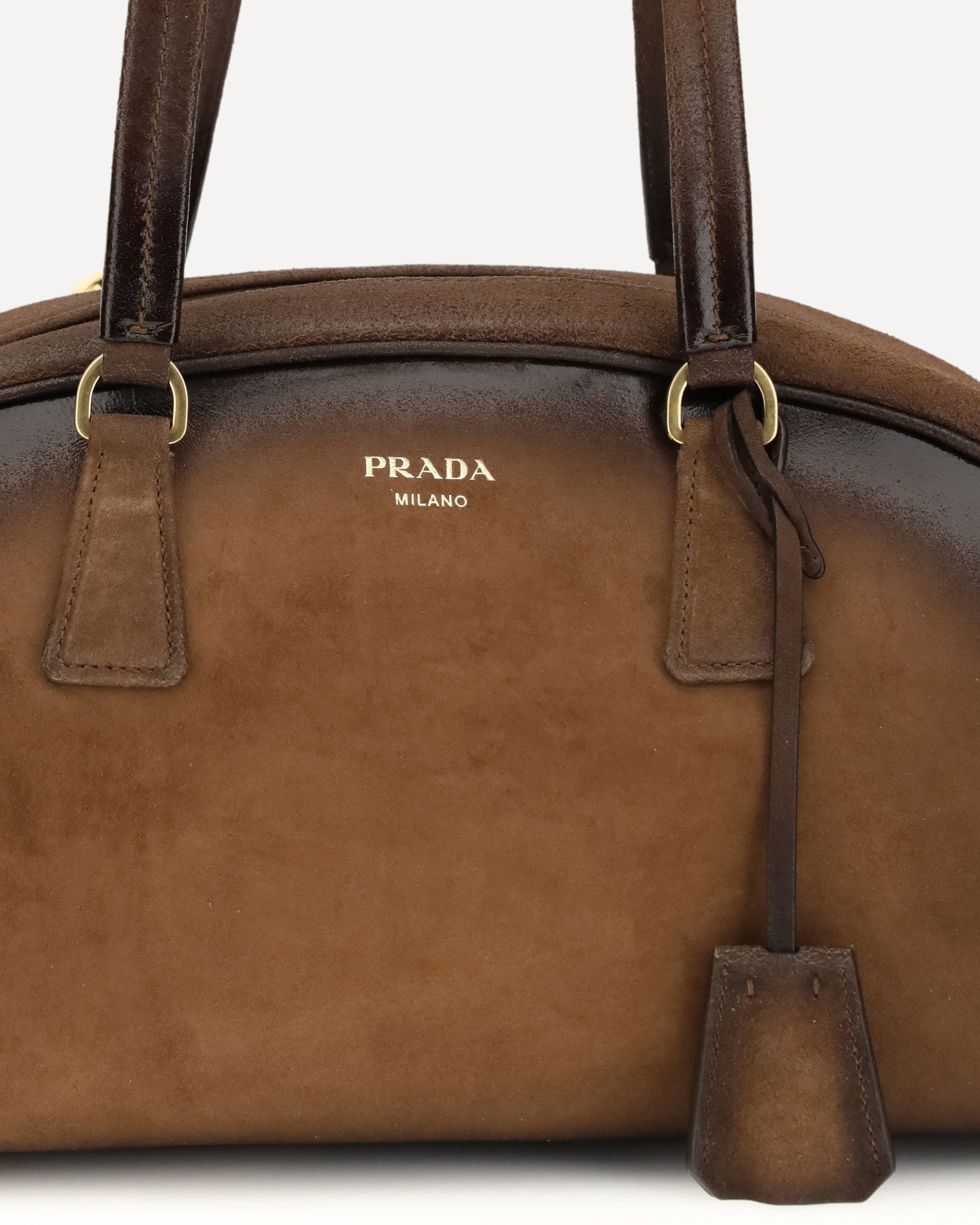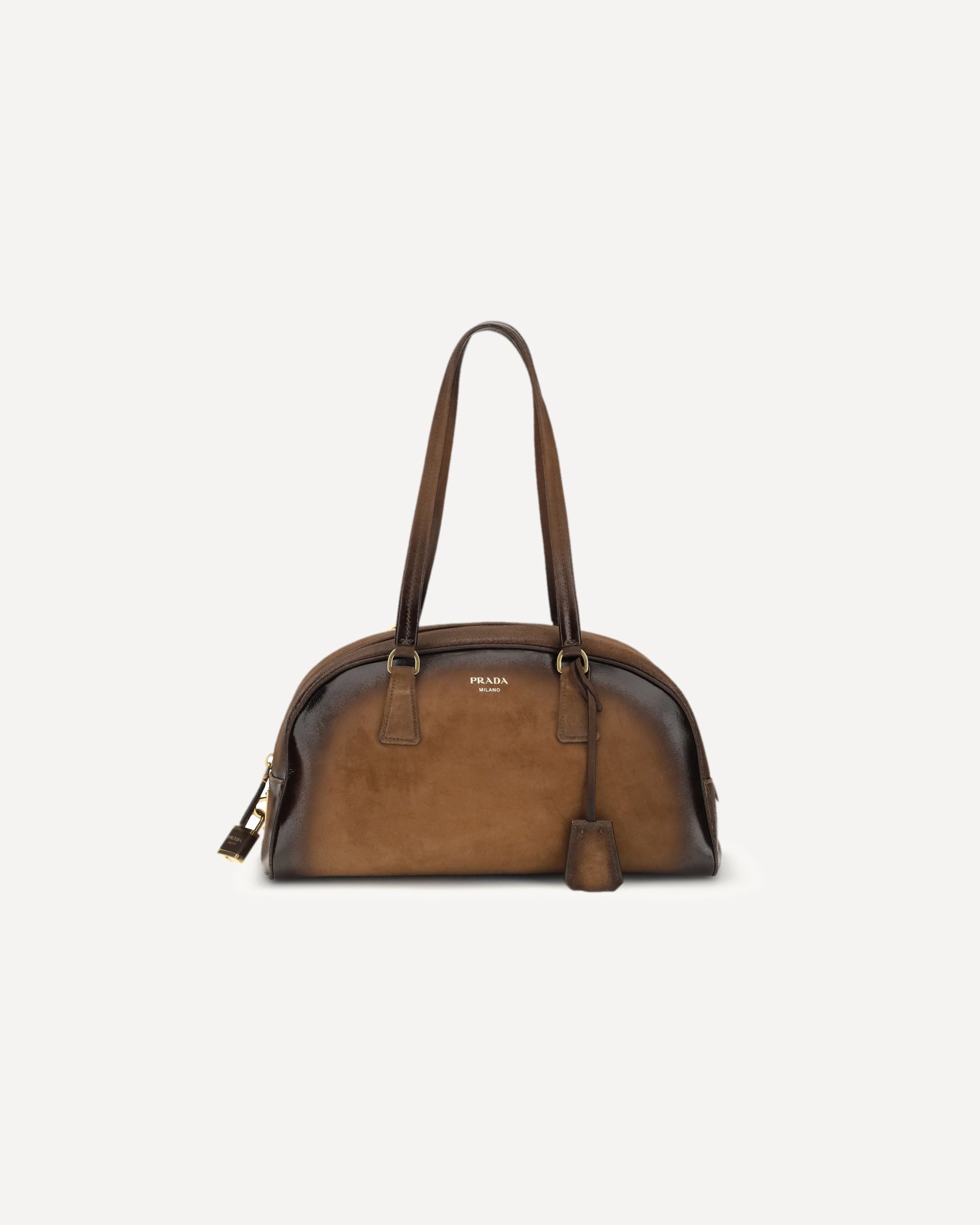 Satchel Shoulder Bag by Prada is a sleek, structured design crafted from worn-effect suede that lends a sophisticated, contemporary touch. Featuring a logo on the front, it has two long handles for comfortable shoulder carry. The zipper closure is embellished with a logoed padlock, a distinctive detail of the brand. Completing the design are the feet at the base, which protect the bag and preserve its shape. A refined and functional accessory, ideal for everyday use with style.